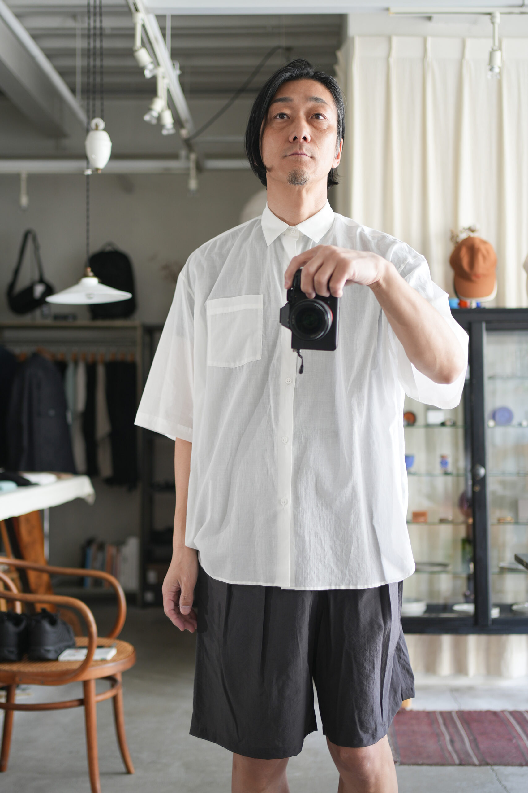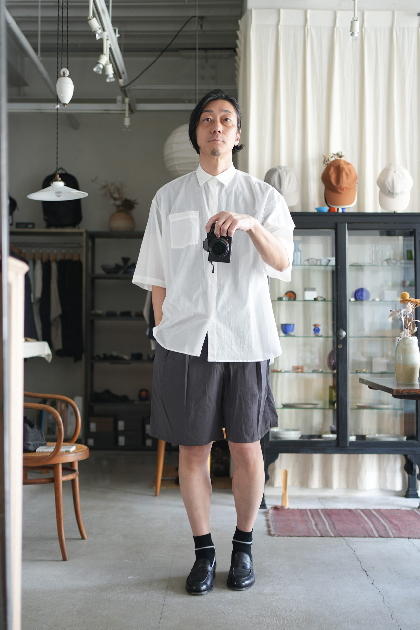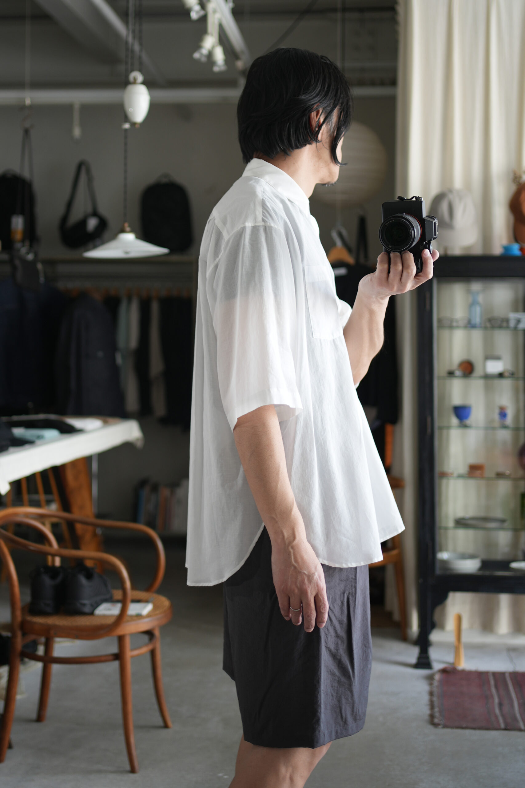 Blanc YMの定番のワイドシャツをハーフスリーブにてリリース。ゆったりとしたオーバーサイジングなシルエットを生かし袖筒幅も広く、肘丈程のゆったりとしたデザイン。また後ろ身頃は通常よりもやや大きめにとり、横、後ろ姿はシャツの範疇ながらライトアウターの 様な雰囲気もございます。静岡の遠州地方で織られた100%コットン生地を使用。糸はスーピマ超長綿。ほんの僅かに毛羽を残した柔らかな質感とスーピマコットン特有の光沢があり、光を通す様な適度な透け感があります。洗い晒しで着用しても馴染む程良いシワ感で着用できる素材です。またとても計量な素材でSSシーズンのレイヤードとしてはストレスフリーです。
