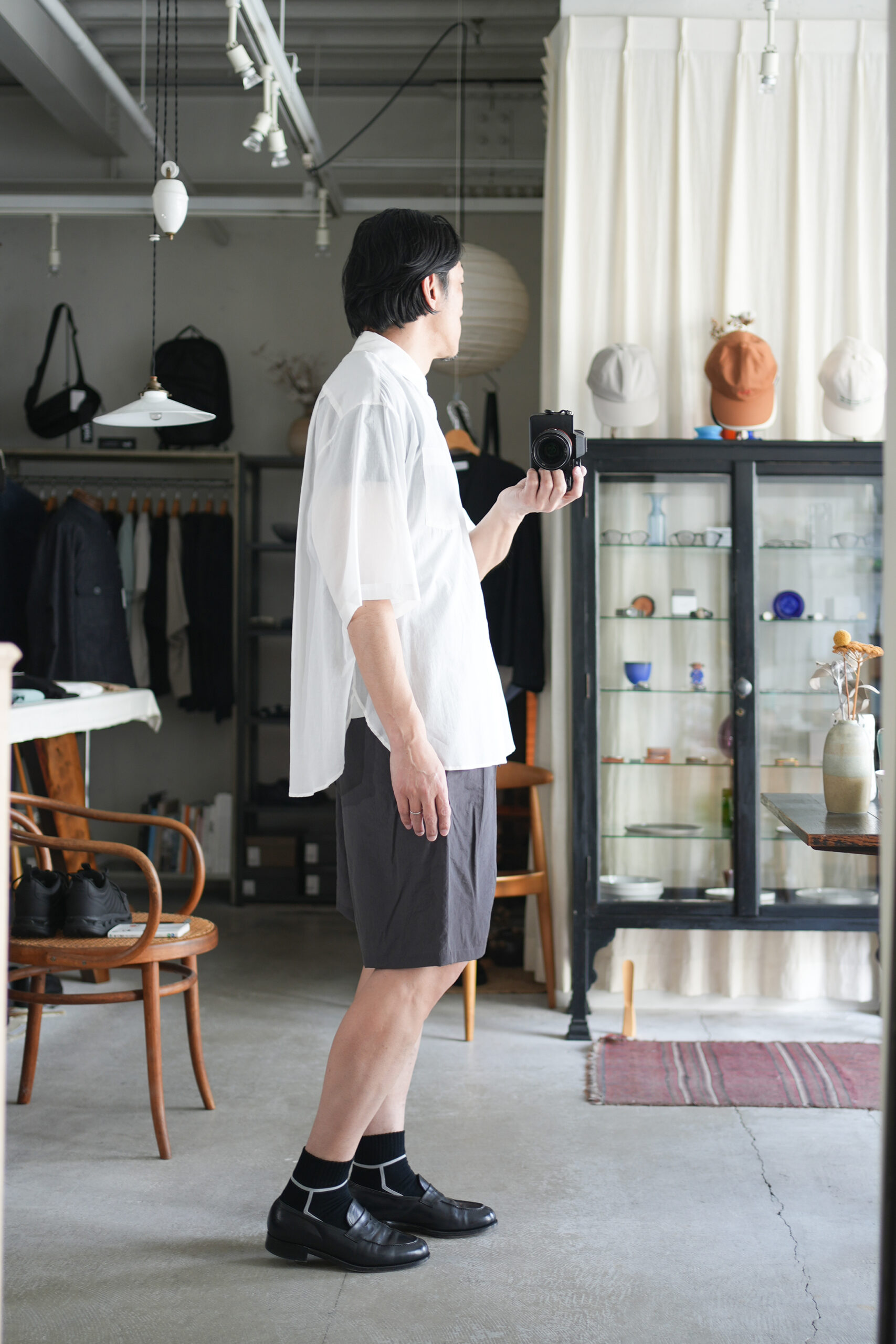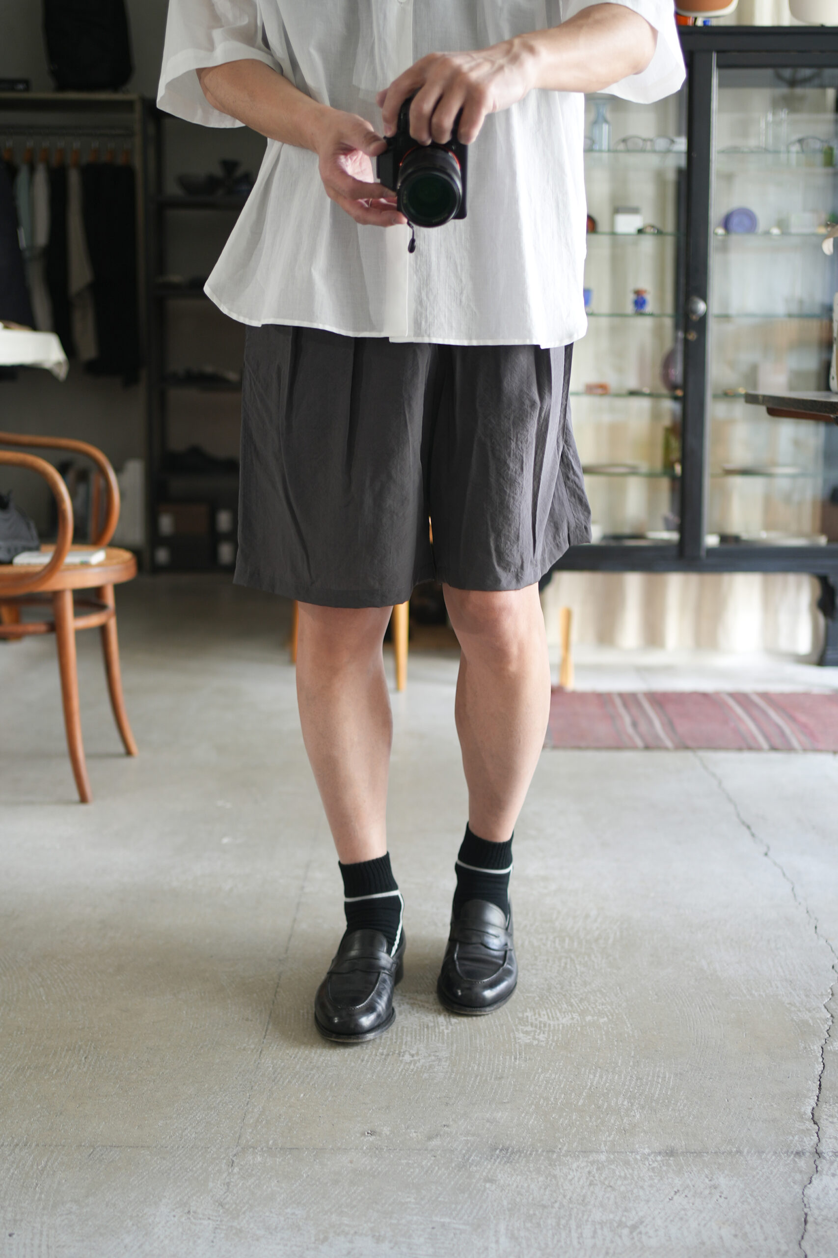 オーバーサイジングのワイドハーフパンツ。ウエストはイージー仕様の為、膝丈ほどのレングスと相まってリラックス感があります。股上はやや深めで全体的にやや A ライン気味のシルエットです。ウエストにはベルトループ風のキーループも御座います。肌との設置面も少なく夏場に重宝する1着です。北陸地方の老舗の機屋でおられた経糸キュプラ×緯糸リサイクルナイロンのタフタ素材。上品な光沢とドレープ性がありエレガントな印象ながら塩縮加工を施すことでヴィンテージの様なシュリンク感、柔らかな風合いに仕上げています。適度な照感と塩縮加工により、何処か90sのスポーツウェア感とモード感も同居します。