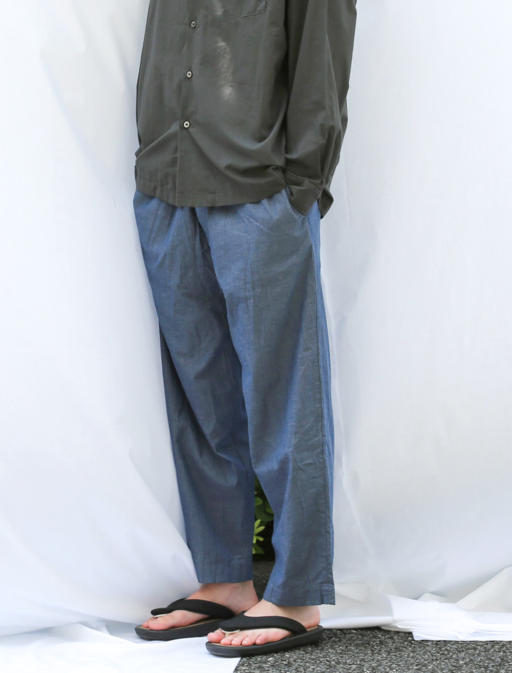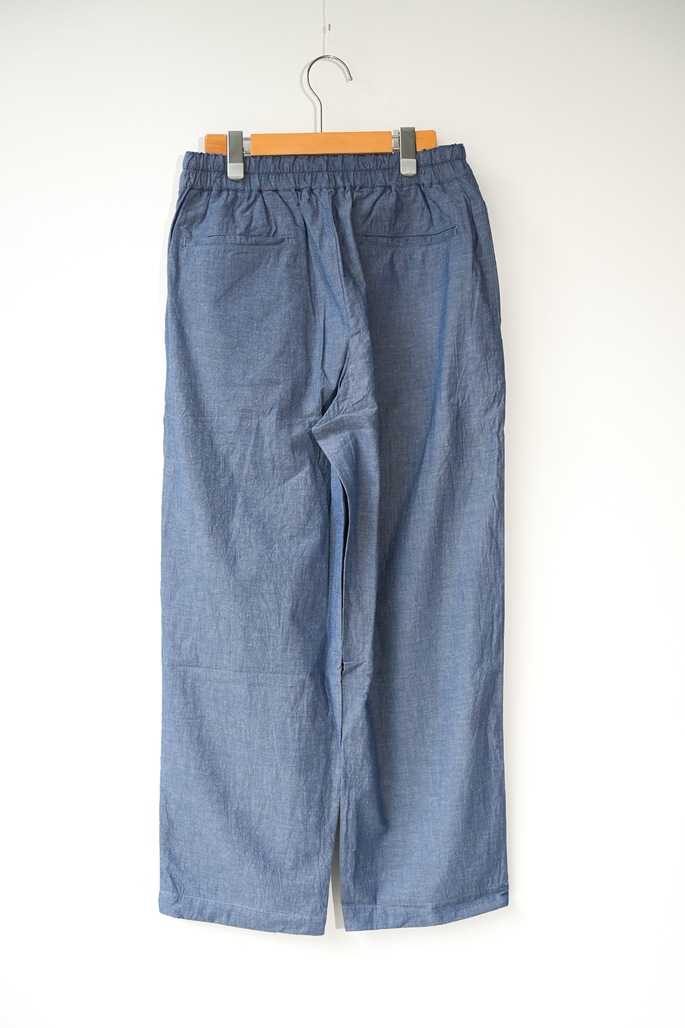 程よい太さのストレートシルエットクックパンツ、コットンリネン生地。料理人が厨房で穿くコックパンツをモチーフに作られたイージーパンツ、ウエストはゴムと紐仕様。