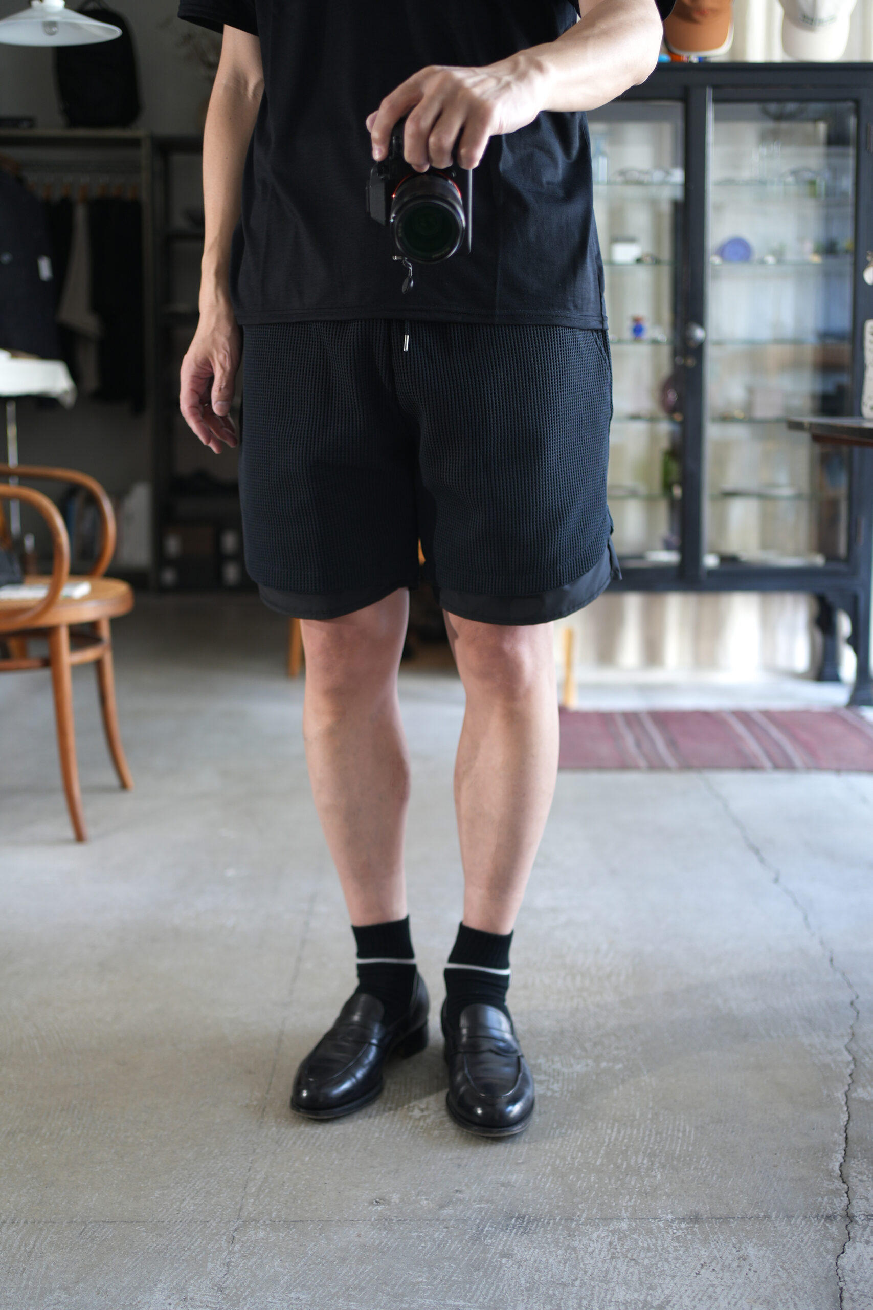 Solotexワッフルを使用したイージーショーツ。裏地付きの二重構造になっており、内側には透湿撥水性の高いポリエステルタフタを使用。ノンラミネート加工により汗、水分を内部から外へ素早く放出し、ムレを抑え快適に保つ。ウエストはドローコード仕様。右腰にDカン付き。表側にはテイジンの開発したSolotexを使用した変形ワッフル素材を採用。コイル形状でストレッチ性、キックバック性に優れ、吸水速乾性も併せ持つ。
