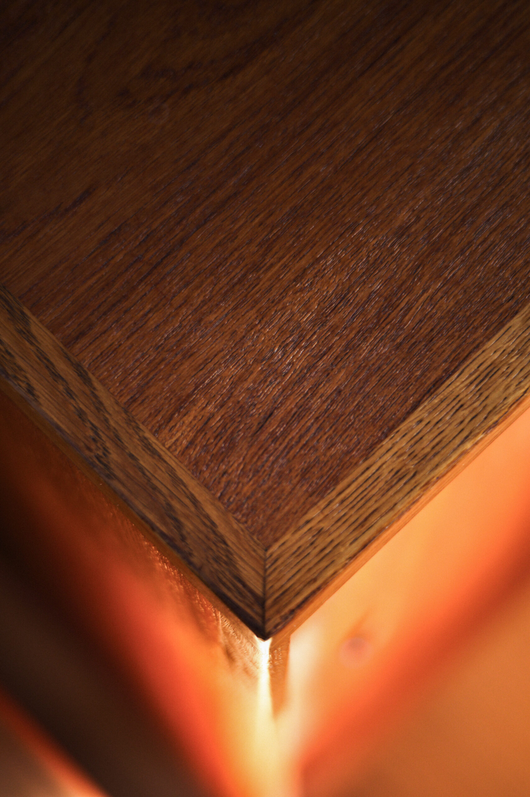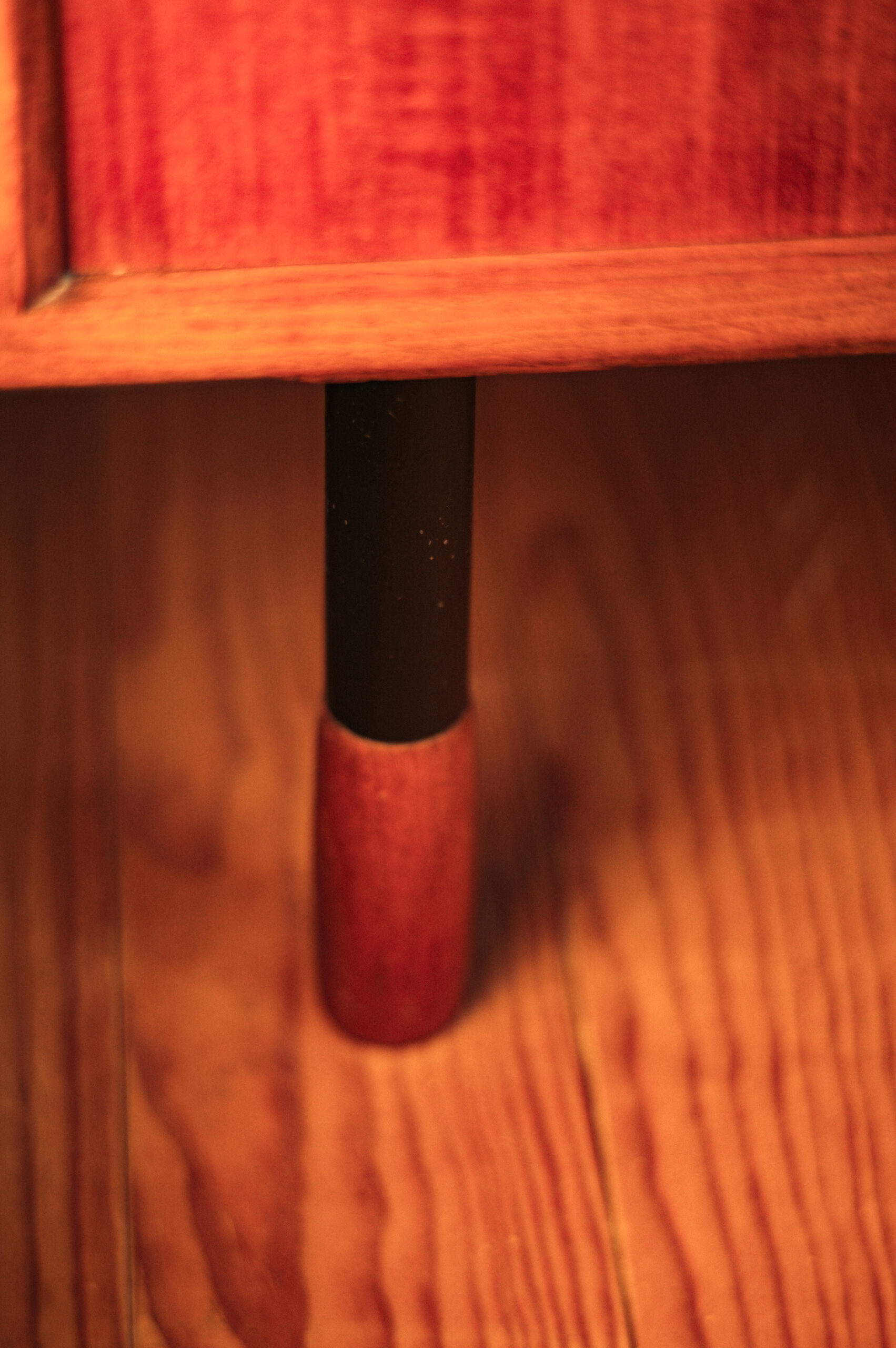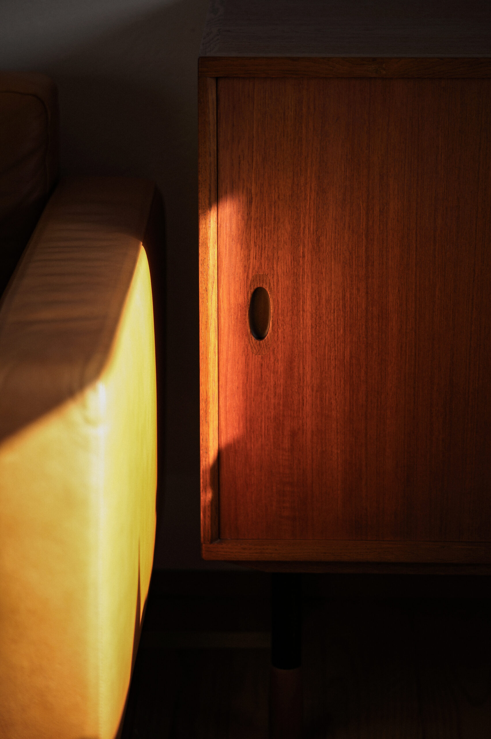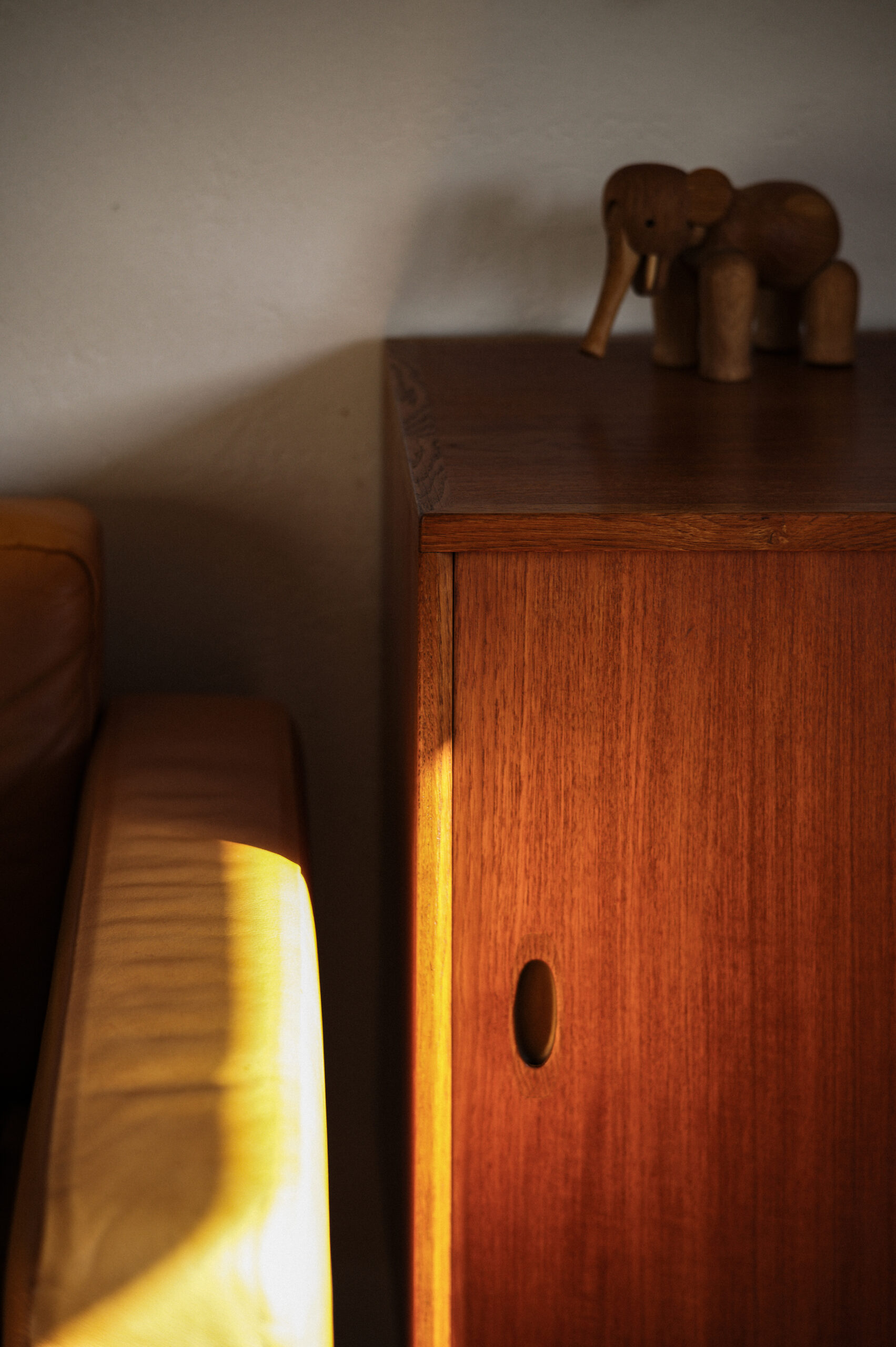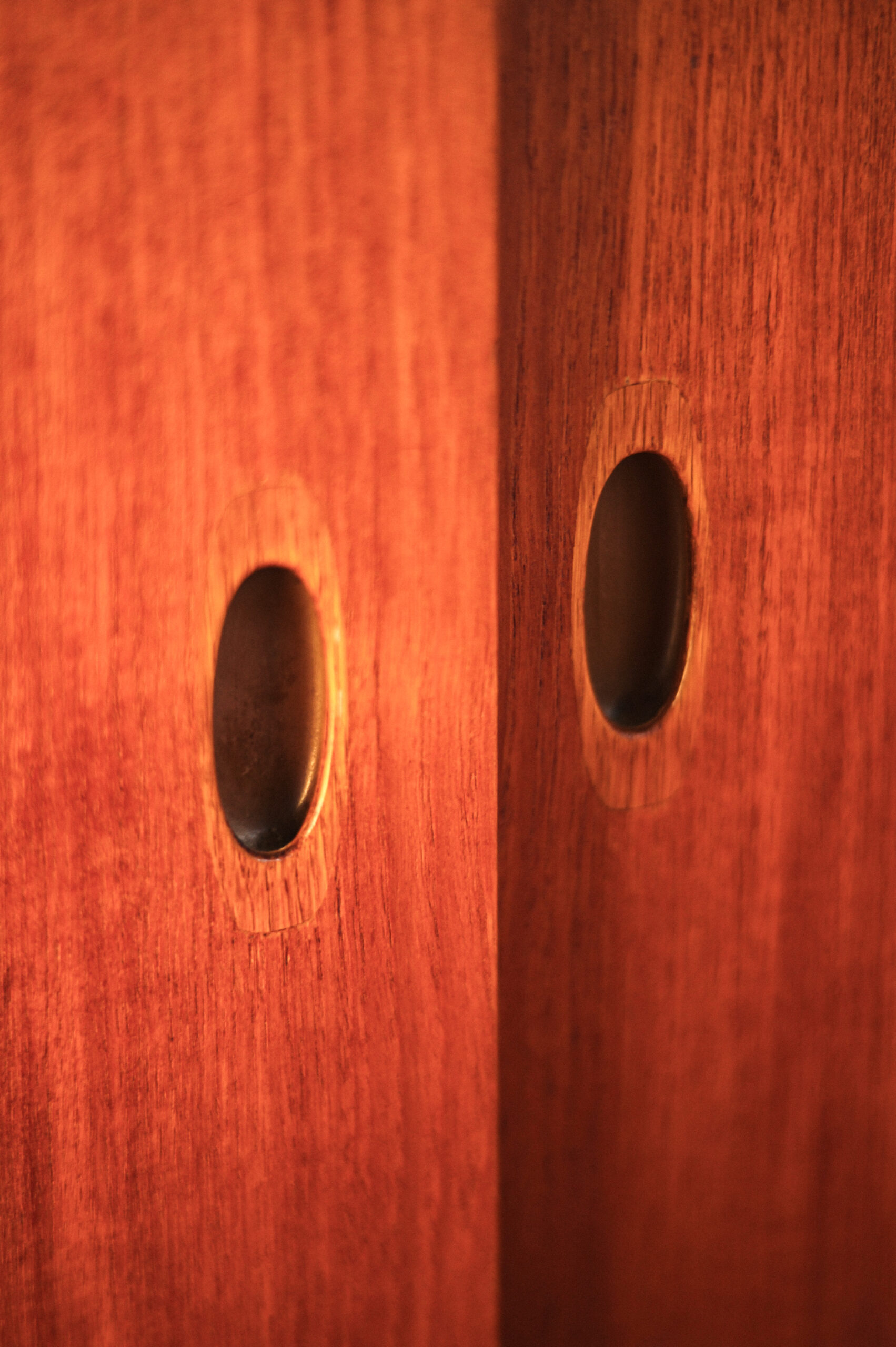 でも、チーク材をベースにオーク材で縁取りをし、鉄脚にオーク材のブーツを履かせ、日本の引き戸を彷彿とさせるオークをあしらった丸い取手の意匠、引き戸レールの構造に惚れ込み、「彼の作品でなくてもいいや」と思い購入をした。