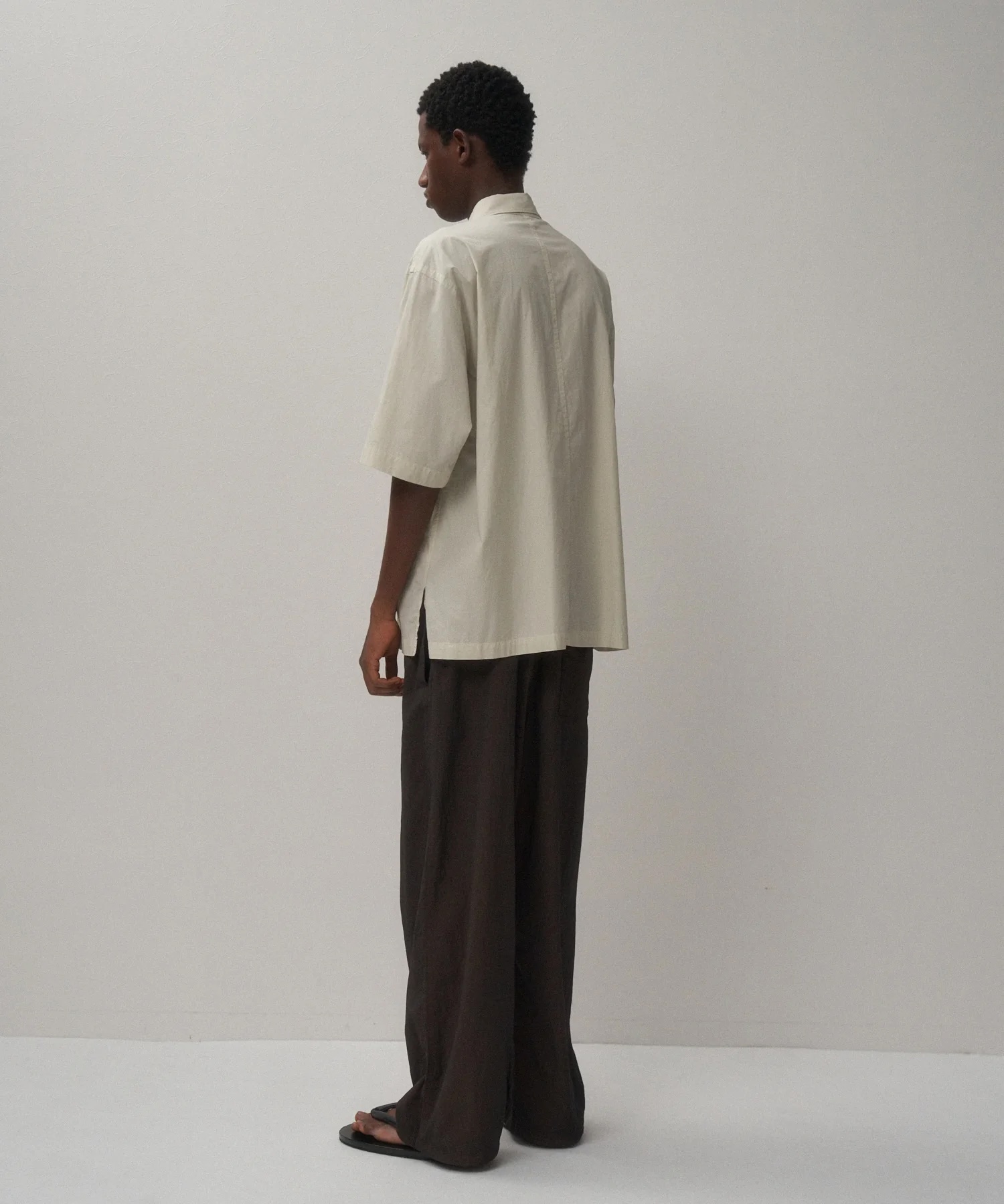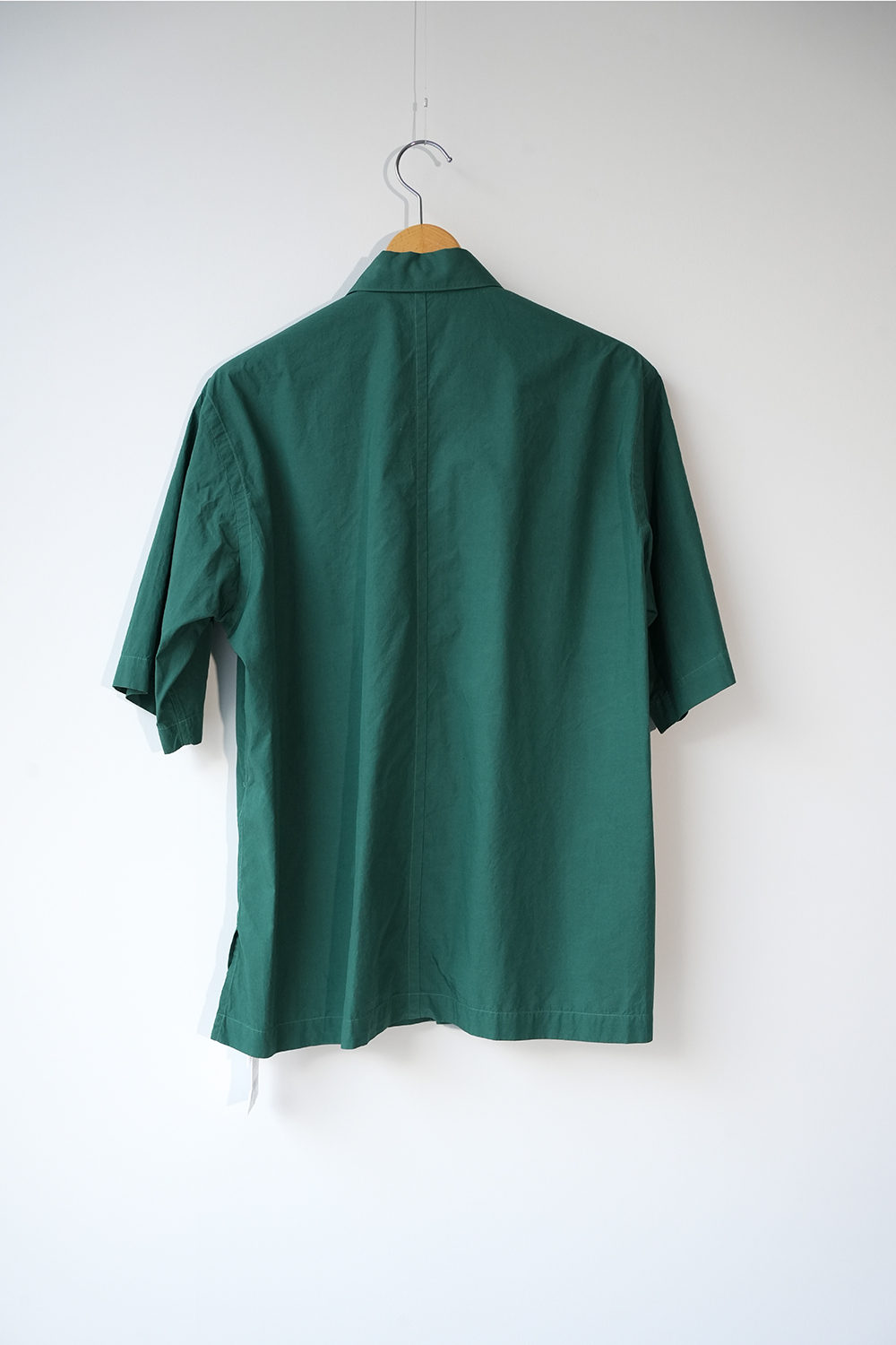 オーバーサイズで、リラックスしたシルエットが特徴の半袖シャツ。背中心は縦接ぎを採用し、ブルゾンのような迫力ある表情に仕上げています。製品染めを施しているので、洗濯しても縮みは起きず、取り扱いも楽です。アメリカのスーピマコットンを使い、浜松市でゆっくり織られた平織り素材に、生地をしっかり揉みこんで、密度を上げる加工を施した素材です。製品染めで綿本来の膨らみを最大限引き出した、滑らかでとても軽いオリジナル素材です。