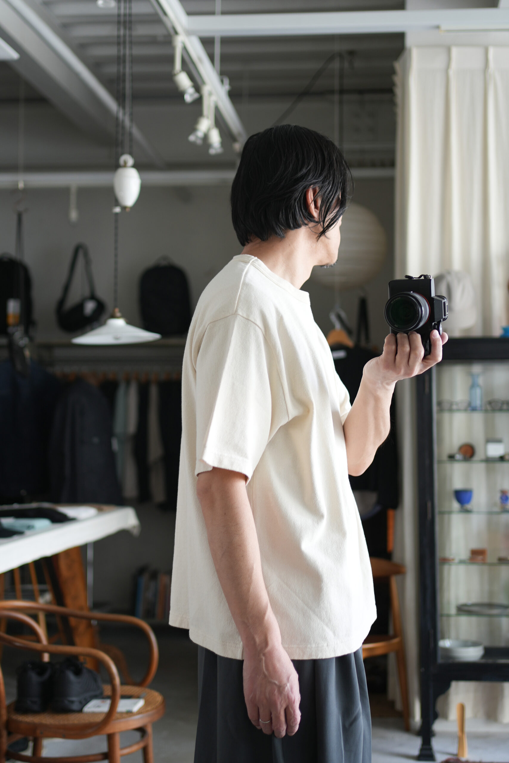 ローシルクの裏側にコットンを入れ混紡した生地、滑りのある質感などはそのままにローシルク独特な生地のダレ感を解消したblurhms独自の生地を使用。ゆったりとしたシルエット、ネップ感のある粗野な表情が魅力のクルーネックTシャツ。