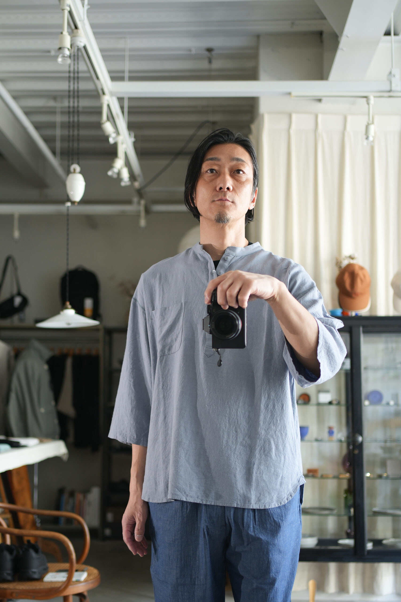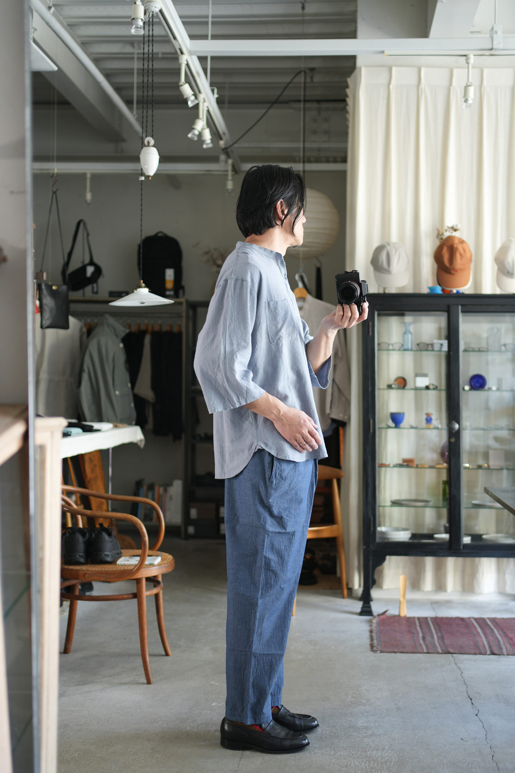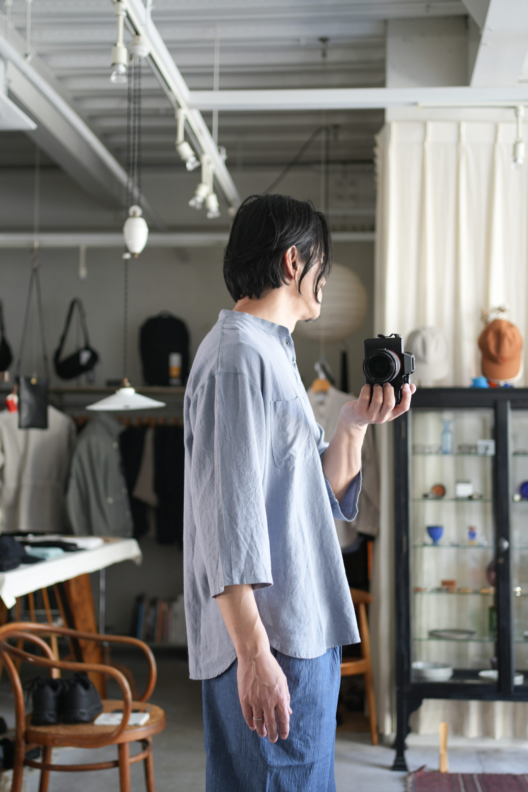 ヘンリーネックデザインのプルオーバーシャツ”チャコールヘンリー”、シャツ生地を用い、フラットシーマ縫製などカットソー縫製で仕上げたシャツとカットソーそれぞれの良さを組み合わせた一枚。ゆったりとしたゆとりのあるドロップショルダー、裾ラウンドカット、7分袖。