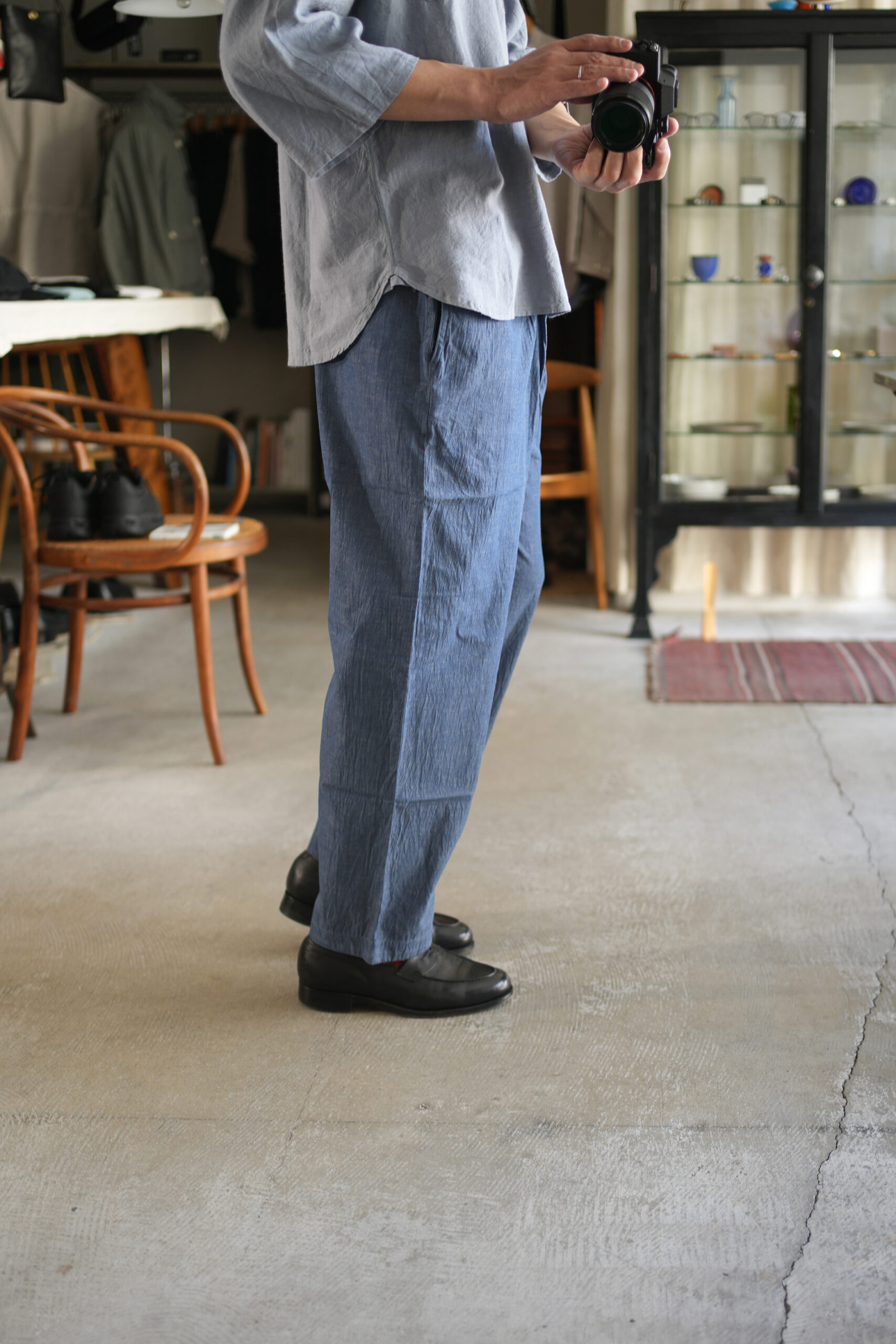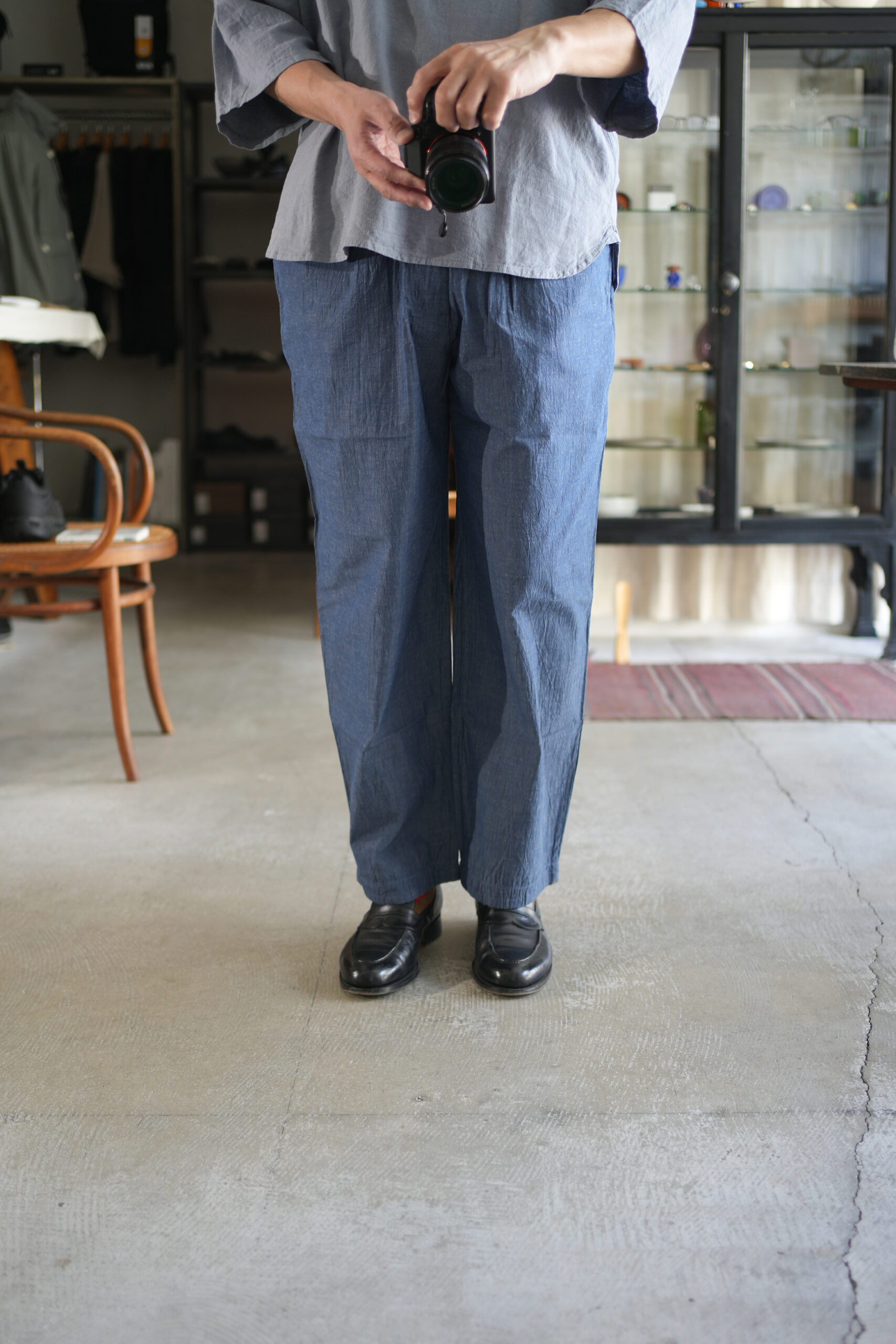 程よい太さのストレートシルエットクックパンツ、コットンリネン生地。料理人が厨房で穿くコックパンツをモチーフに作られたイージーパンツ、ウエストはゴムと紐仕様。