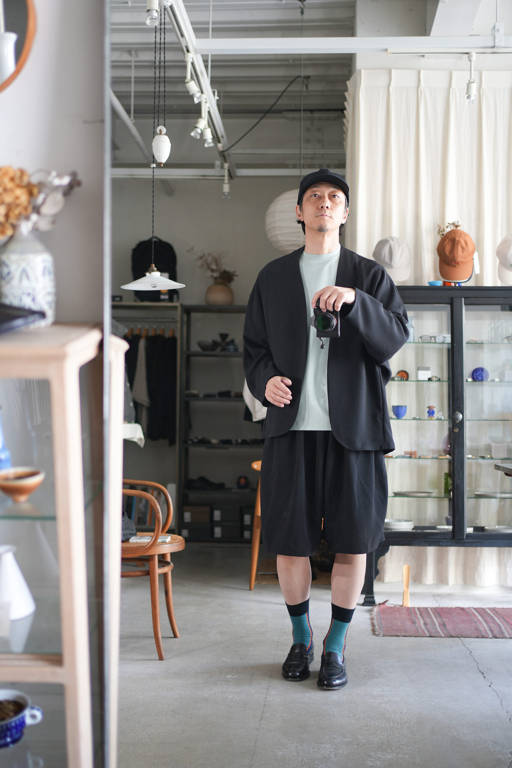 「NO CONTROL AIR」スパンポリエステルドレープカルゼドルマンジャケット & ワイドハーフパンツ。