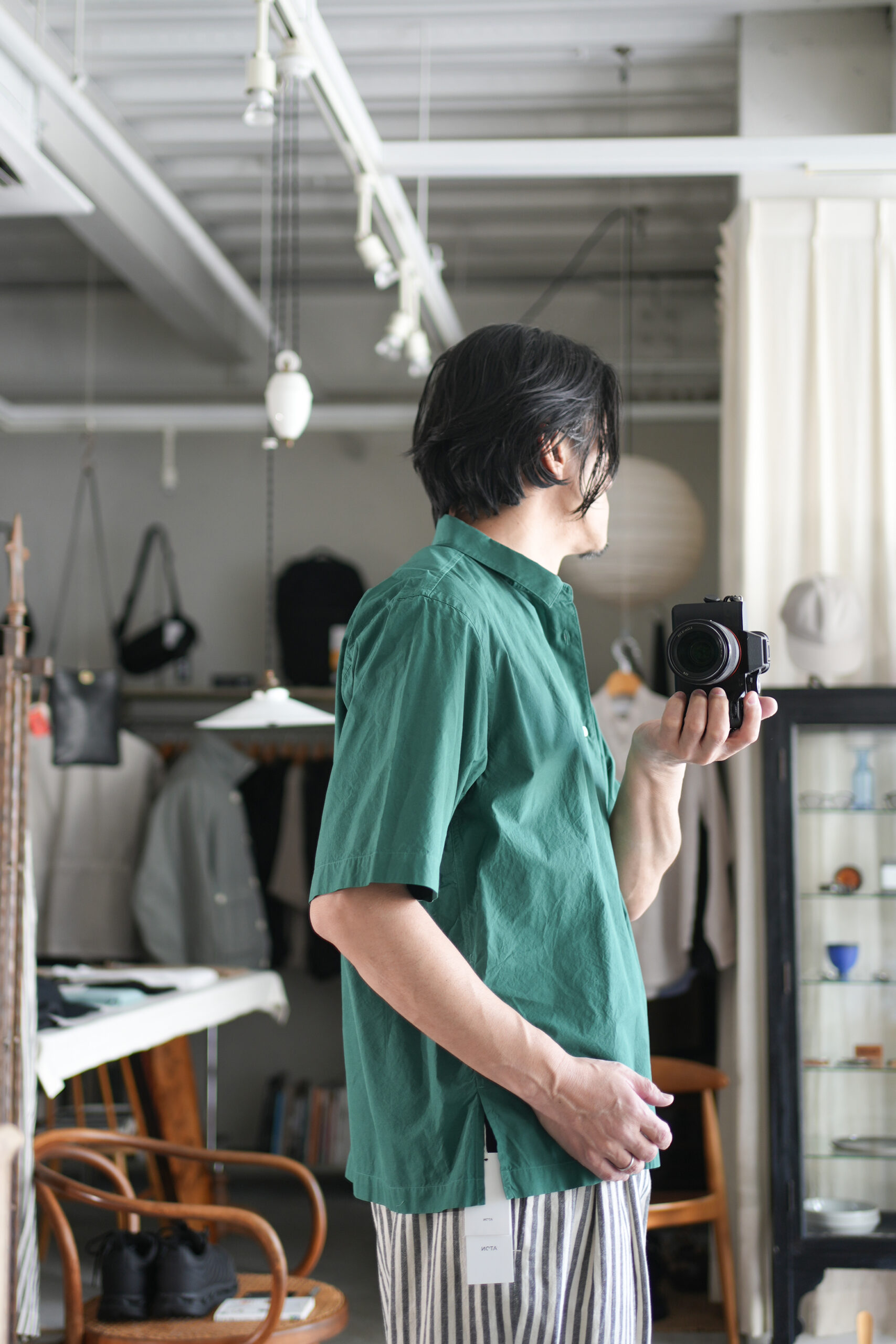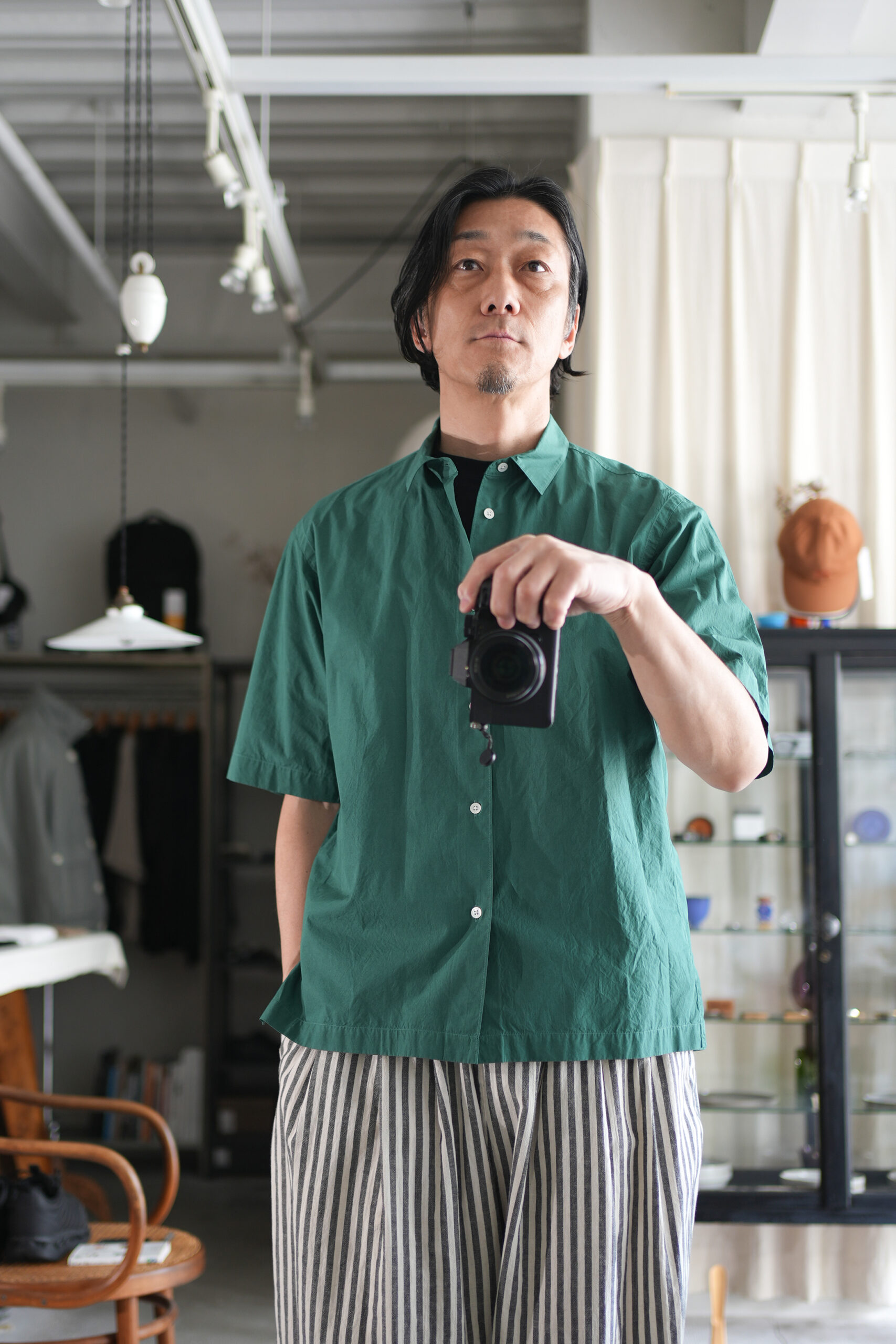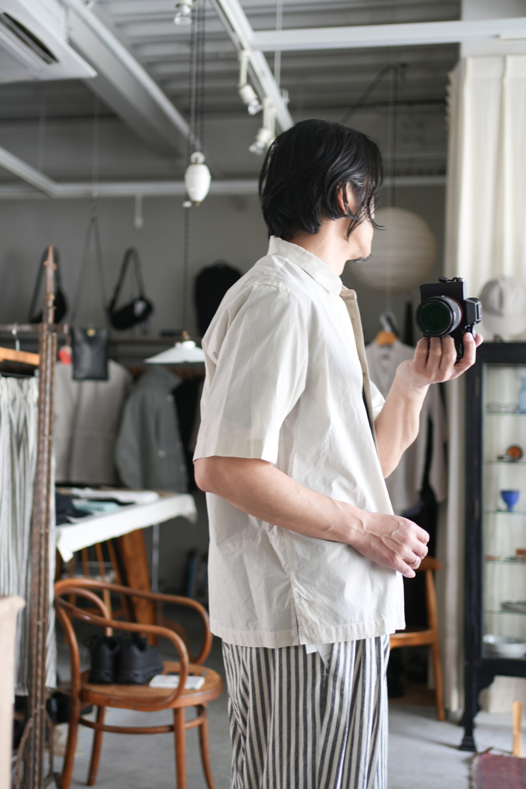 オーバーサイズで、リラックスしたシルエットが特徴の半袖シャツ。背中心は縦接ぎを採用し、ブルゾンのような迫力ある表情に仕上げています。製品染めを施しているので、洗濯しても縮みは起きず、取り扱いも楽です。アメリカのスーピマコットンを使い、浜松市でゆっくり織られた平織り素材に、生地をしっかり揉みこんで、密度を上げる加工を施した素材です。製品染めで綿本来の膨らみを最大限引き出した、滑らかでとても軽いオリジナル素材です。