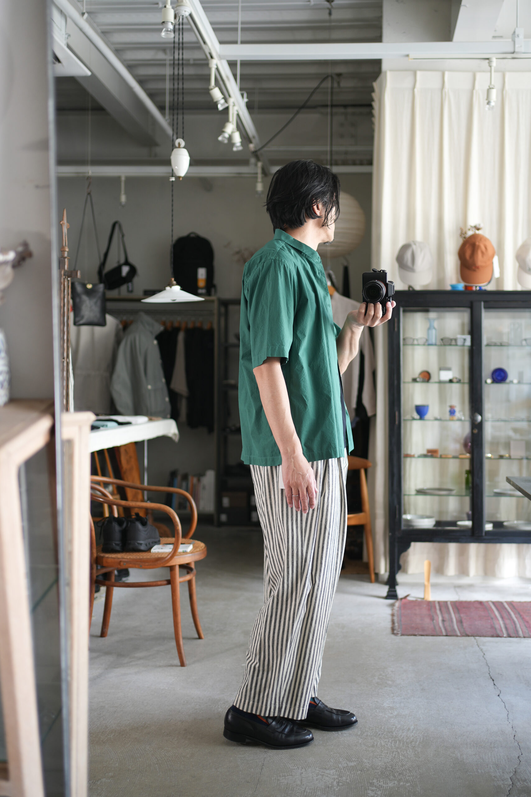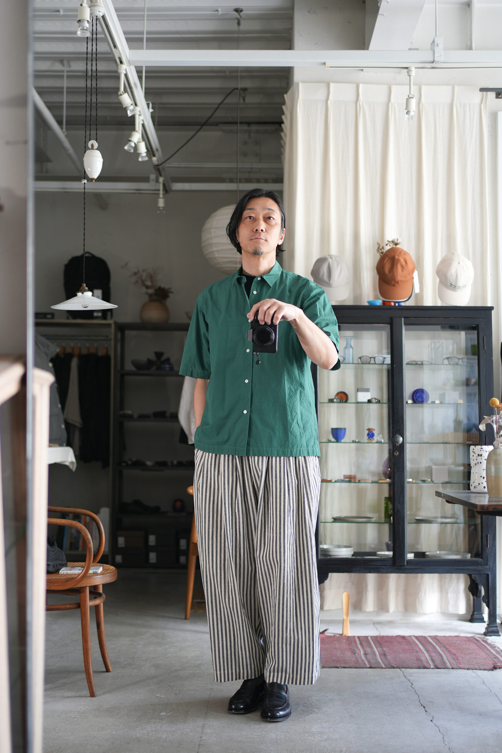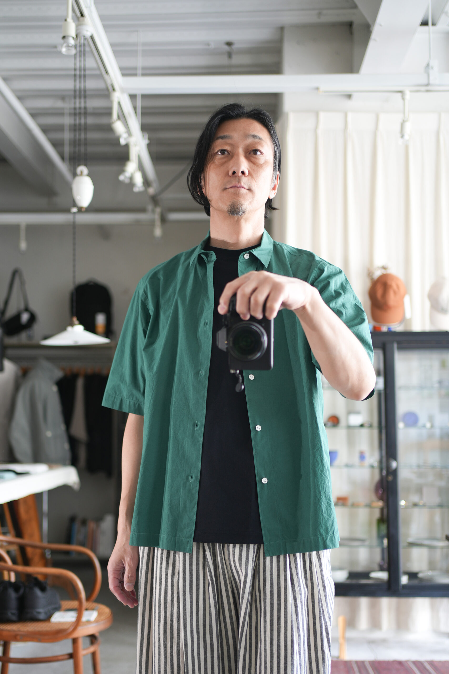 オーバーサイズで、リラックスしたシルエットが特徴の半袖シャツ。背中心は縦接ぎを採用し、ブルゾンのような迫力ある表情に仕上げています。製品染めを施しているので、洗濯しても縮みは起きず、取り扱いも楽です。アメリカのスーピマコットンを使い、浜松市でゆっくり織られた平織り素材に、生地をしっかり揉みこんで、密度を上げる加工を施した素材です。製品染めで綿本来の膨らみを最大限引き出した、滑らかでとても軽いオリジナル素材です。