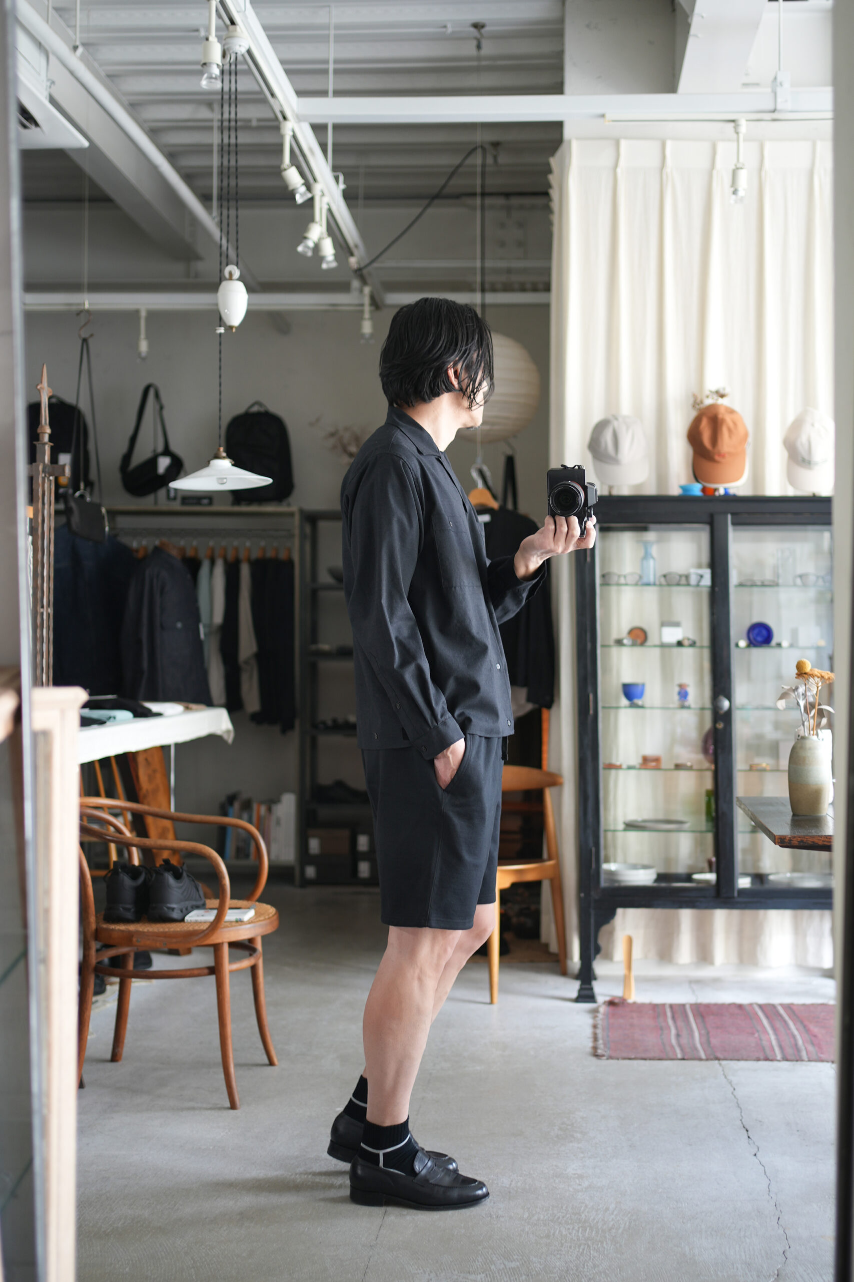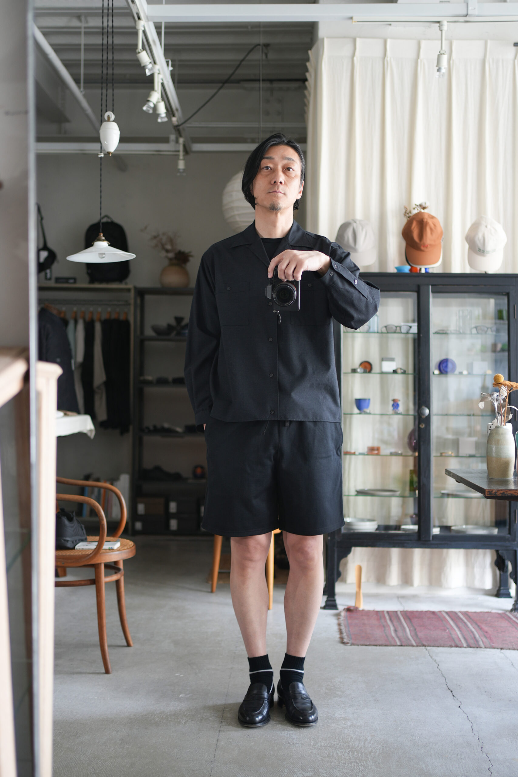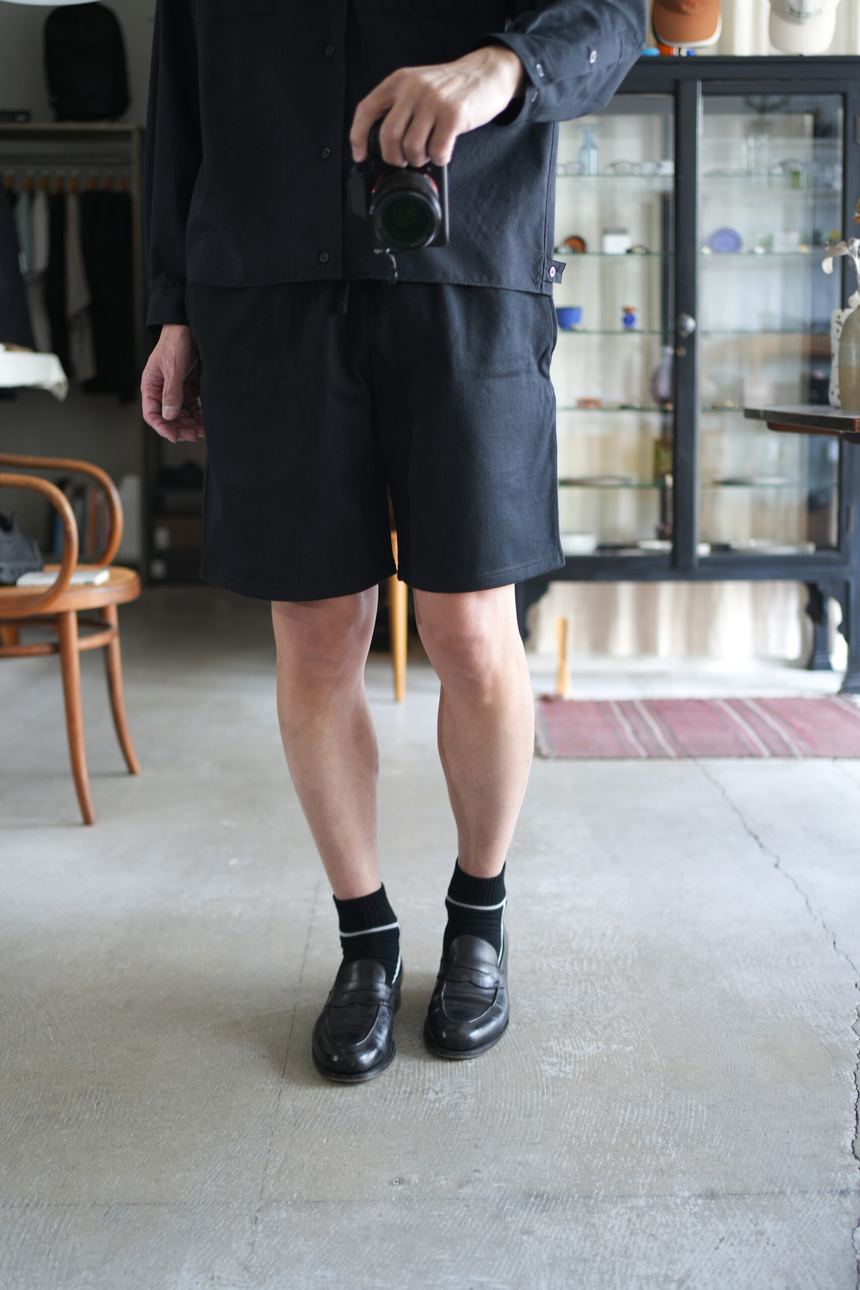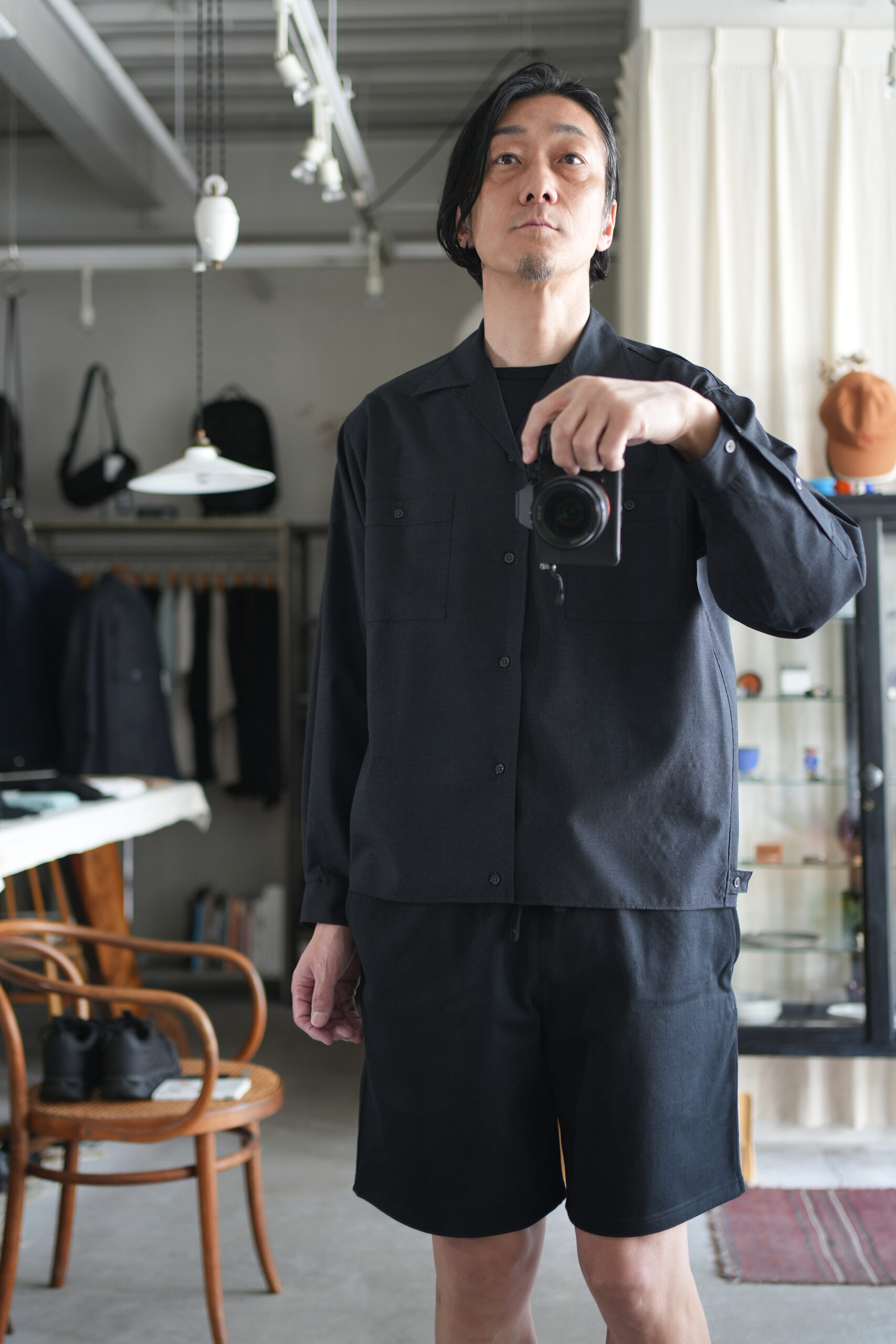 「marka」WOOL TROPICAL WASHER DOUBLE POCKET OPEN COLLAR SHIRT & 「MARKAWARE」GYM SHORTS