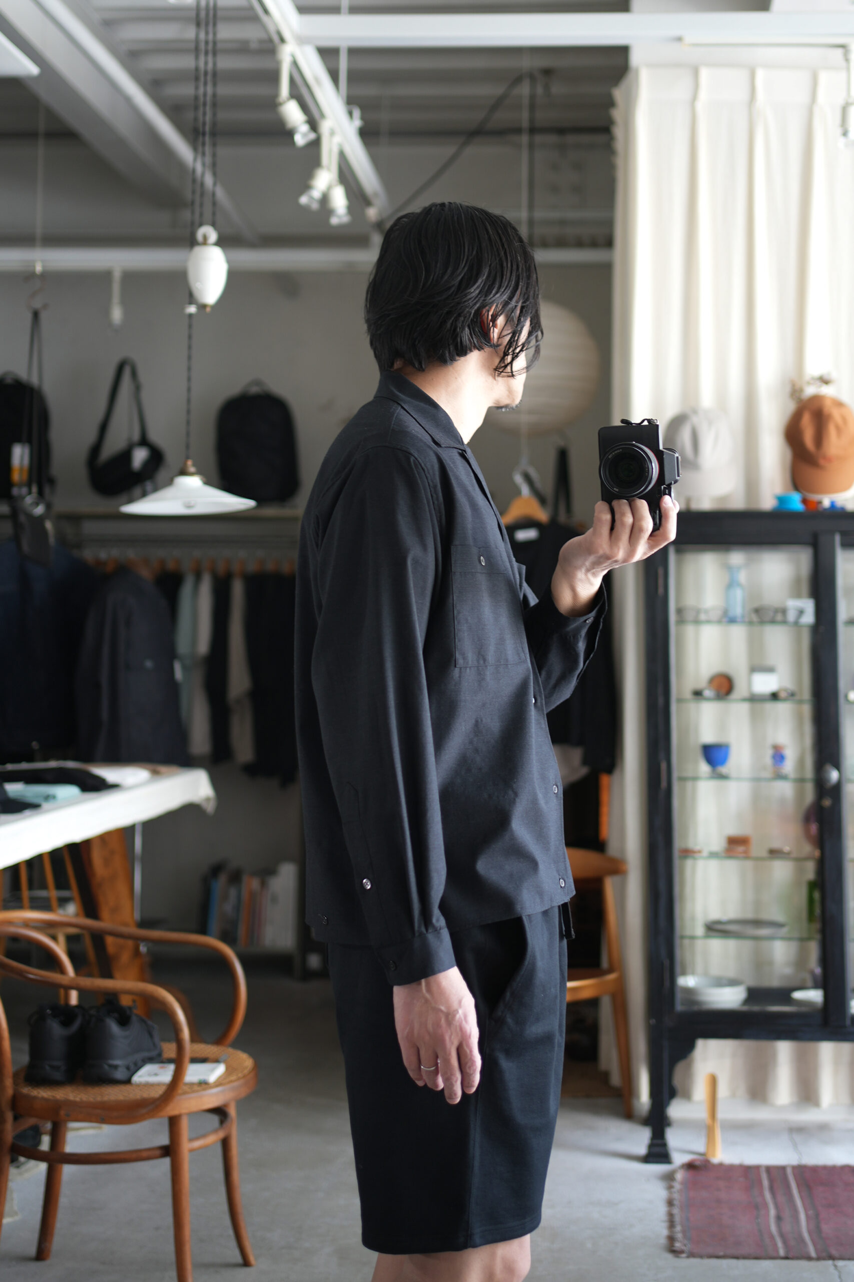 新型として登場した[Double Pocket Open Collar Shirt]。胸元に配した大きなダブルポケットが、視覚的なアクセントとカジュアルな要素を加えています。フロントボタンは裾まで配置しており、シャツとしてだけでなく、軽い羽織りとしての着用も想定したデザイン。後ろ身頃の両脇裾にはアジャスト用のタブとボタンを備え、裾を絞ることでブラウジングさせ、ブルゾンのようなシルエットで着用することも可能です。シャツとライトアウターの両方の役割を担う、汎用性の高い新型シャツ。裾を絞ることでシルエットに変化をつけられ、気温やスタイリングに合わせた着こなしが楽しめます。素材ならではの清涼感と軽さにより、長いシーズン活躍する一着です。72番双糸のウールを平織りした、ブランド定番のウールトロピカルワッシャー素材。シャツ地に近い肉感で、非常に軽やかな着心地が特徴。生地の段階でワッシャー・タンブラー加工を施し、水を通して揉みほぐすことで、全体に細かなシボ感と小皺を加えています。これにより、ウールでありながら古着のようなカジュアルなニュアンスを持ち、気負わず日常のスタイルに馴染む風合いに仕上げています。