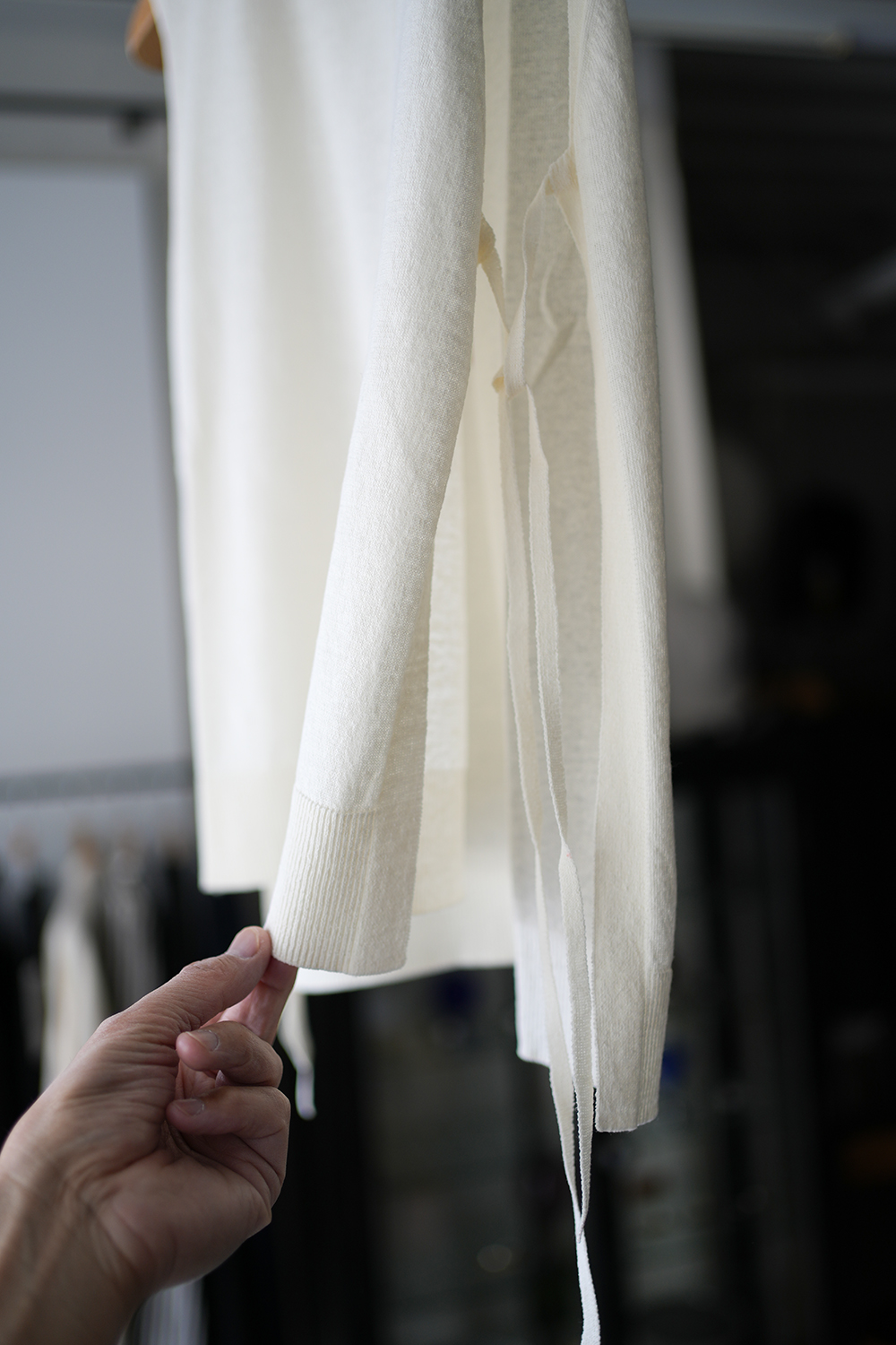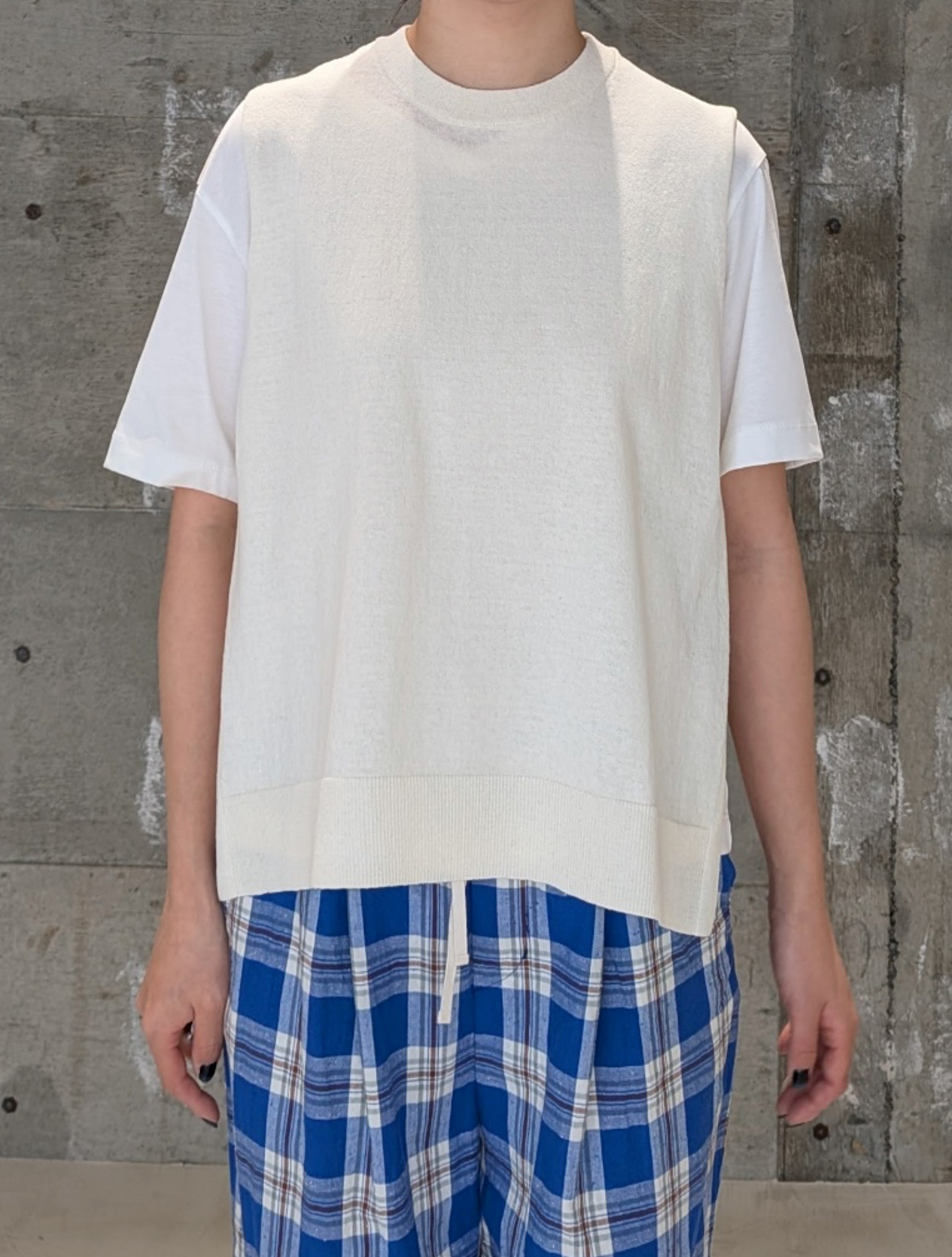 林縁コットン素材、天竺編みニットベスト、ドライな素材感。Tシャツなどとレイヤードしスタイリング。