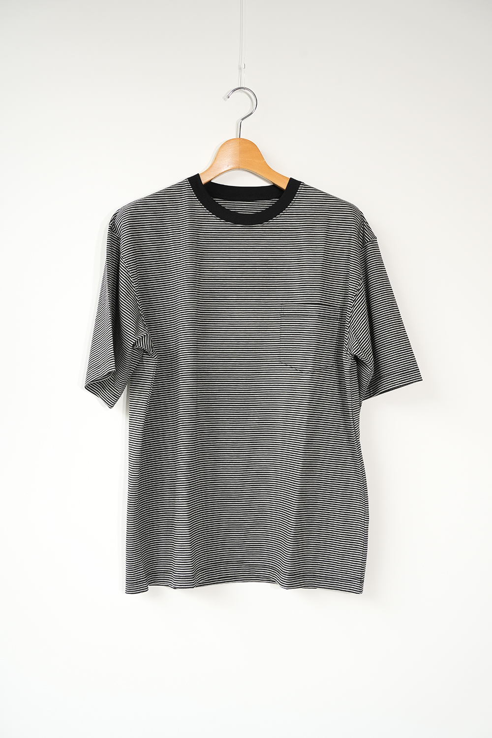 強撚糸を極限までハイゲージで編んだ天竺。透け感がなく綺麗なハイゲージニットのような光沢がある生地です。身幅・袖幅ゆったりシルエット。