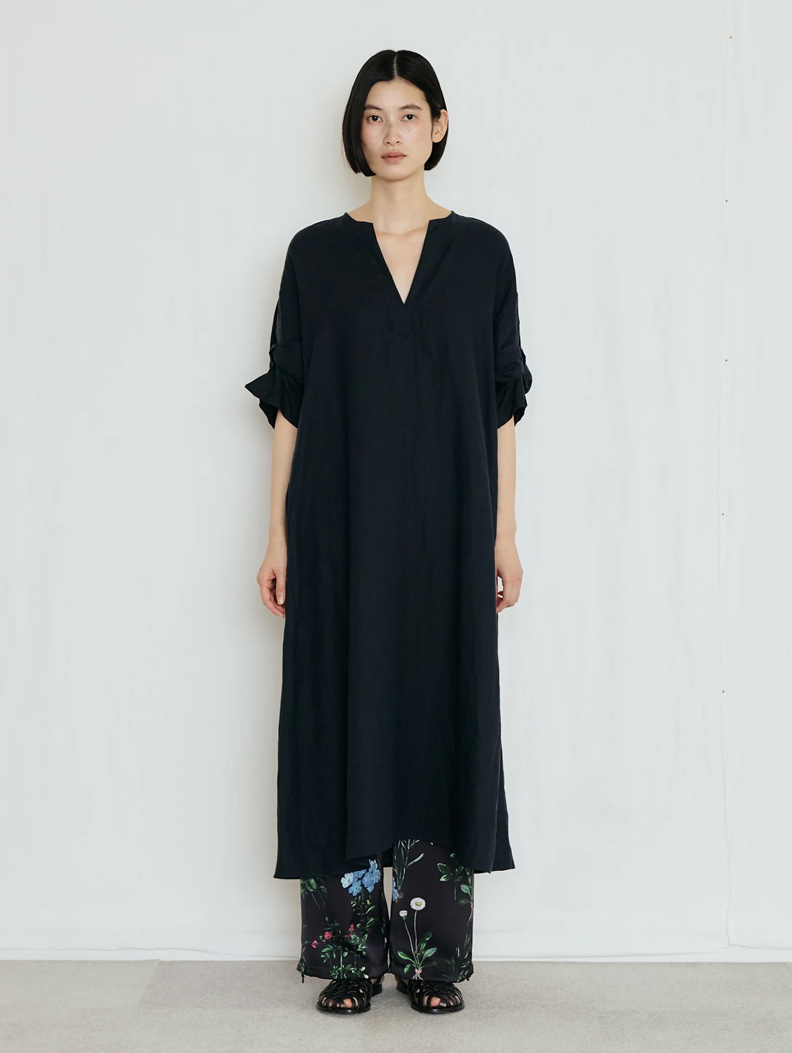 繊細かつ鮮やかでラフなフラワープリントパンツ。素材の美しさを生かしたミニマルなデザイン、とろみのあるドレープと桃のような柔らかい肌触りが魅力、リラクシーながらも、すっきりとした上品なシルエット。オリジナルのインクジェットプリントによる繊細なフラワーモチーフ、ヴィンテージ図鑑を思わせる花々が、大人の装いに華を添える、ウエストゴムで左部分にはドローコードを施しています。裾部分も絞れるようになっています。ポリエステル繊維を柔らかくシルクのようなしなやかなドレープ感のある風合いを持たせるために加工を施しています。非常に繊細な技術力が必要な加工です。桃のような肌触りとしなやかな柔らかさを持った素材です。プリントはダイレクトインクジェットという手法を使っています。TICCAらしい濃色のベースカラーに可憐な野草のモチーフを散りばめた、華やか且つどんな色とも相性のいい柄です。同素材のフラワープリントビスチェを合わせて、セットアップとして着こなすのがおすすめ。Tシャツやノースリーブシャツを合わせれば、抜け感のあるリラックススタイルに。シンプルなリネンシャツやジャケットを羽織っても、プリントがほどよいアクセントになります。足元はサンダルやフラットシューズで軽やかに、ヒールを合わせれば上品なサマールックに仕上がります。