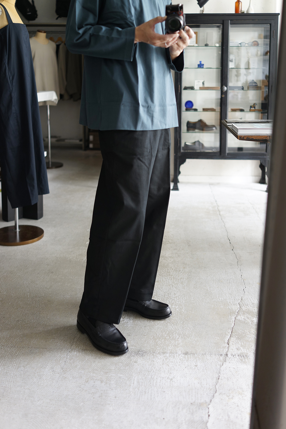 ORGANIC COTTON DRILL生地で仕立てたワイドパンツ。両サイドにウェスト調整のアジャスター付き。通年でお穿きいただける生地のパンツです。