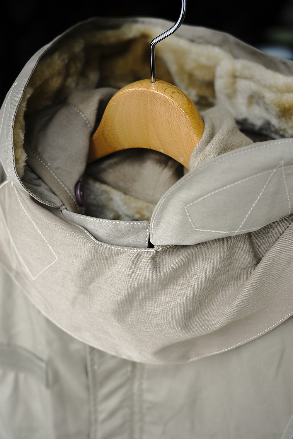 トレンチ生地をパッチワーク風につないでリメイクしたフード付きアウター。フィッシュテール、大ぶりで立体感のある着脱可能なフードに、M-65フィールドパーカータイプのミリタリーなディテールをしっかりと取り入れた本格仕様な一着。リラックスなサイジングとマニッシュな雰囲気。古着特有の経年感やくたりがある生地が風合いを醸し出す。ライニング付きで暖かさもしっかり完備。