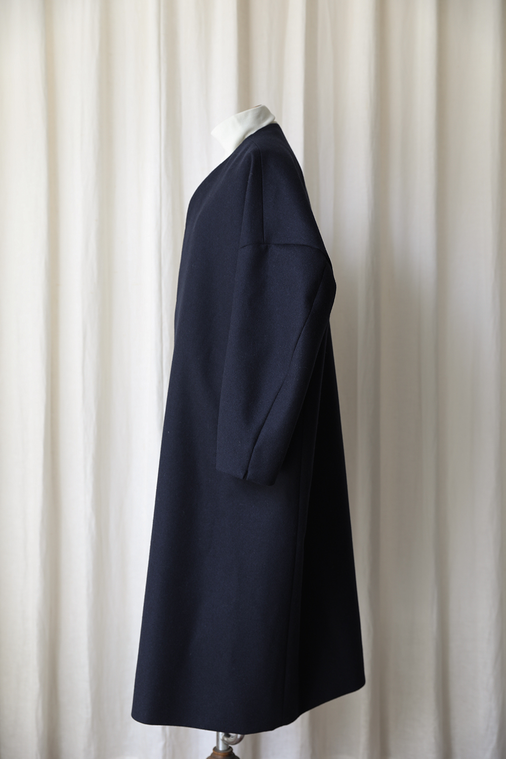 ノーカラー、袖先ボタンレス、前縦比翼仕立て、とてもミニマルデザインのオーバーサイズロングコートです。