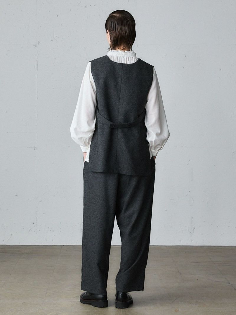 リサイクル紡毛素材を使用したラップライクコクーンパンツ。カシミアをプラスしており、しなやかでトラッドな印象を表現しました。暖かな冬のツイード生地が魅力のVネックベスト。ラップライクコクーンパンツとセットアップでお使いいただけます。