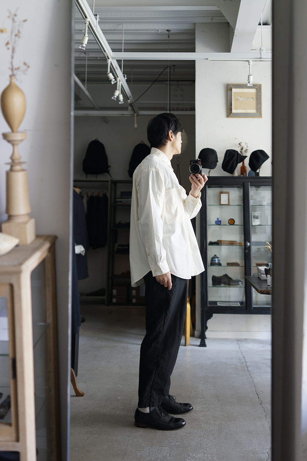 しっかりとした打ち込みのORGANIC COTTON TYPEWRITER生地で仕立てられたUTILITY SHIRT WIDE。