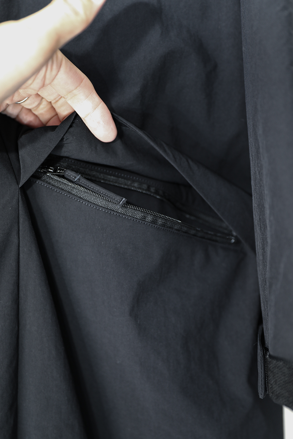 ナイロンとポリエステルの熱収縮率の違いを生かし、環境の変化により表情が変わっていく様を楽しむことのできる糸を高密度に織り込むことにより、独特の風合いがある素材に、日本にて特殊なコーティングを施した素材。