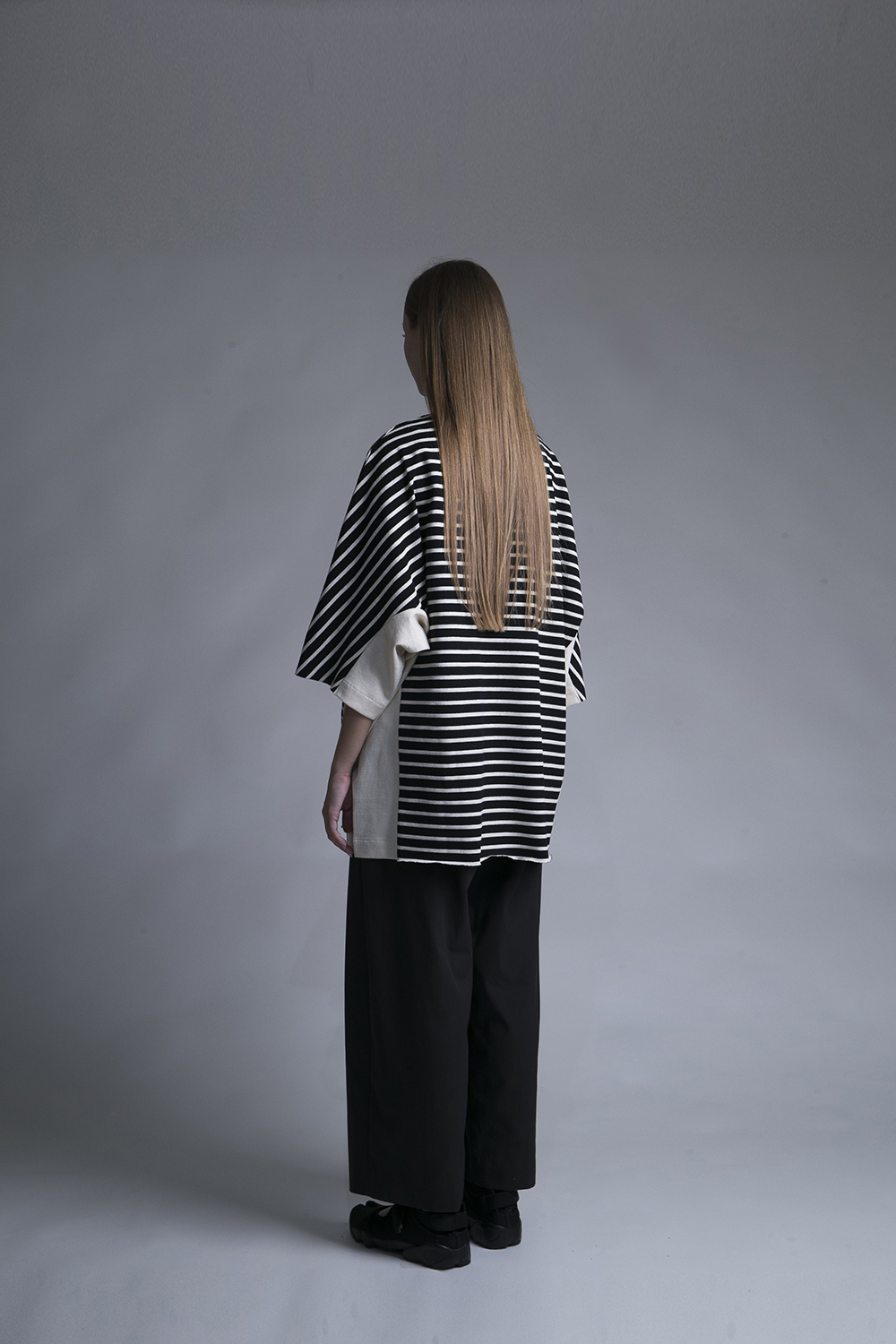 BD天竺生地を使用したロングスリーブTシャツ。袖口から脇、裾にかけて切り替えしているデザインが特徴です。断ちにこだわり、他にない柄合わせとなりました。裾にカットオフしたディテールを加える事で、一般的に優等生になりがちな清潔感のあるボーダーにラフさをプラスした新感覚なTシャツに仕上がっています。全体的にゆったりとしたオーバーサイズシルエット。程よく厚みもあるしっかりとしたカットソーです。