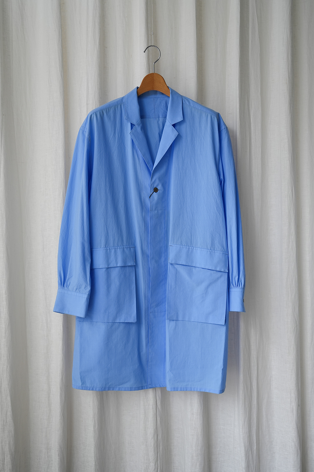 腹部左右のフラップポケットが印象的なシャツコート、真夏までスタイリングしてほしいライトアウター。綺麗な仕立てに洗いを入れたコットン生地の穏やかな風合い。