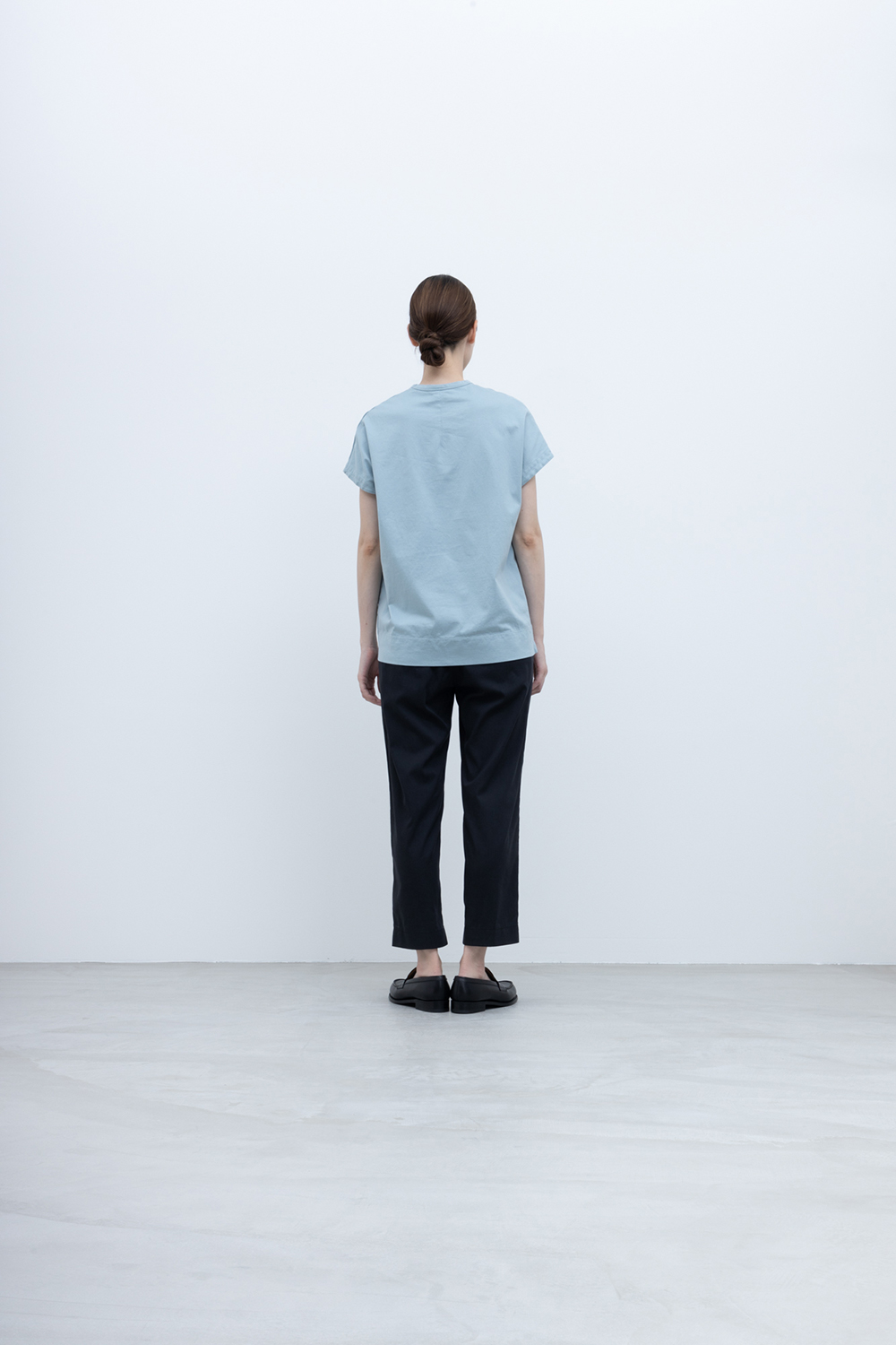 毛羽焼きされた超長綿の糸を三子撚りし、度詰めに編み立てた天竺生地。編み上げ後にもう一度毛羽を落とした肌触りよくなめらかに仕上げた上質な生地です。変形クルーネック、フレンチスリーブ袖、脇スリット。