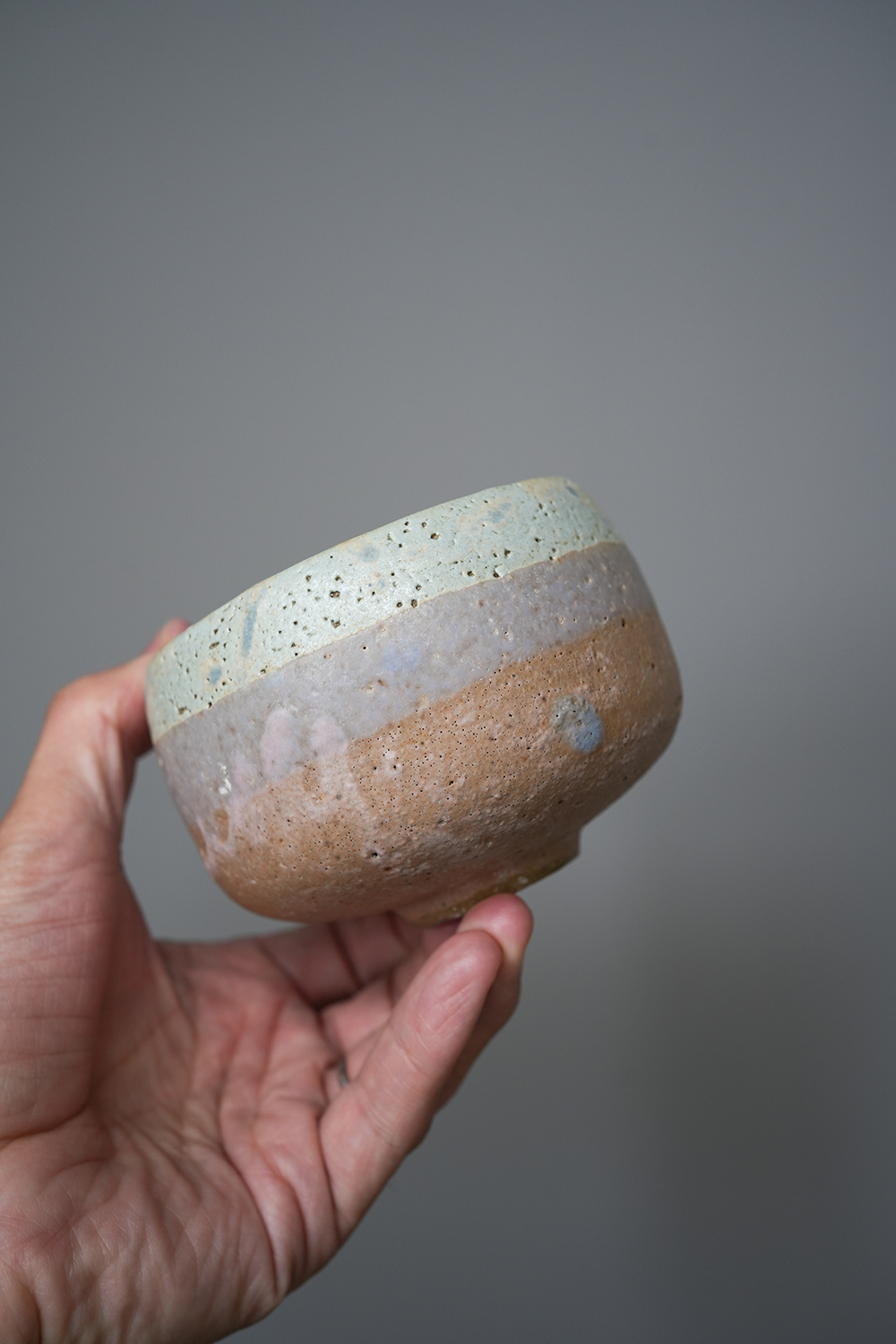 密やかに水色と桃色の飛ばし釉薬をアクセントした、マットで凹凸感ある肌感が優しい印象の抹茶碗。
