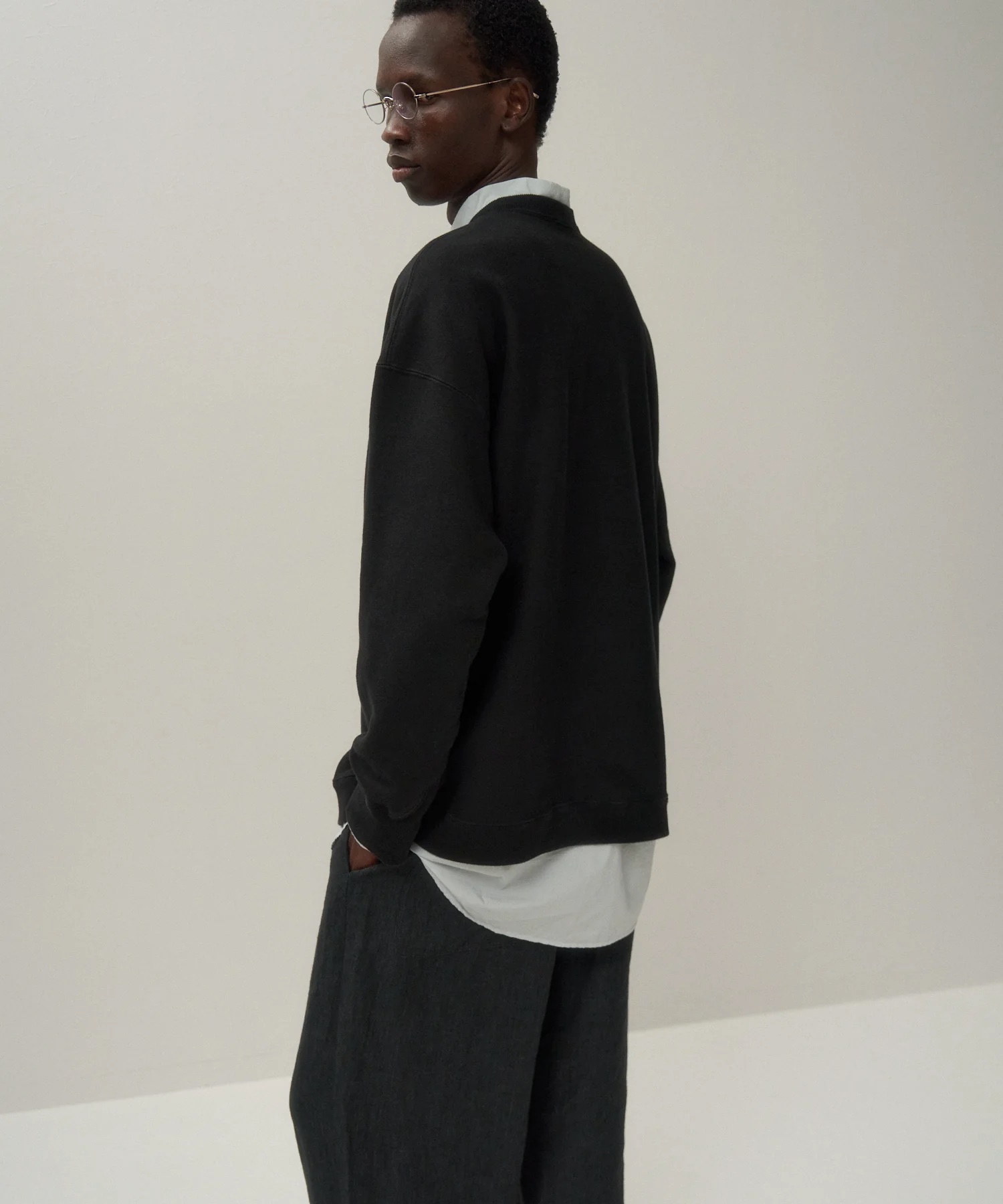 70年代のロサンゼルスの大学の購買部で売られていたカレッジトレーナーのヴィンテージを参考に作ったAラインに広がるトレーナー。特徴はTシャツのような横軸でカジュアルな印象、袖口のトライアングルや胸元の”A”はフーディーを継承しています。和歌山市で太番手の糸を通常の倍、限界まで高密度に編み上げたジャージー素材です、高密度に編み上げることで耐久性は勿論、製品染めをした後に、洗いをかけている為、縮みも起きません。裏毛は表面と裏面、その間を繋ぐ面の3層構造、間に空気を含む為、暖かさも兼ね備えています、MADE IN JAPAN。身幅、着丈、リブの緩さ、独自のシルエットバランスが素敵なスウェットです。