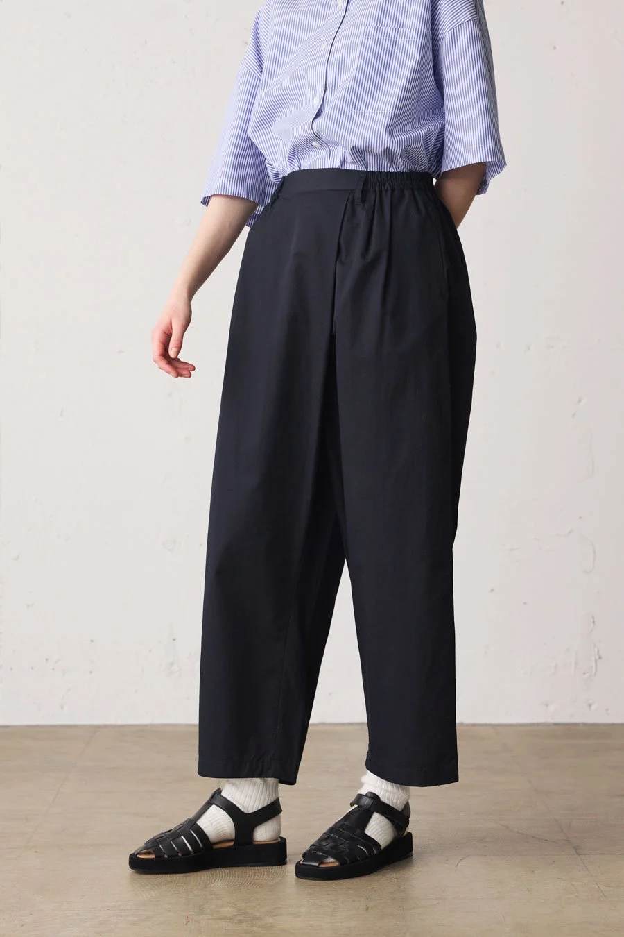 コットンリネンのカルゼ素材、洗いざらしで着用できるイージー素材のフロントラップパンツ。