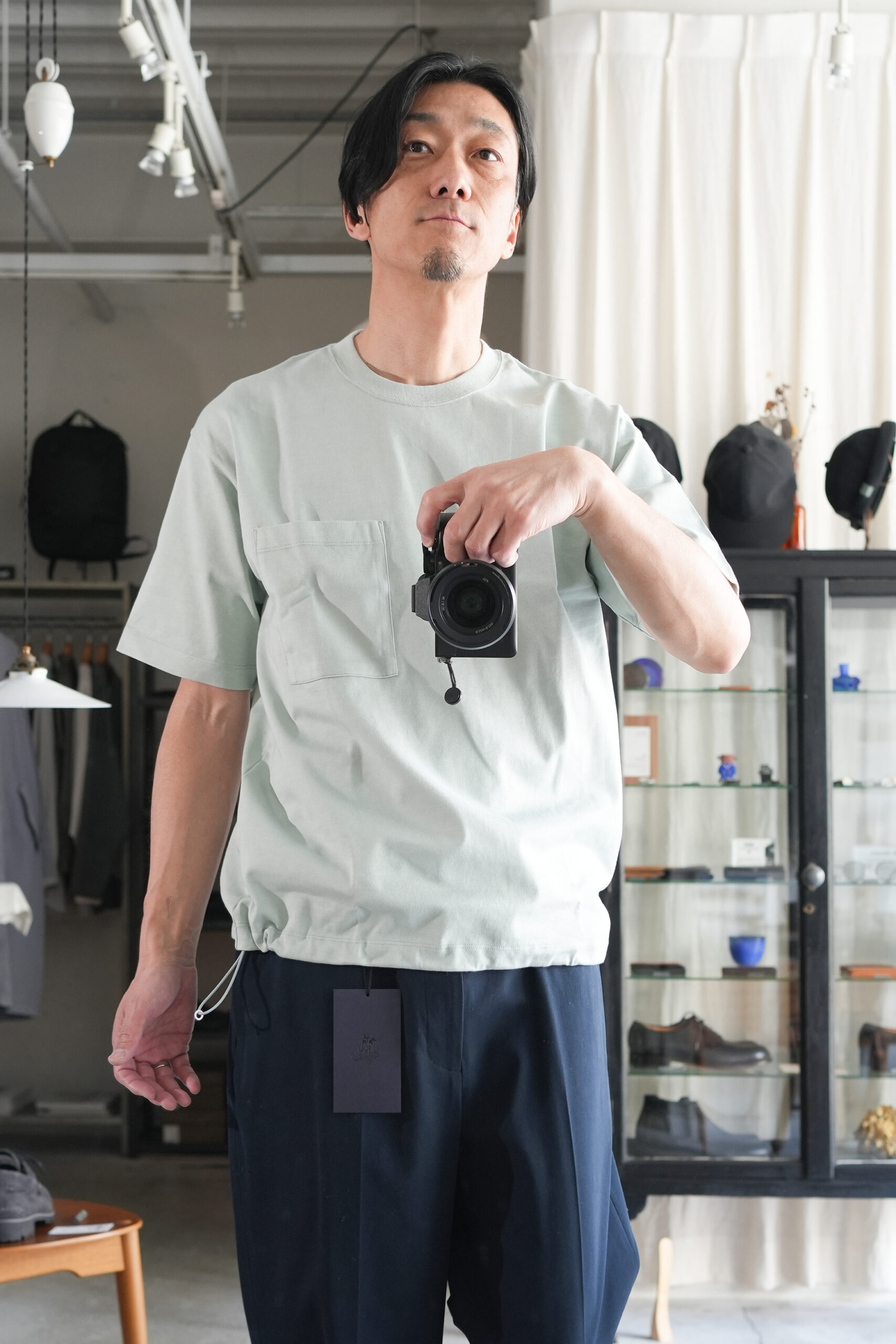 「CURLY」DRAWSTRING HEAVY PLATING S/S TEE & 「URU」HARD TWIST COTTON STRAIGHT PANT、着用。