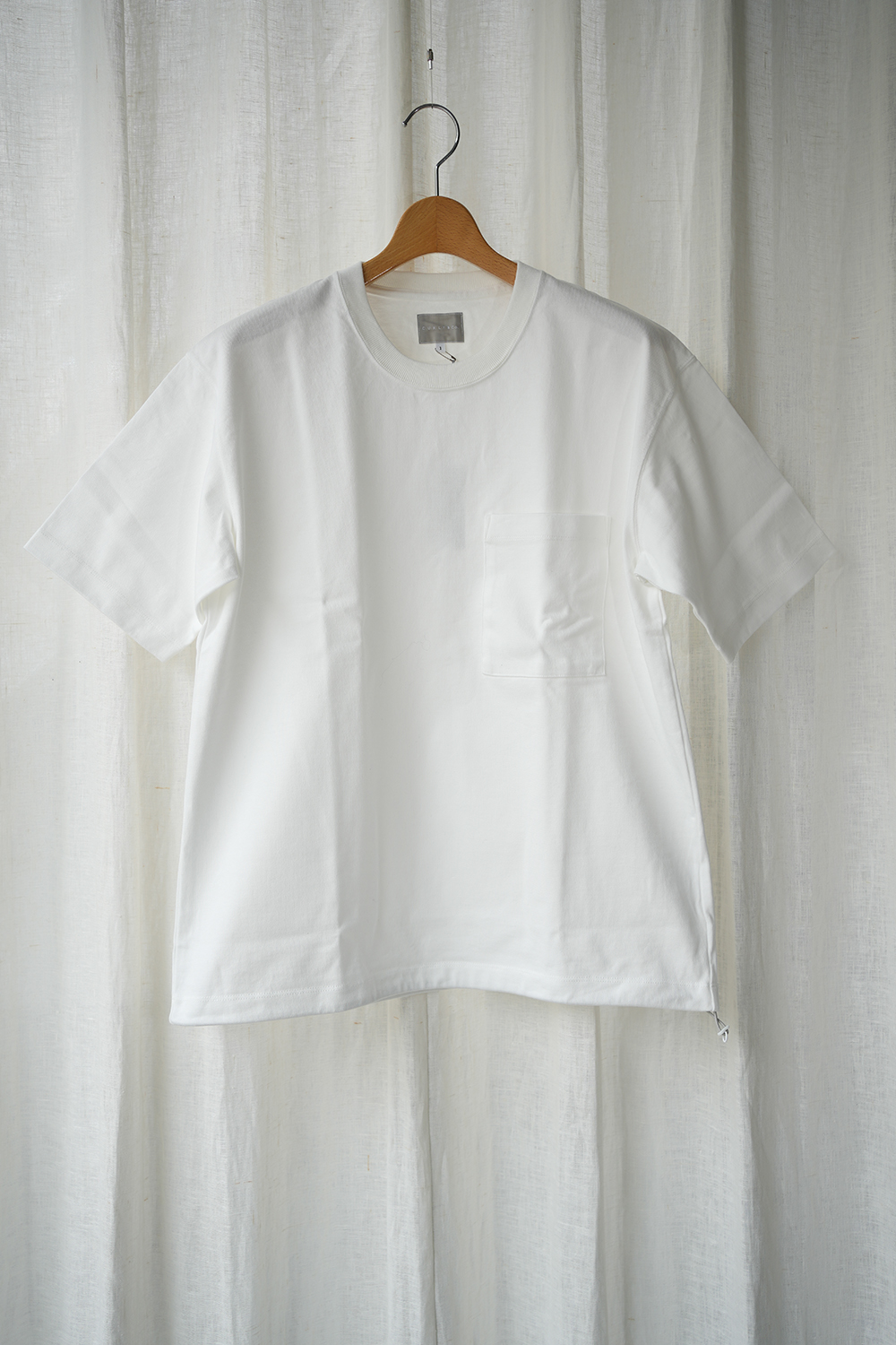 ヘビーウエイトな糸でプレーティング状に編み立てられたヘビープレーティング天竺ジャージー。適度なコシとボリュームがあるので、身体のラインを拾わずに綺麗なシルエットが出ます。また、目面の整った表面感と柔らかさも兼ね備えているので、カジュアルになりすぎずに上品に着用できます。ゆとりのあるボックスシルエットのTシャツ。しっかりと厚みがありながら柔軟性の高い風合いの生地は、無骨さと上品さを兼ね備えています。裾のドローコードで、シルエットの変化が楽しめます。