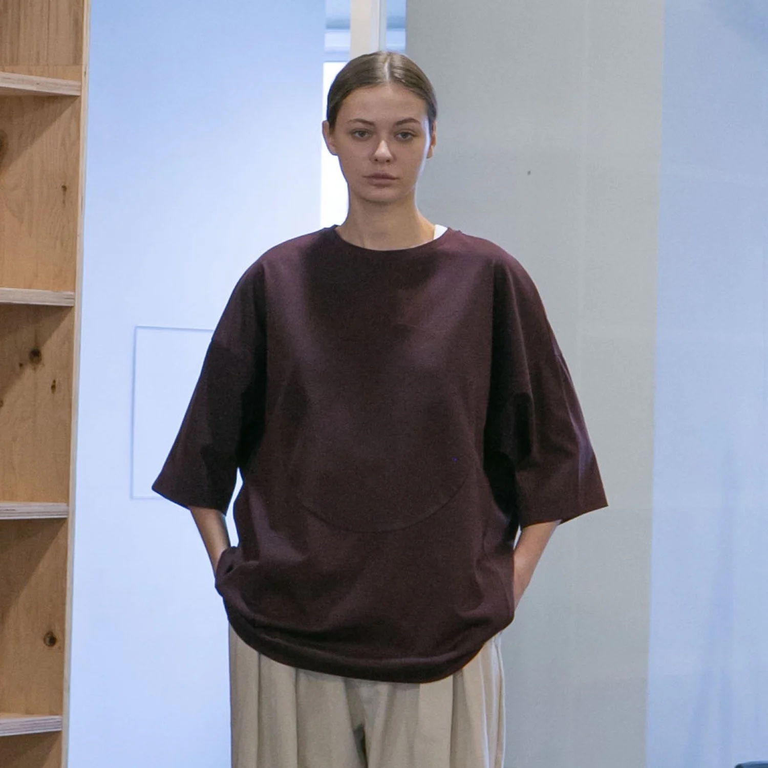 フロントのサークル状の切り替えしデザインと、両サイド裾から袖口にかけて切り替えしている立体的なフォルムが特徴のオーバーサイズTシャツ。