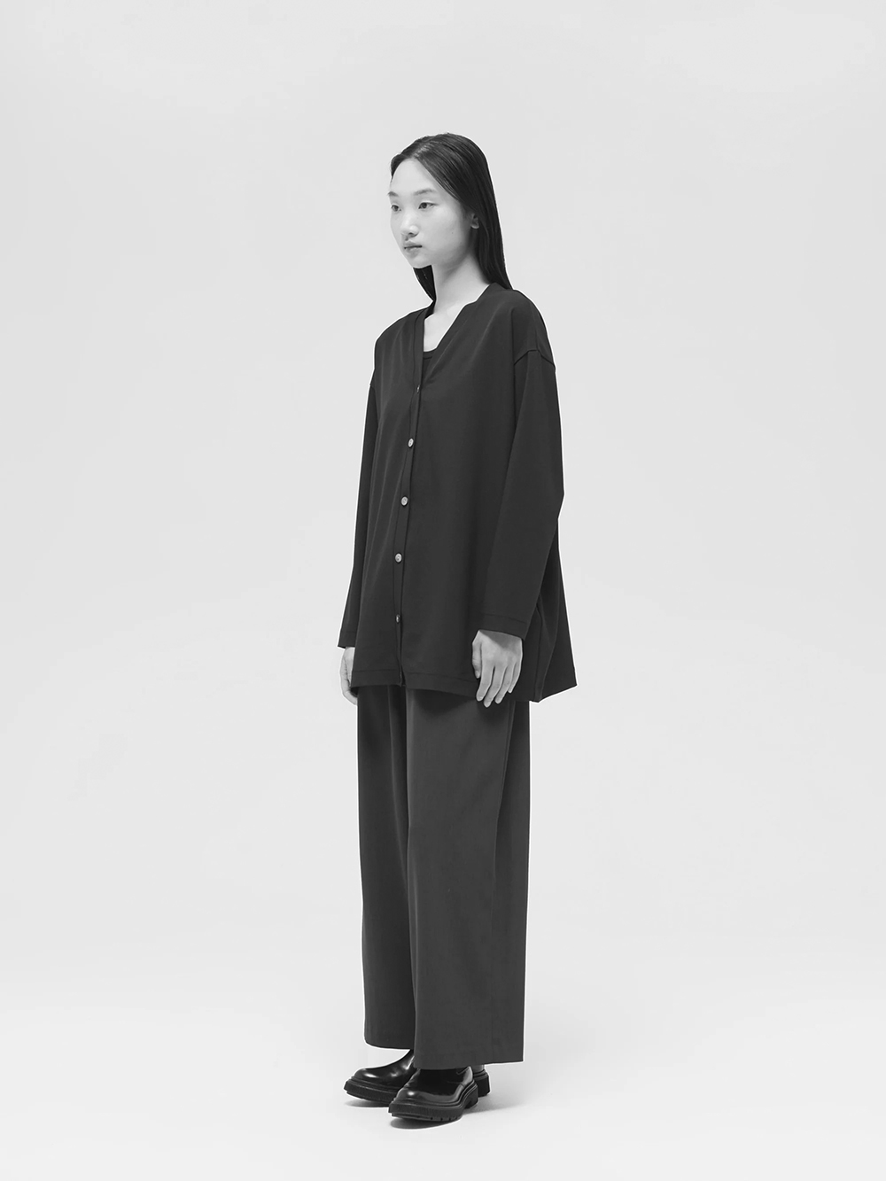 トラディショナルな羽織りアイテムとして今季おすすめのVネックカーディガン。縦横にストレッチ入りの布帛素材を使用したオーバーサイズのシルエットが特徴。カット縫製でカジュアルに着こなせる1枚です。ヒップの隠れる長めの丈やバックネック部分のVもポイントになっています。手洗い可能。ベーシックに着こなせ長く愛用していただけるアイテムとなっています。
