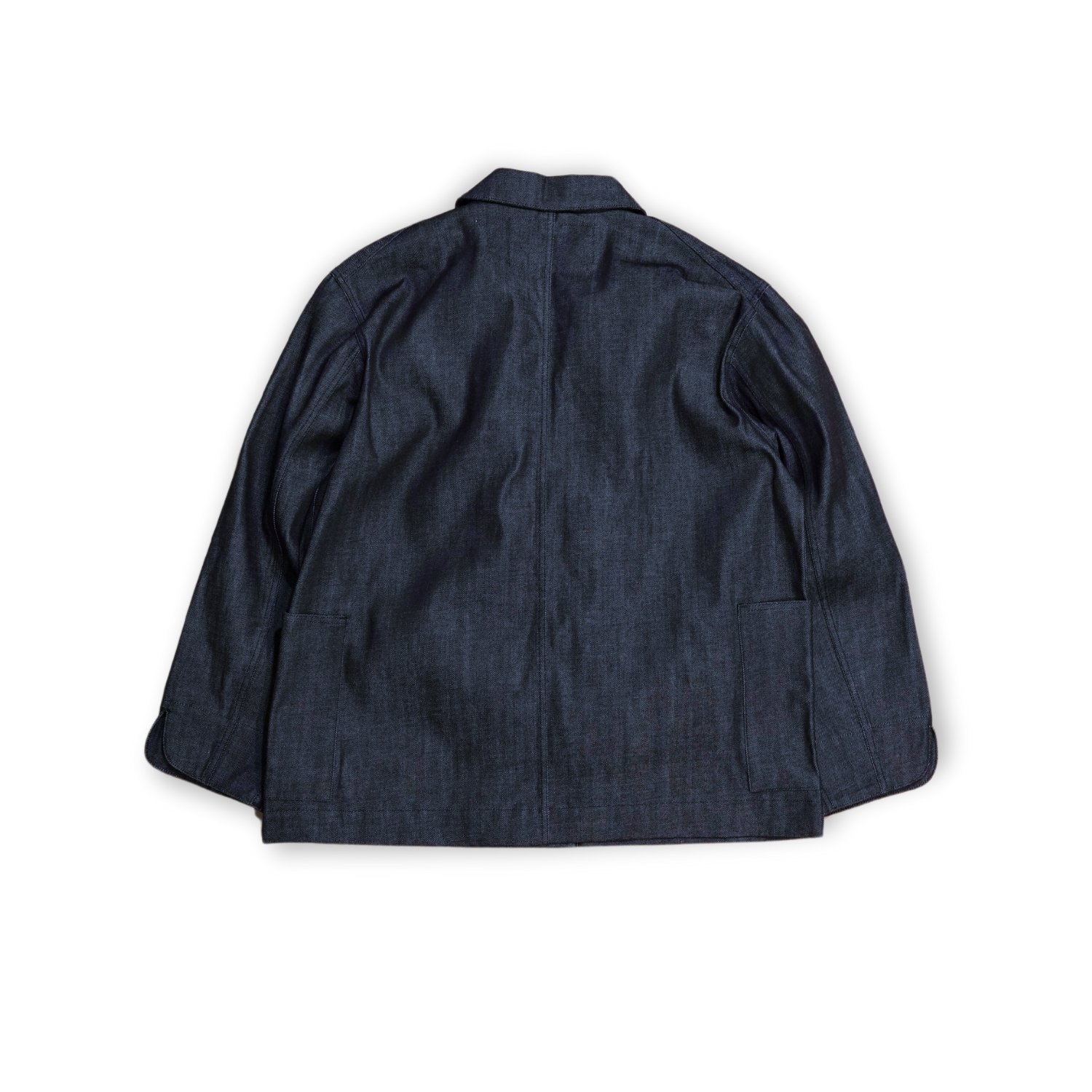 縦糸にオリジナルのムラ糸を用い、通常のデニムよりも打ち込み本数を少し減らす事でソフトに仕上げているデニムシリーズ。横糸を太番手にする事で綾立ちが良く、加工映えする生地を使用しています。広い身幅と長めの着丈、ドロップショルダーで全体的にゆったりとしたオーバーサイズシルエットのデニムカバーオールジャケット。ヴィンテージのカバーオールのディテールを取り入れつつ、シンプルに仕立てる事でカジュアルだけでなく、キレイめなスタイルにもフィットするデザインに仕上がっています。フロントのダブルになったスナップボタンもアクセントになり、ボタンの開け閉め具合によって表情が変化します。スリットの入った袖口もポイントで、長めの袖のまま着ていただいたり、一折り折り返して着ていただくのもおすすめです。