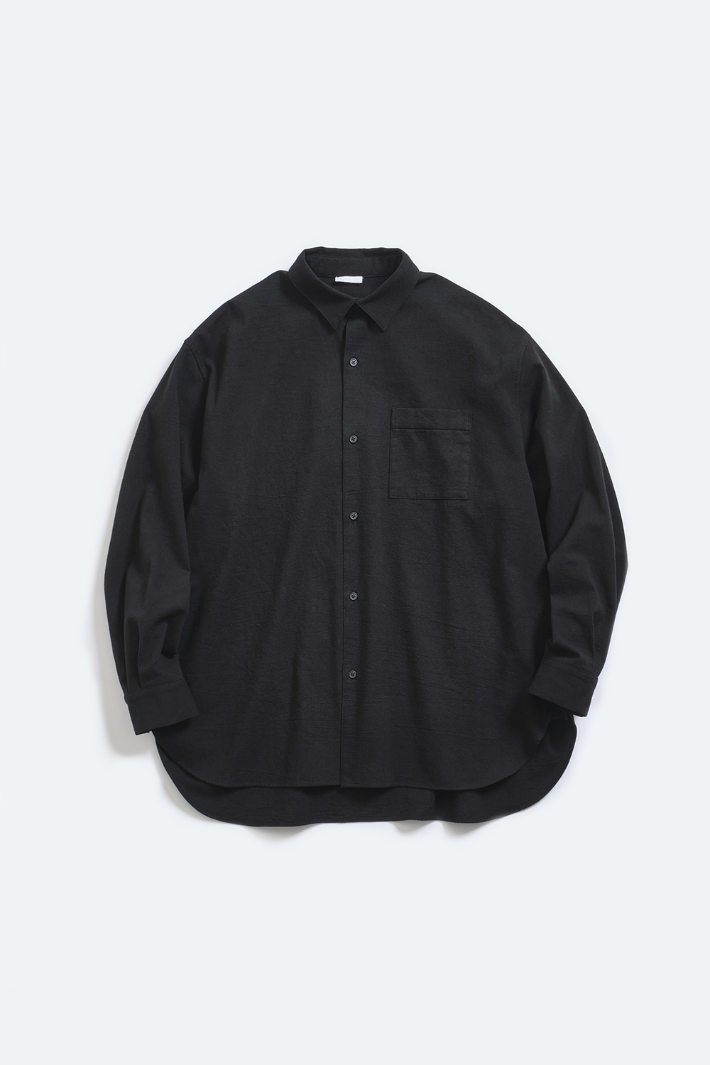 Blanc YM 定番のワイドシャツ、一見ベーシックなワイドシャツは後ろ身頃を通常より大きくとった個性的なオーバーサイズシルエット。横、後ろから見るとより生地の分量感を感じることが出来ます。シャツの範疇ながらライトアウター的な着用も可能。シンプルで良質なオックスフォードコットンをあら炊き染めと呼ばれる通常よりも遥かに小さな釜で生地を染め上げました。芯のなくなるまで時間をかけて生地を揉み込む事で肌当たりの良い独特の風合いが魅力のオックスフォード生地に仕上がります。ランダムに入るナチュラルなシワも魅力です。