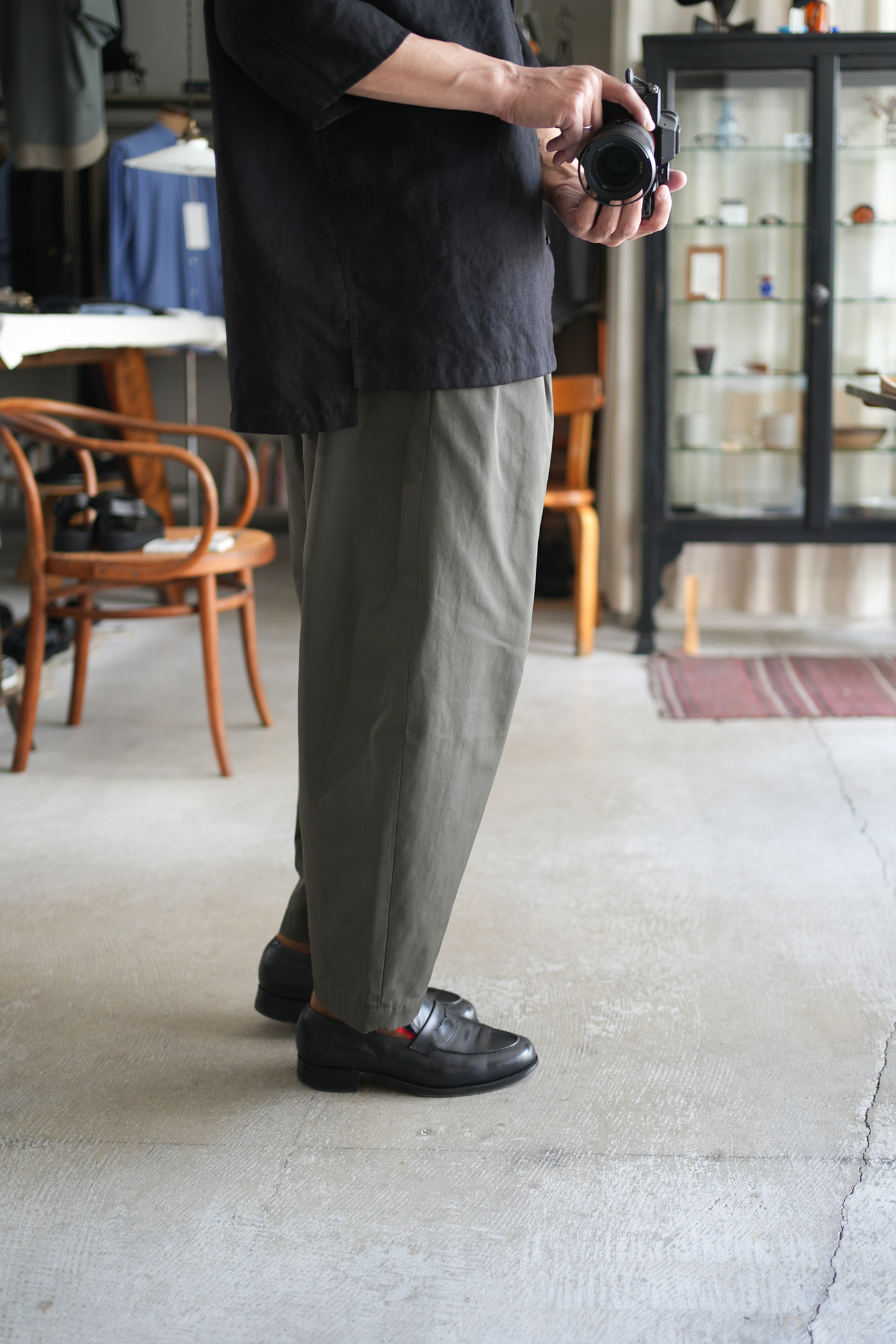 ポリエステル・コットンの綾織チノクロス生地、コットン100%生地と比べ軽量で丈夫、安定感のある扱いやすい生地です。しっかりとした生地厚ながら軽く穿き心地良し。丸みにあるテーパードシルエットパンツ、ワンタック、フルレングス。