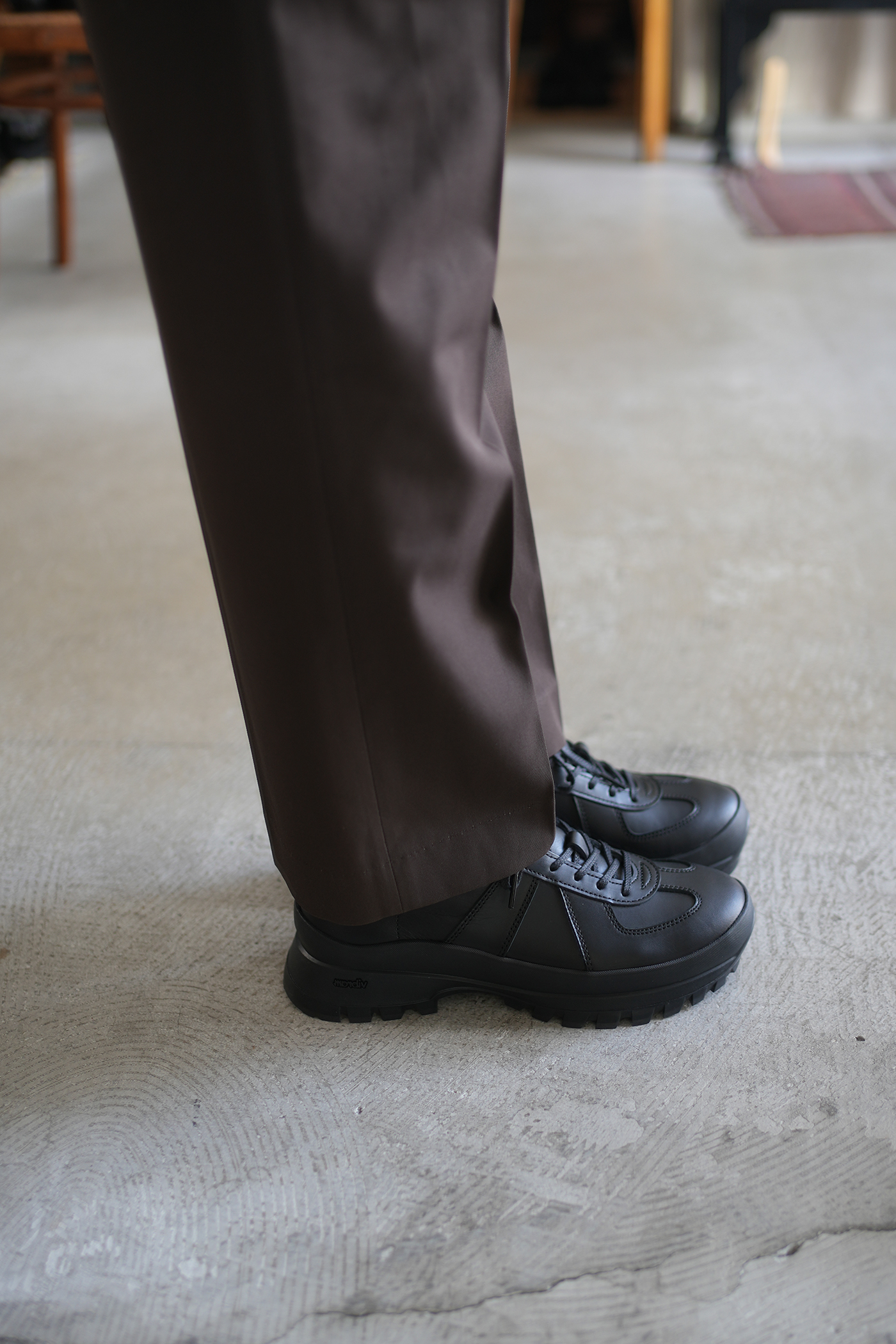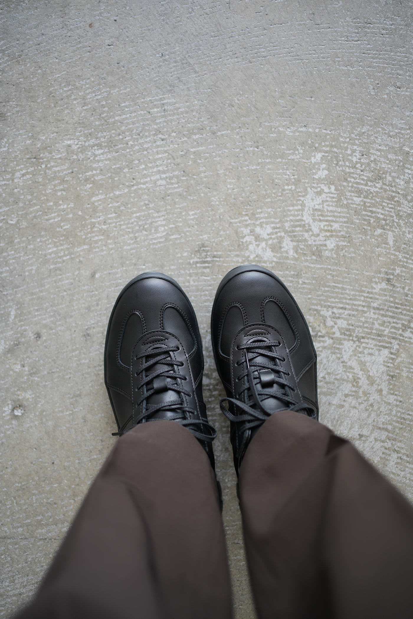 新型、オールブラックのレザーとソールのジャーマントレーナー。革靴でありスニーカーであり、従来すっきりとしたフォルムがポイントとなるジャーマントレーナーに高さのあるソールの組み合わせによるボリュームと、オールブラックレザーの引き締まり感がスタイリッシュな一足です。