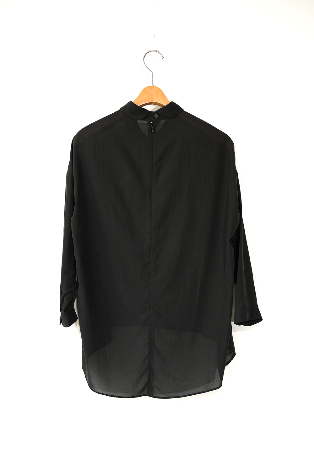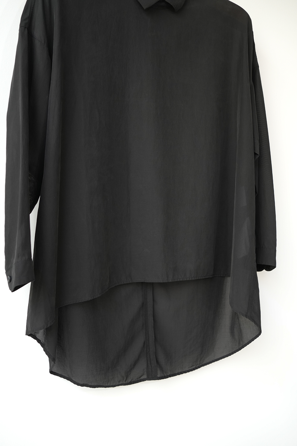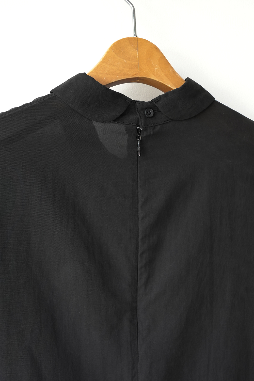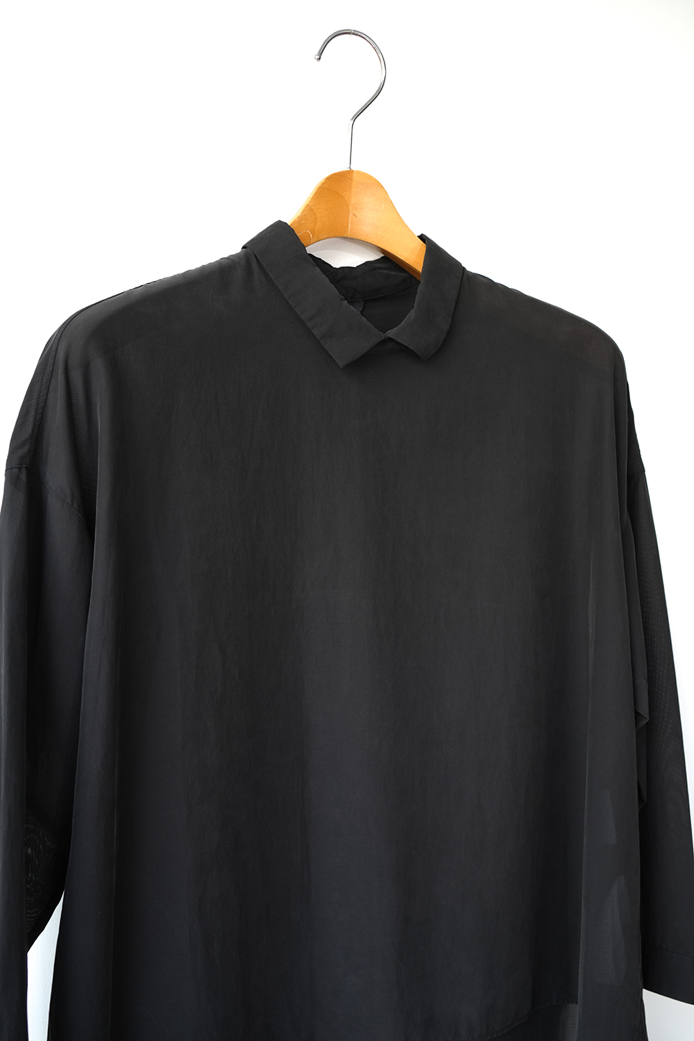 キュプラの強撚糸とコットンガス焼き強撚糸を平織りブロード生地、キュプラフィブリルの起毛感と強撚糸のドライ感が独特の風合いです。ゆったりサイズ、襟付きプルオーバー、襟後ろにコンシールファスナー、タンブラー乾燥済み。