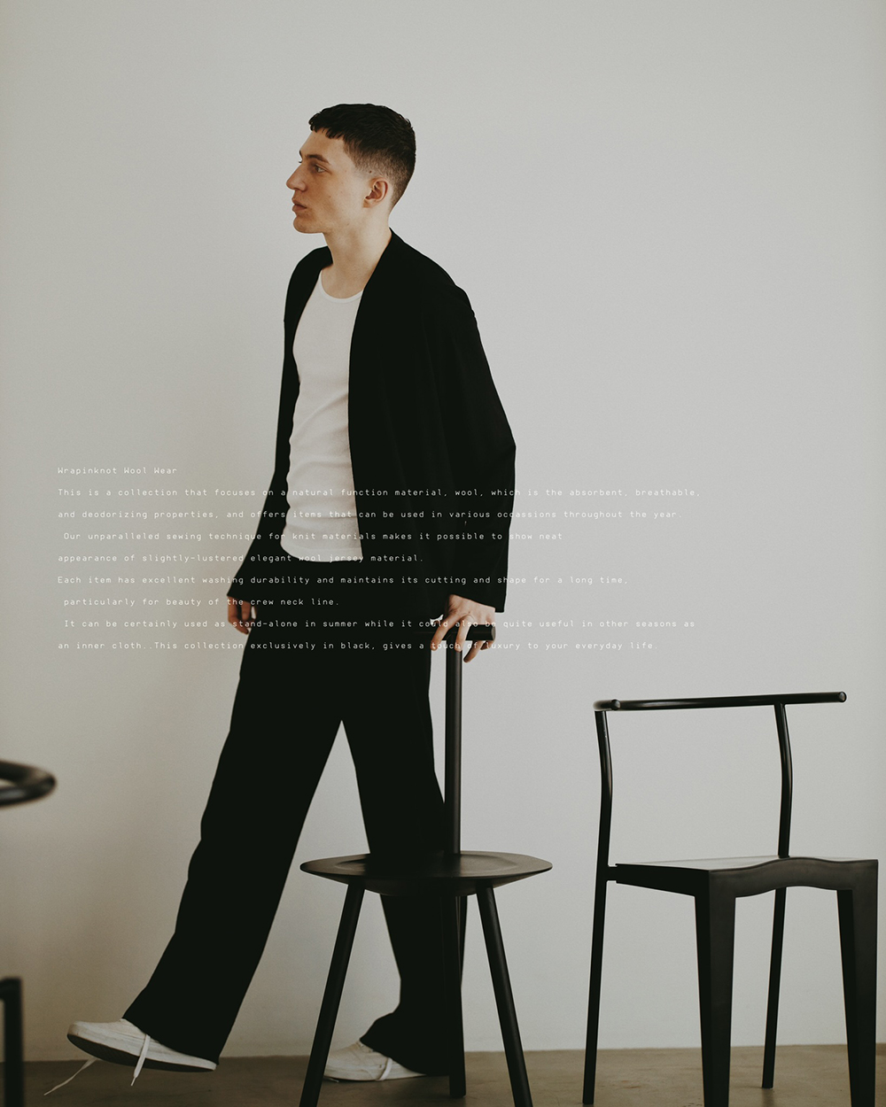 メリノウール100%生地を使用したボタンレスカーディガン。少し肩を落としたボクシーなシルエット。生地の上品な光沢とボタンレスのモダンなデザインがTシャツや、シャツはもちろん、ドレッシーなスラックスとの着合わせにも最適。天然の機能素材であるウールの吸放湿性や消臭性に再着目し、年間を通じて様々なシーンで使えるアイテムに落としこんだウールウェアコレクション。微光沢のある上品なウールジャージー素材を、その類稀なニット素材の縫製力を活かして端正な顔つきに仕立てている。各アイテムには洗濯耐久性があり、その美しさを長く損わず、中でもクルーネックのラインの美しさには定評がある。