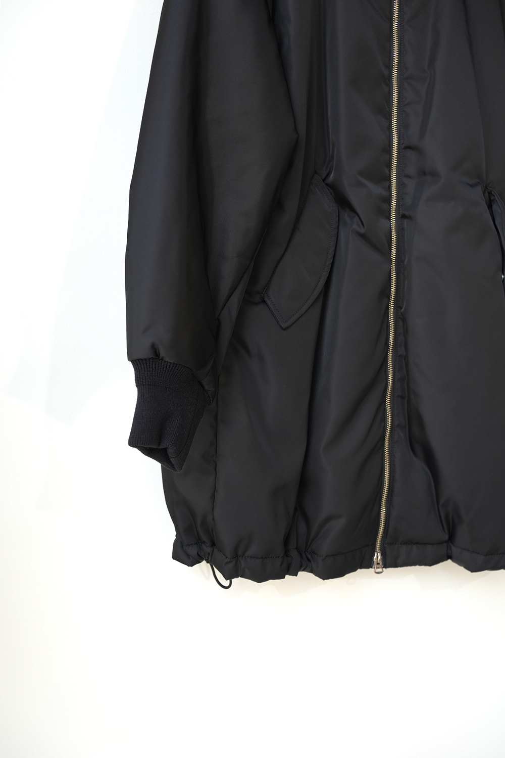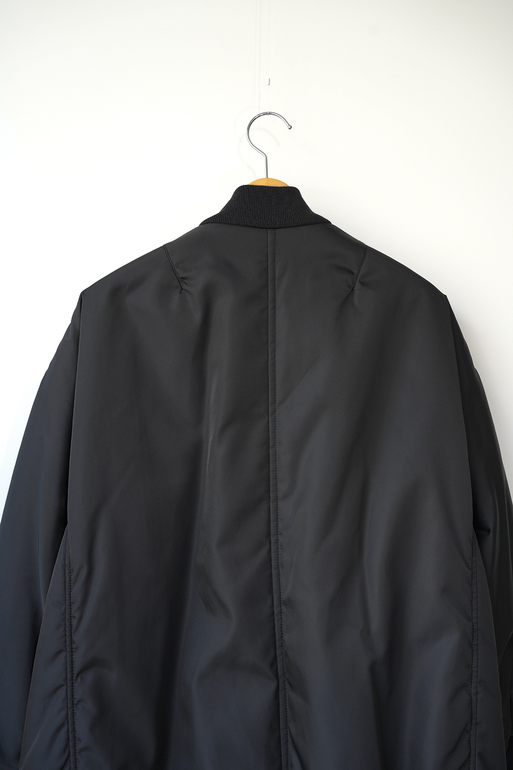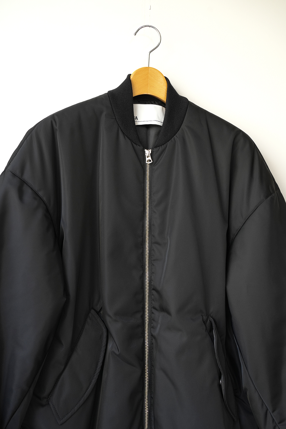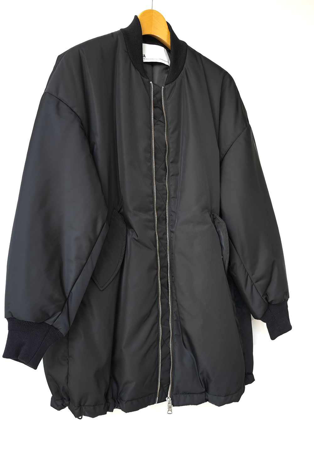 MA-1シリーズから新作のミドル丈モデル、少し丈の長いチュニック丈が合わせやすい新しいバランス。歴史あるミリタリーアイテムをモードな印象に、裾のコードを絞ってコクーンシルエットにすれば、よりモードな印象に。リラックス感のある着心地ながら、大人のきれいめカジュアルを叶える一枚です。パンツスタイルにもスカートにも合わせやすく、端境期の軽やかな羽織として活躍します。アームホールも深いので中にも着こめるのも嬉しいポイント、リサイクルナイロンを使用した他に類をみないほど高密度に織ることで奥行きのあるマットな光がある色の美しさと絶妙なハリ感としなやかさのバランスが良く色気のある表情が特徴の生地。