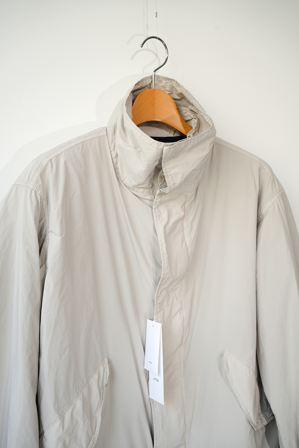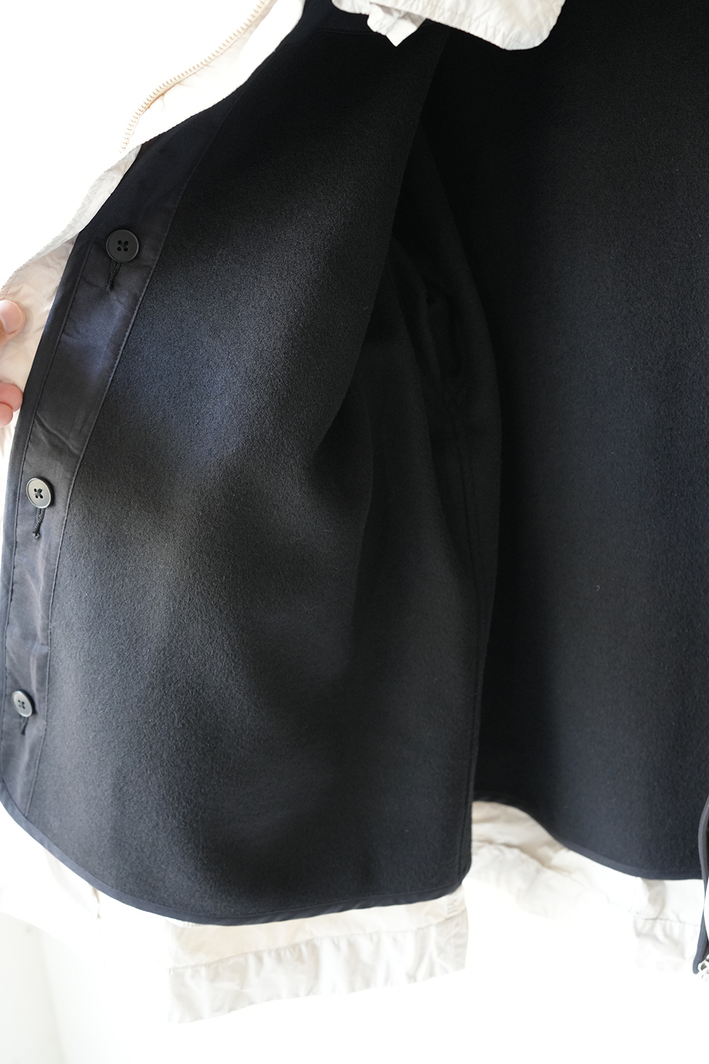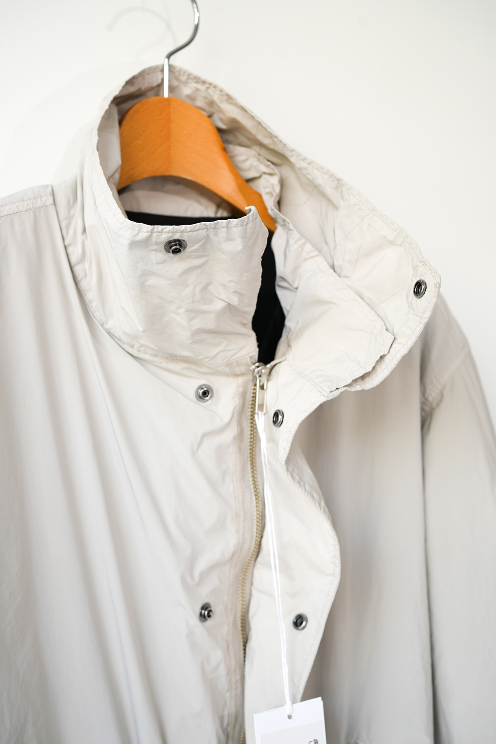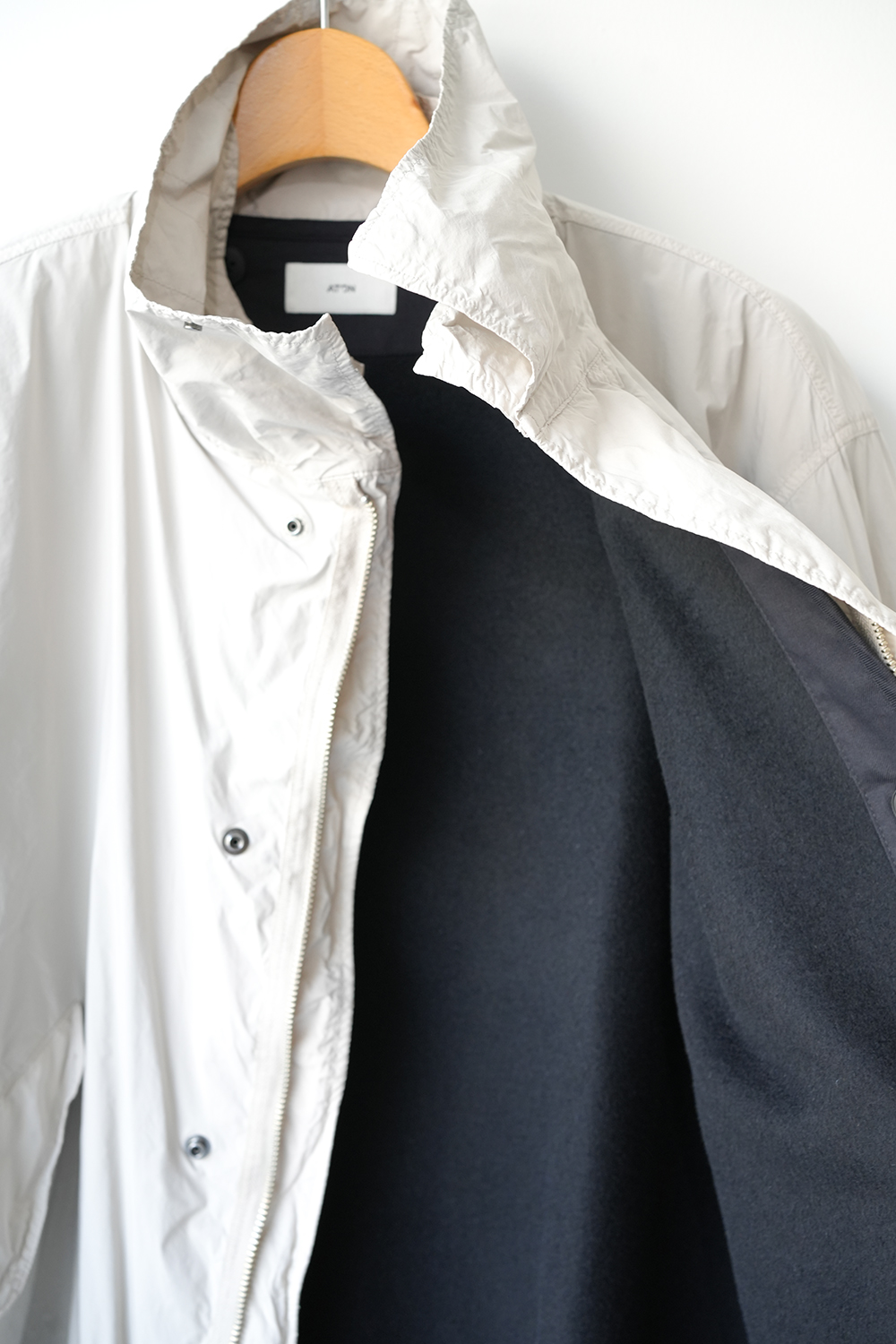 アメリカ軍のM-65モッズコートをベースにしたショートコート。フードを取り、裾を横方向にスパッと切ったようなデザインで、ブルゾンのような丈が新鮮なショートコートです。また、高密度のナイロンの表地、ライナーにはウール混の生地を使用し、真冬でも温かく着ていただけます。シワになりにくく、持ち運びにも便利で、ライナーを取り外すと3シーズン活躍してくれるアウターです。ナイロンとポリエステルの熱収縮率の違いを生かし、環境の変化により表情が変わっていく様を楽しむことのできる、天然繊維のような糸を使用し、石川県能美市にて高密度に織り込むことにより、独特の風合いを表現した素材です。製品染めで仕上げ、撥水加工を施しています。ライナーはしっかりと保温性が伴うので、真冬でも着用することができます。