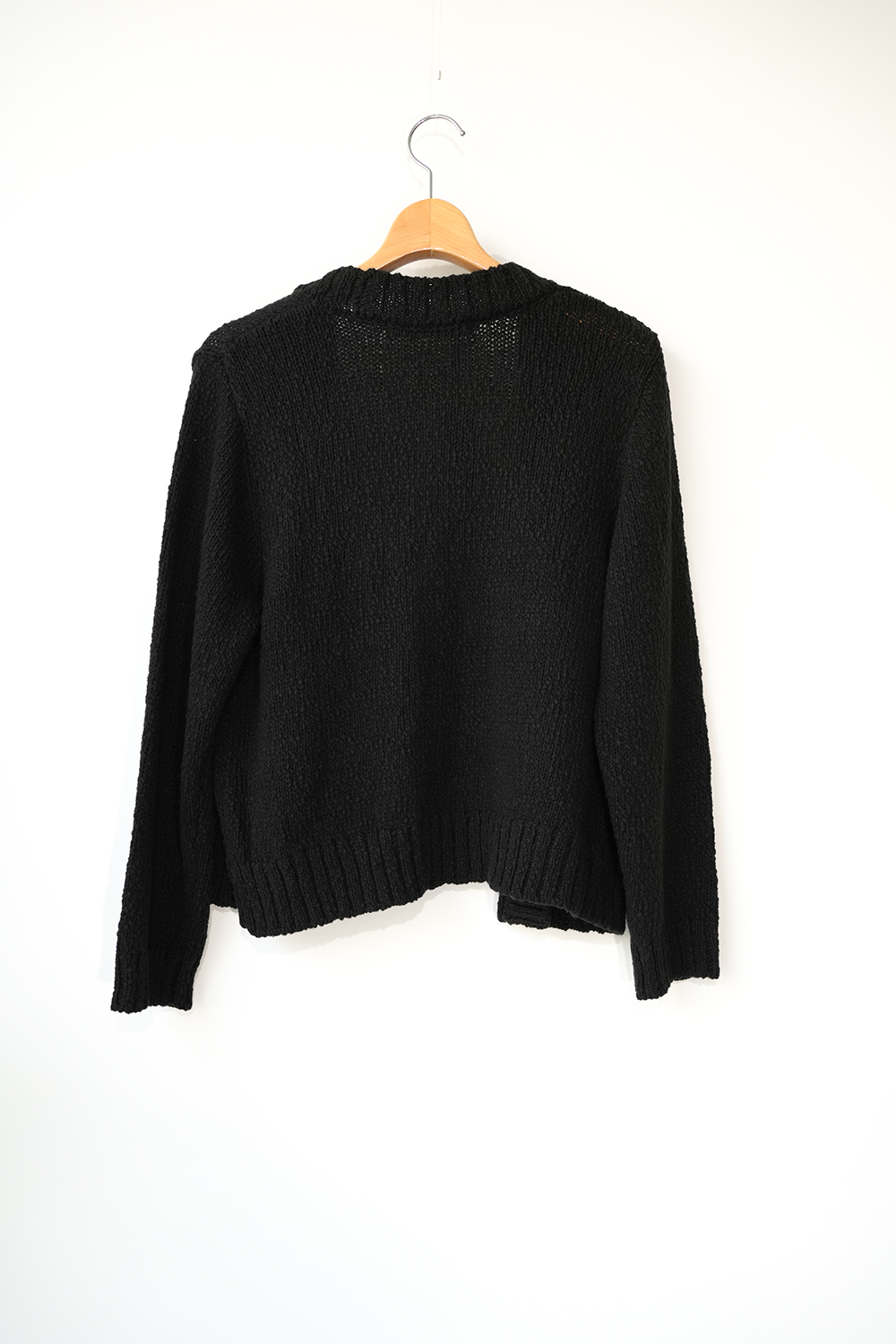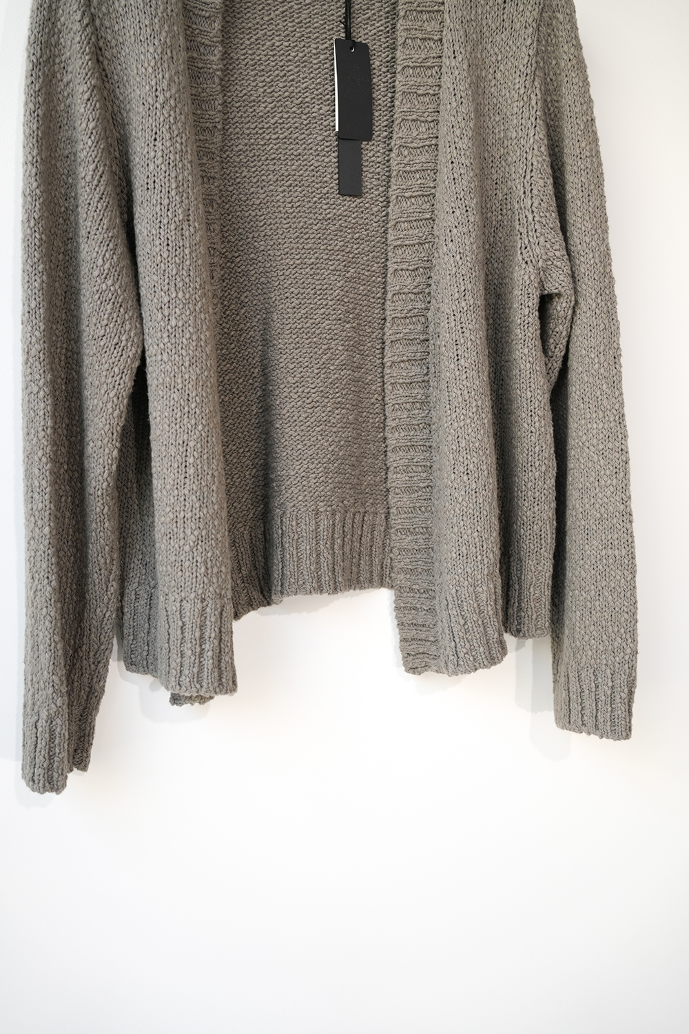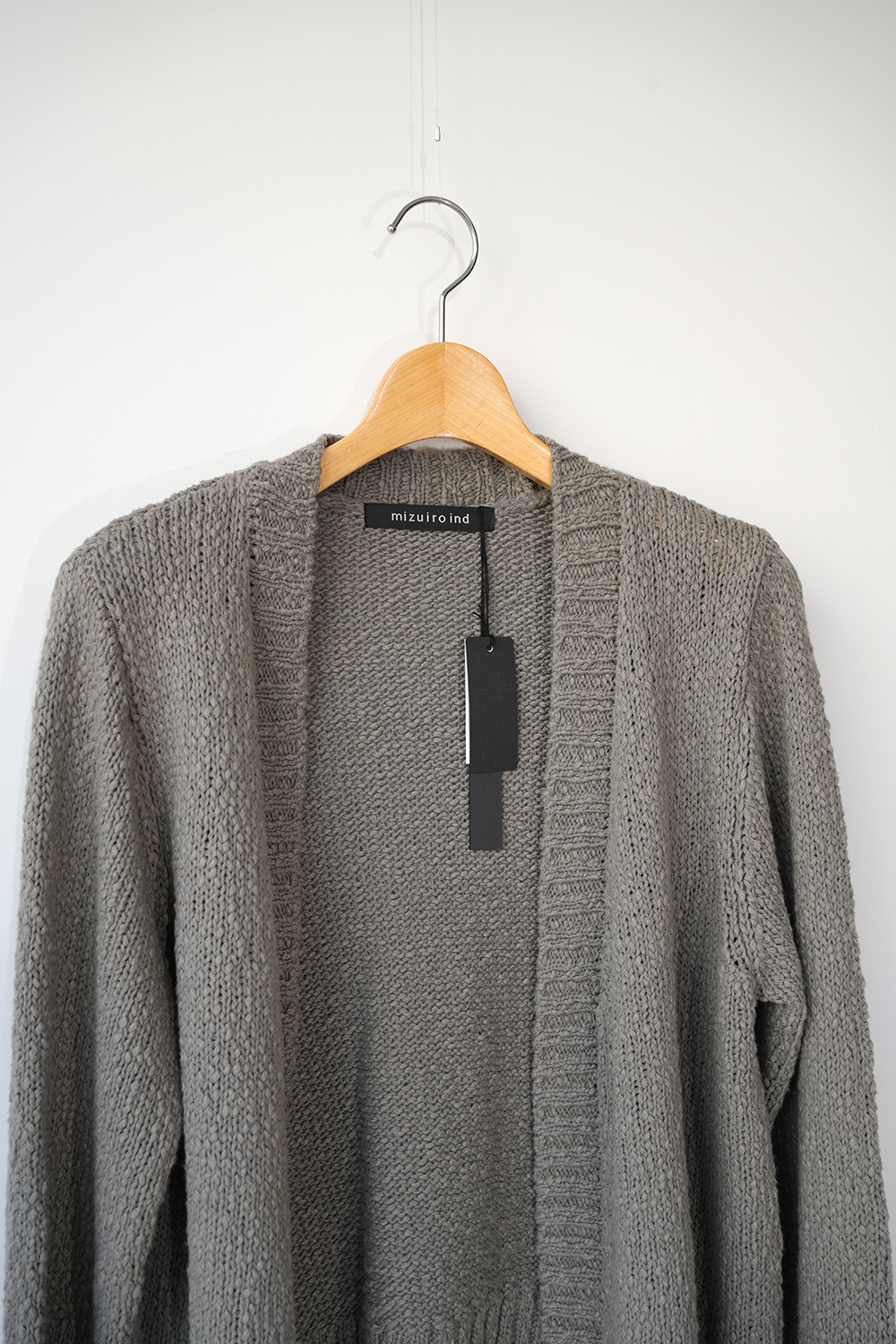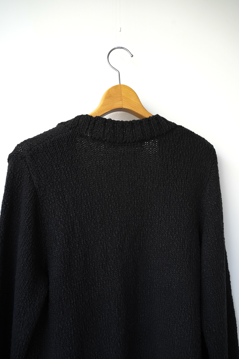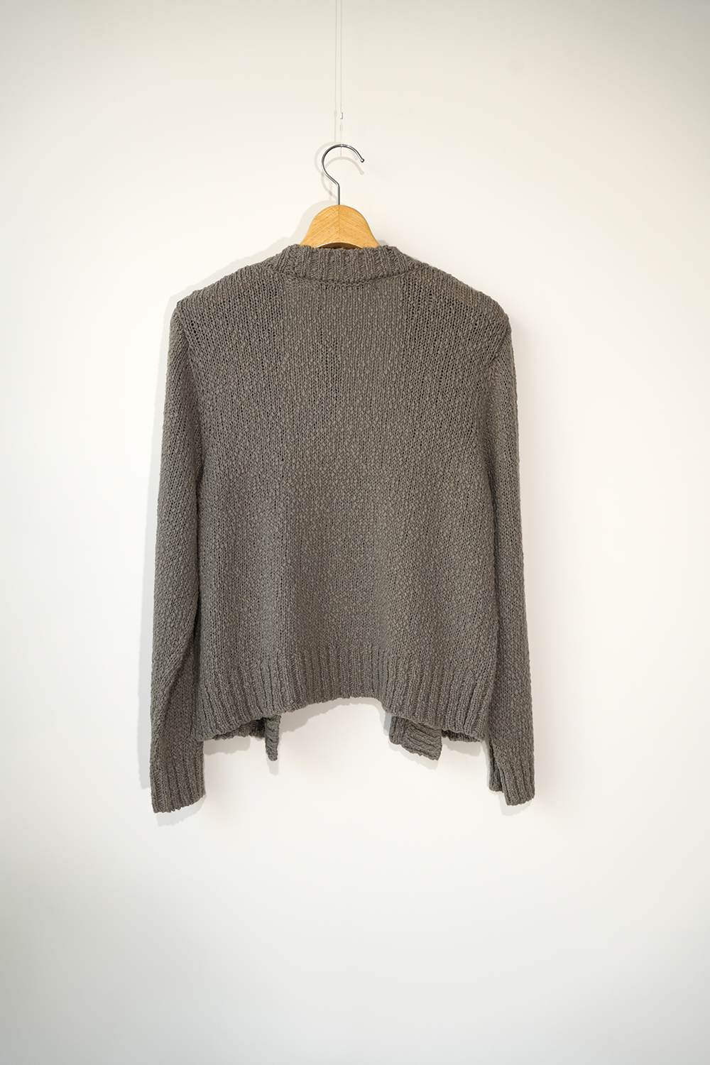 肉厚で表面にぽこぽことしたスラブ感のある風合いが特徴のカーディガンです。ボタンのないオープンスタイルで、軽やかに羽織ることができ、前身頃のリブデザインがさりげないアクセントとして着こなしに奥行きをプラスします。ジャストな丈感でボトムスを選ばず合わせやすく、ほどよくワイドなシルエットがリラックス感と女性らしい柔らかさを演出。素材には適度な厚みのあるコットンニットスラブを使用しており、シーズンを問わず着用できる使い勝手の良さも魅力です。