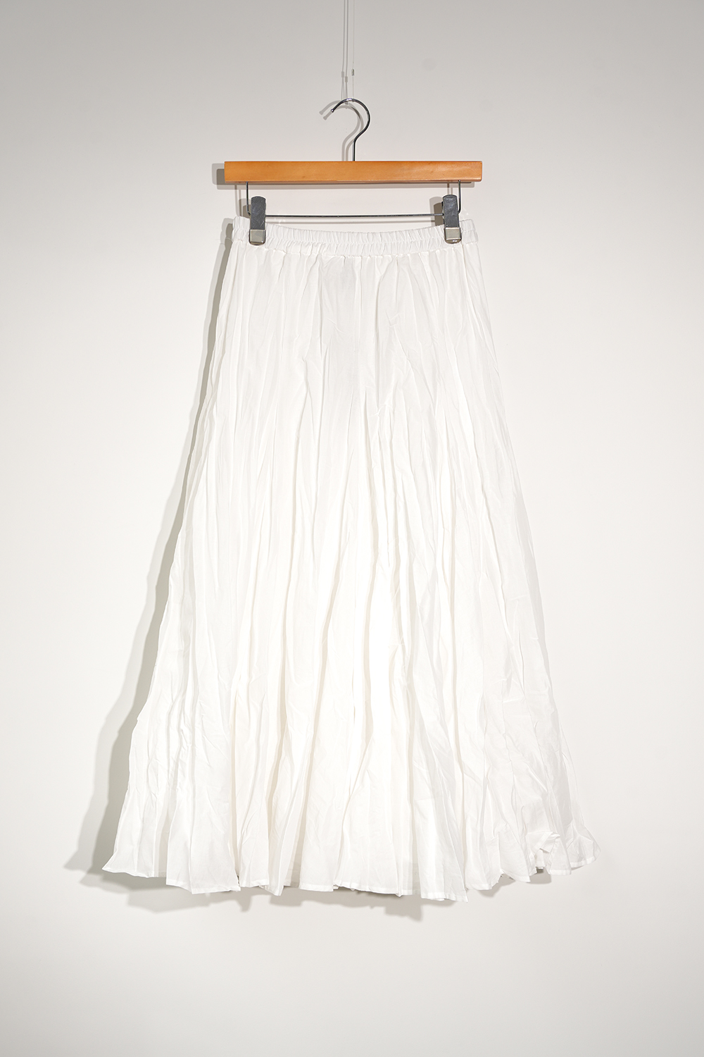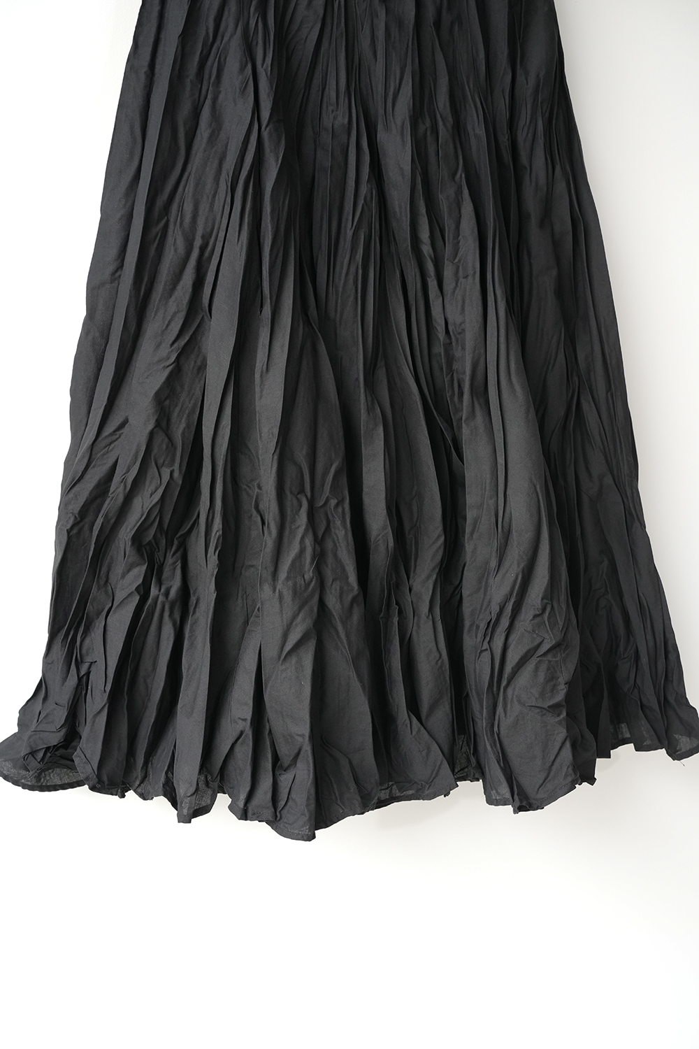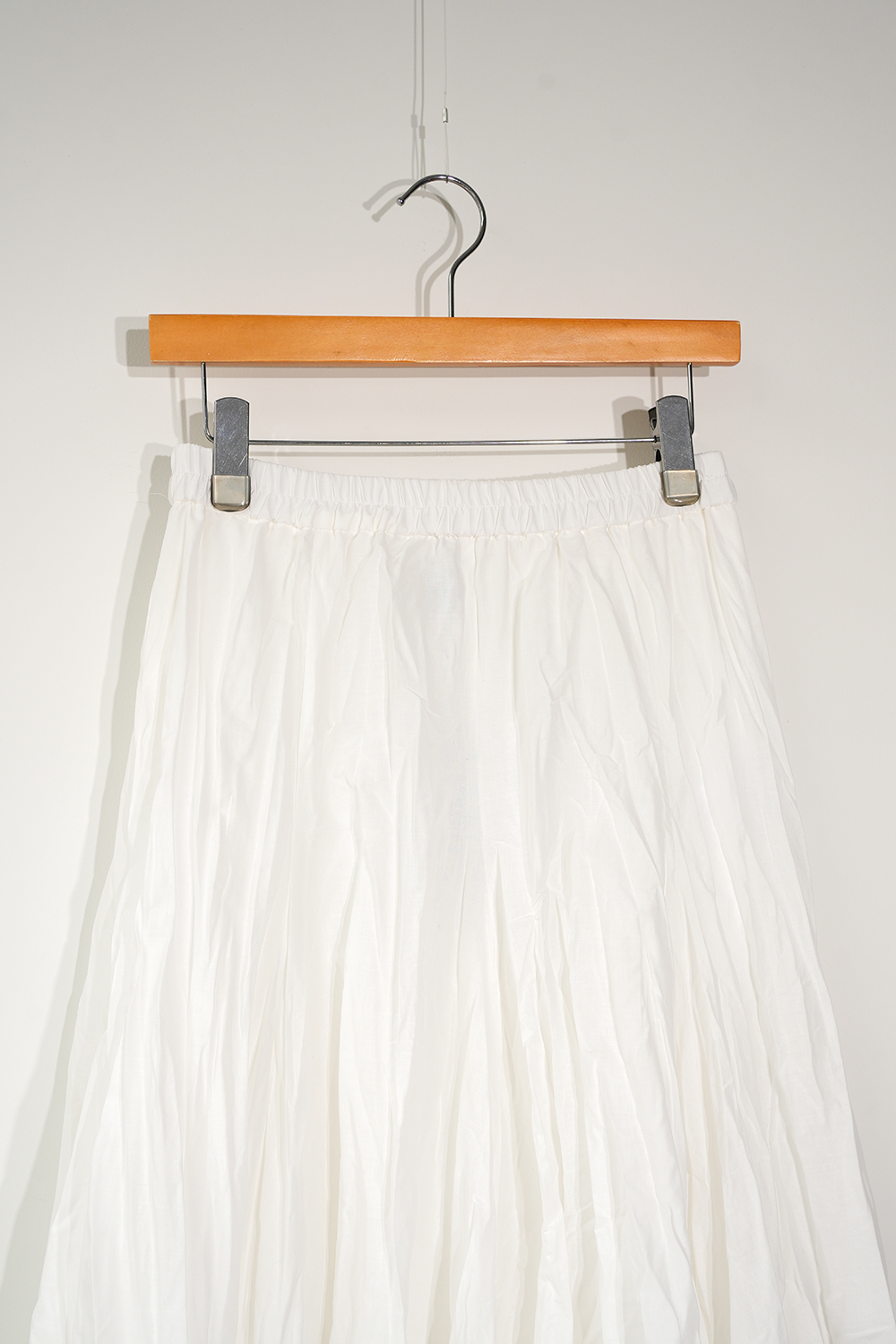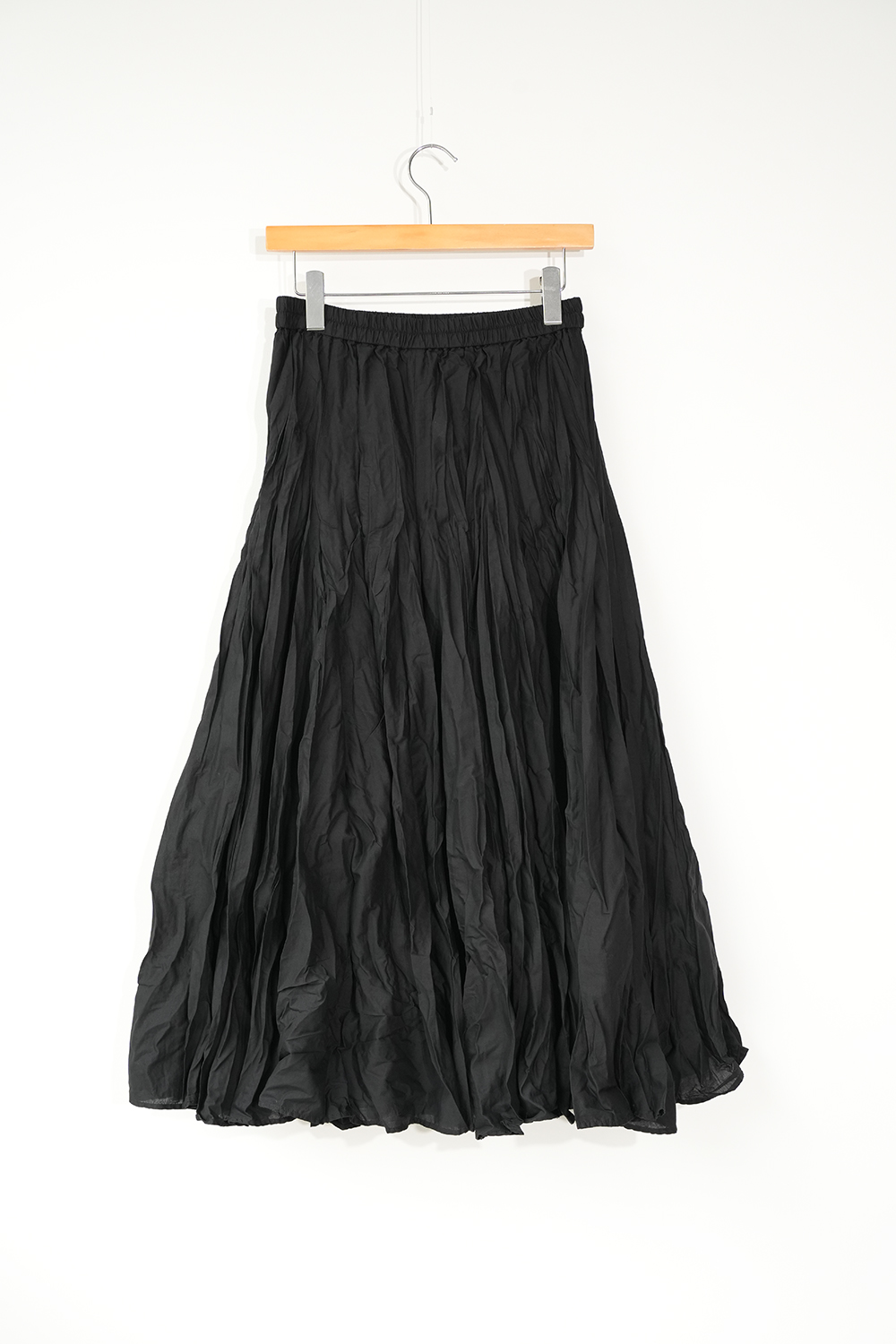 コットンローンを使用したボリュームフレアスカート、裾にかけボリューム感があり女性らしいフレアラインが魅力の1枚。シワを全体に施した雰囲気のあるデザインで入荷の際はあえてねじり巻いた状態になっているほど。お洗濯後もねじって収納してOK。同色の裏地が付いているので透け感も気にせず穿いていただけます。フレアなシルエットでコットン素材なのでオールシーズン活躍できるのもポイントです。
