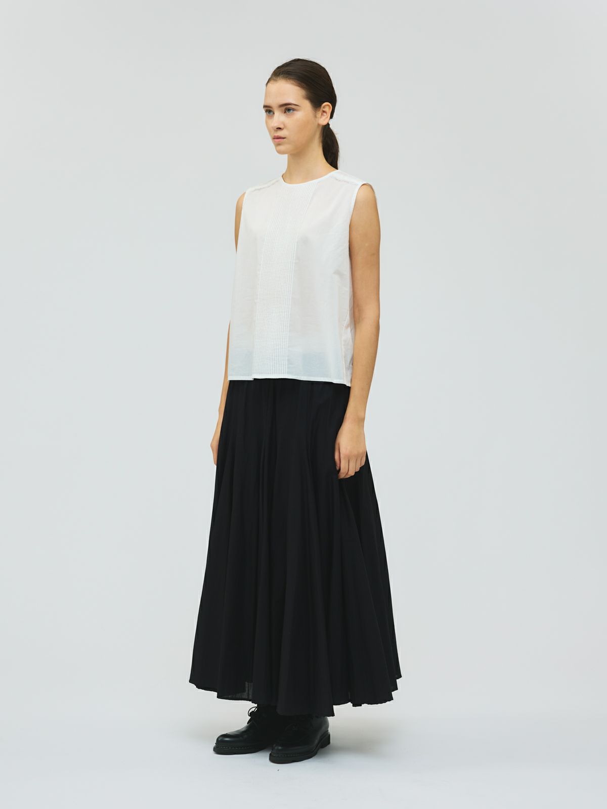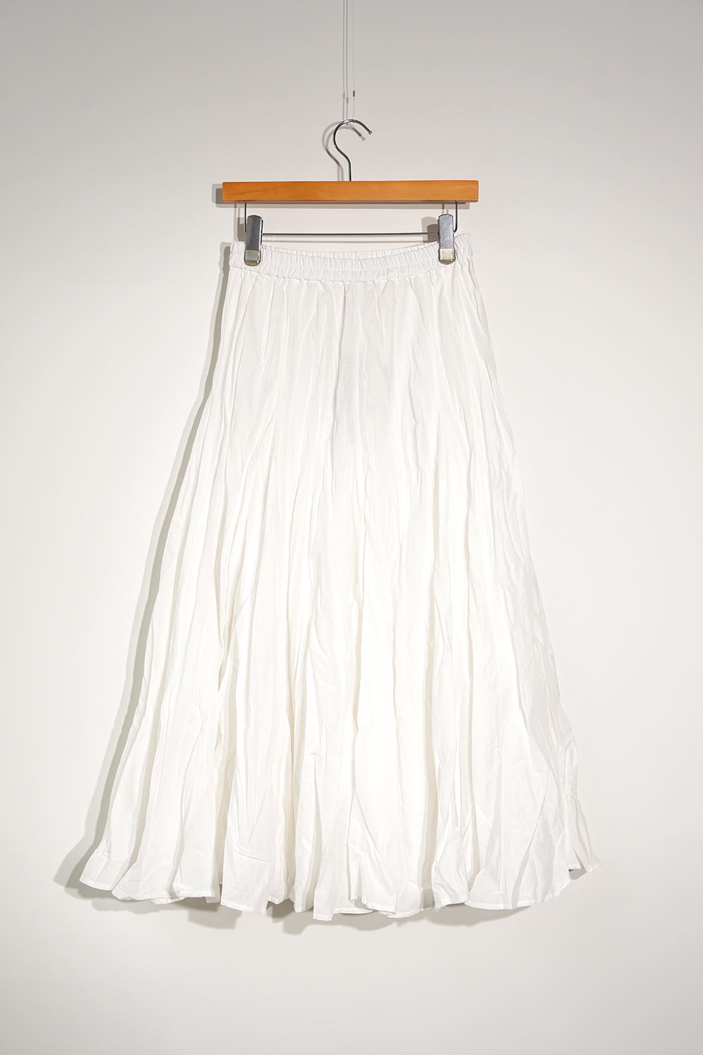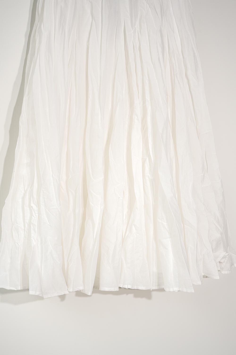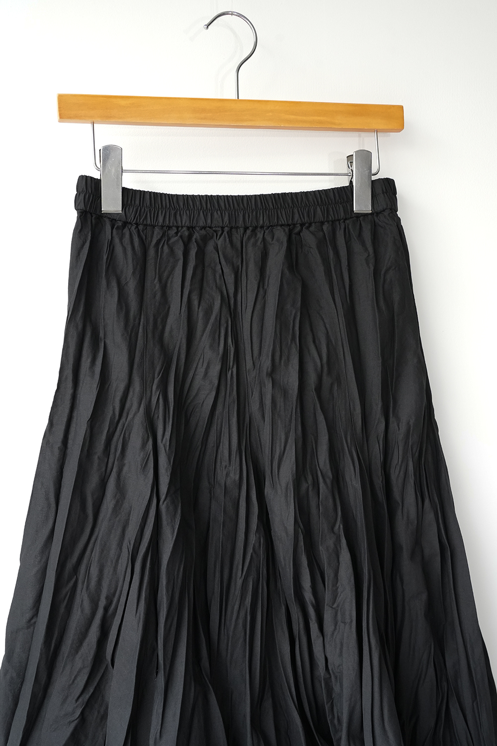 コットンローンを使用したボリュームフレアスカート、裾にかけボリューム感があり女性らしいフレアラインが魅力の1枚。シワを全体に施した雰囲気のあるデザインで入荷の際はあえてねじり巻いた状態になっているほど。お洗濯後もねじって収納してOK。同色の裏地が付いているので透け感も気にせず穿いていただけます。フレアなシルエットでコットン素材なのでオールシーズン活躍できるのもポイントです。