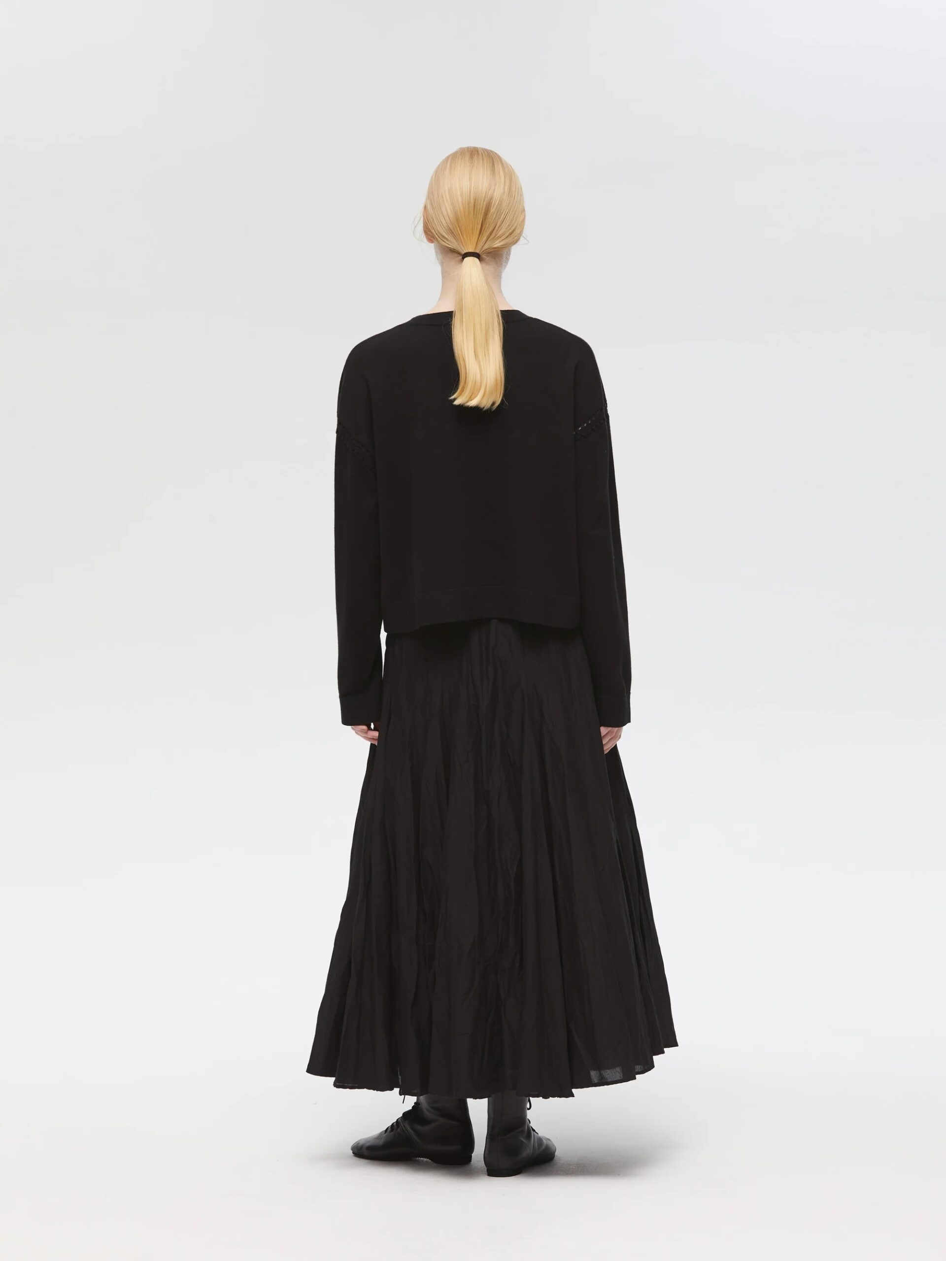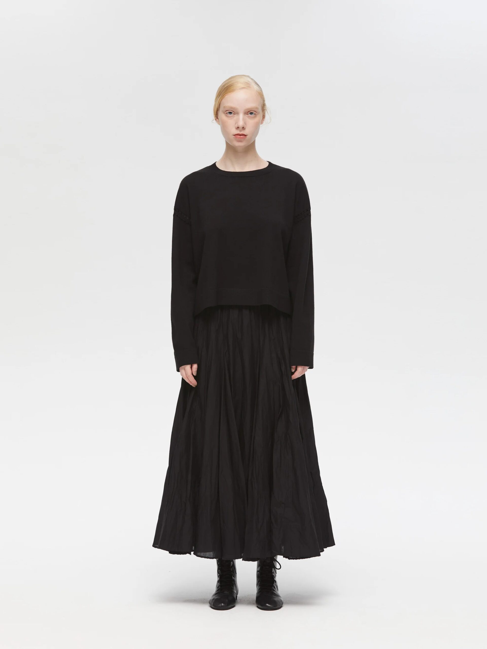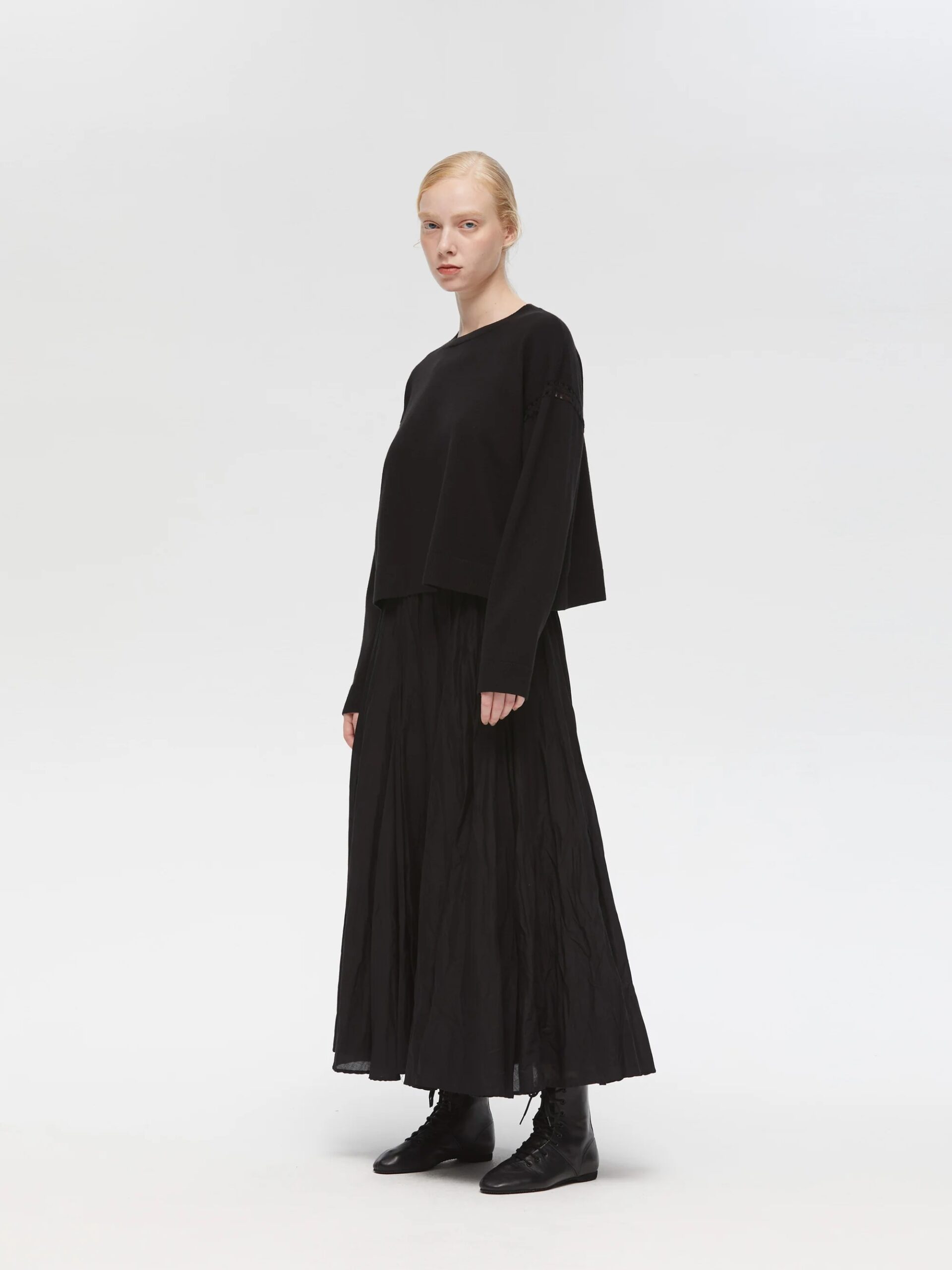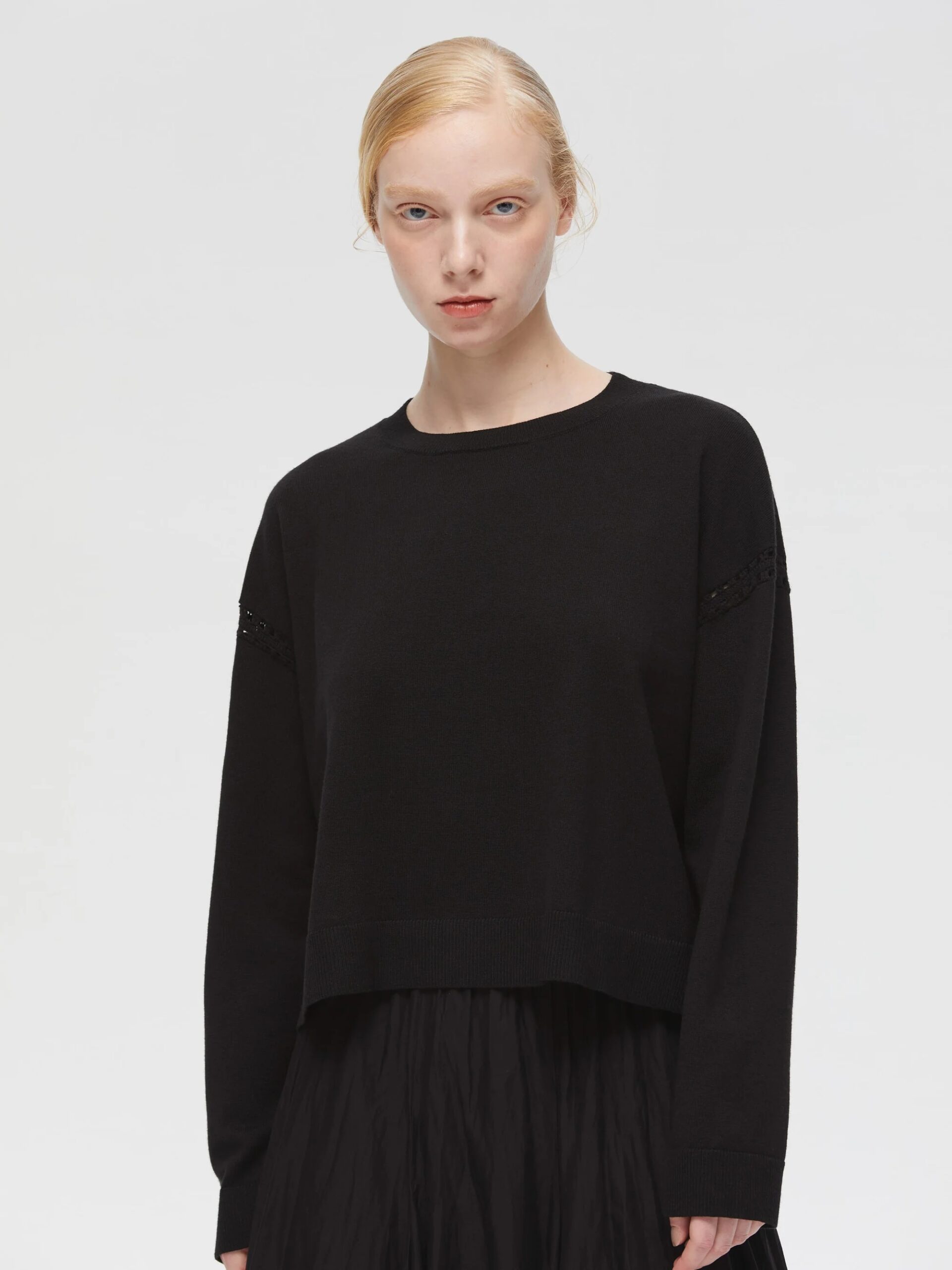 袖部分に施されたかぎ針編みが印象的なデザインニット。ベースはウール混のハイゲージニットで、シンプルながらも編み地のアクセントがポイントに。ワイドでやや短めの着丈はボトムとのバランスが取りやすく、ワイドで長めに設計された袖が落ち感のあるシルエットをつくり出し、リラックスした雰囲気を演出。ワイドパンツやスカートなど、ボリューム感のあるボトムスと好相性で、上品な抜け感を演出できる一枚。ほどよい厚みで軽やかな着心地のため、秋口から春先までロングシーズン活躍します。しなやかで柔らかな肌触りの生地感も魅力。