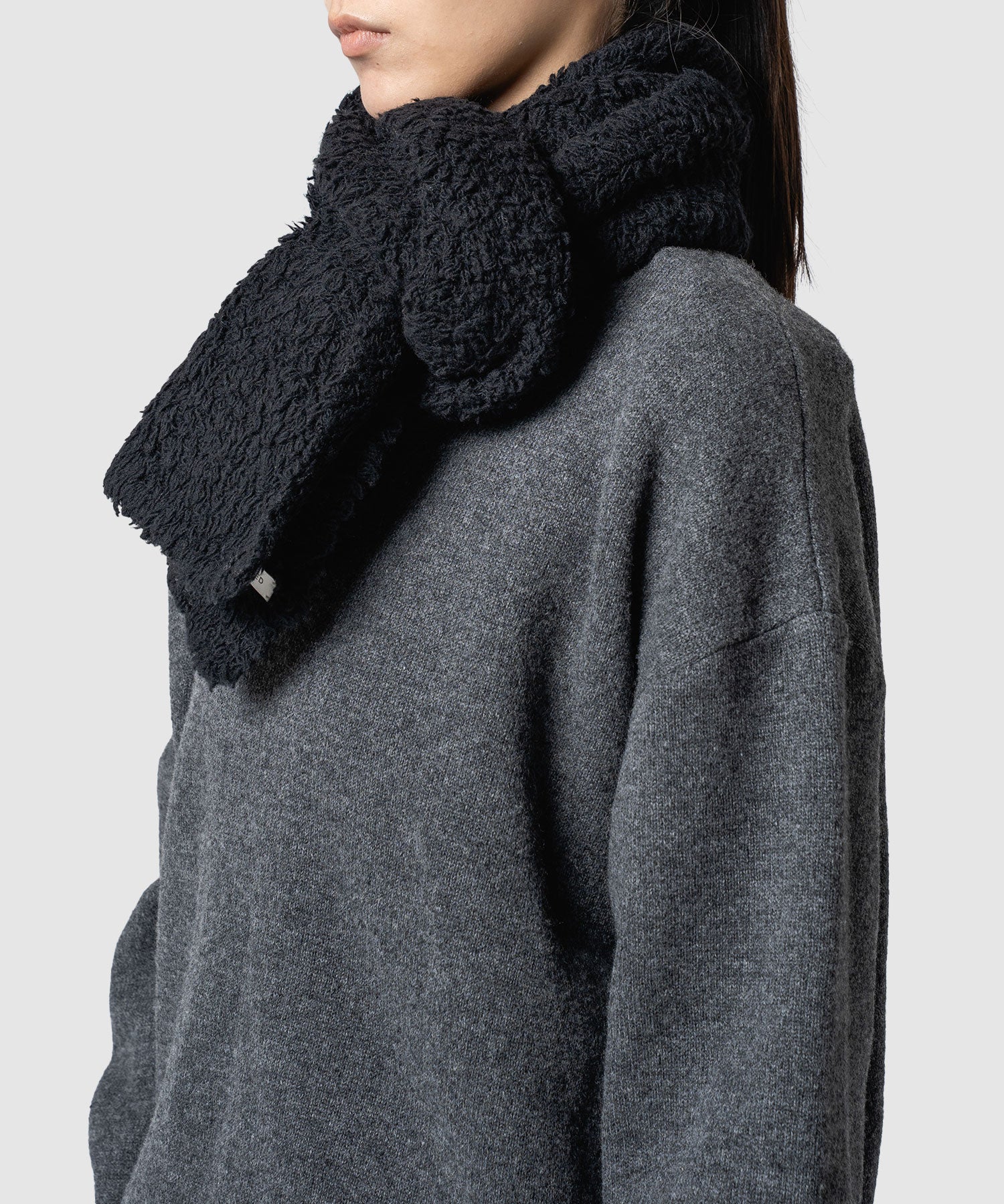 オーストラリアのメリノ種を原料に、生後6ヶ月以内に採取したラムウールのみを使用しています。19.5μの極細繊維をあえて紡毛紡績で膨らませ、太糸でも柔らかく、軽量感があり、肌触りの良いしなやかな肌感が特徴です。同糸をさらにモール状に加工を施し、毛を立たせファーのような風合いに仕上げました。