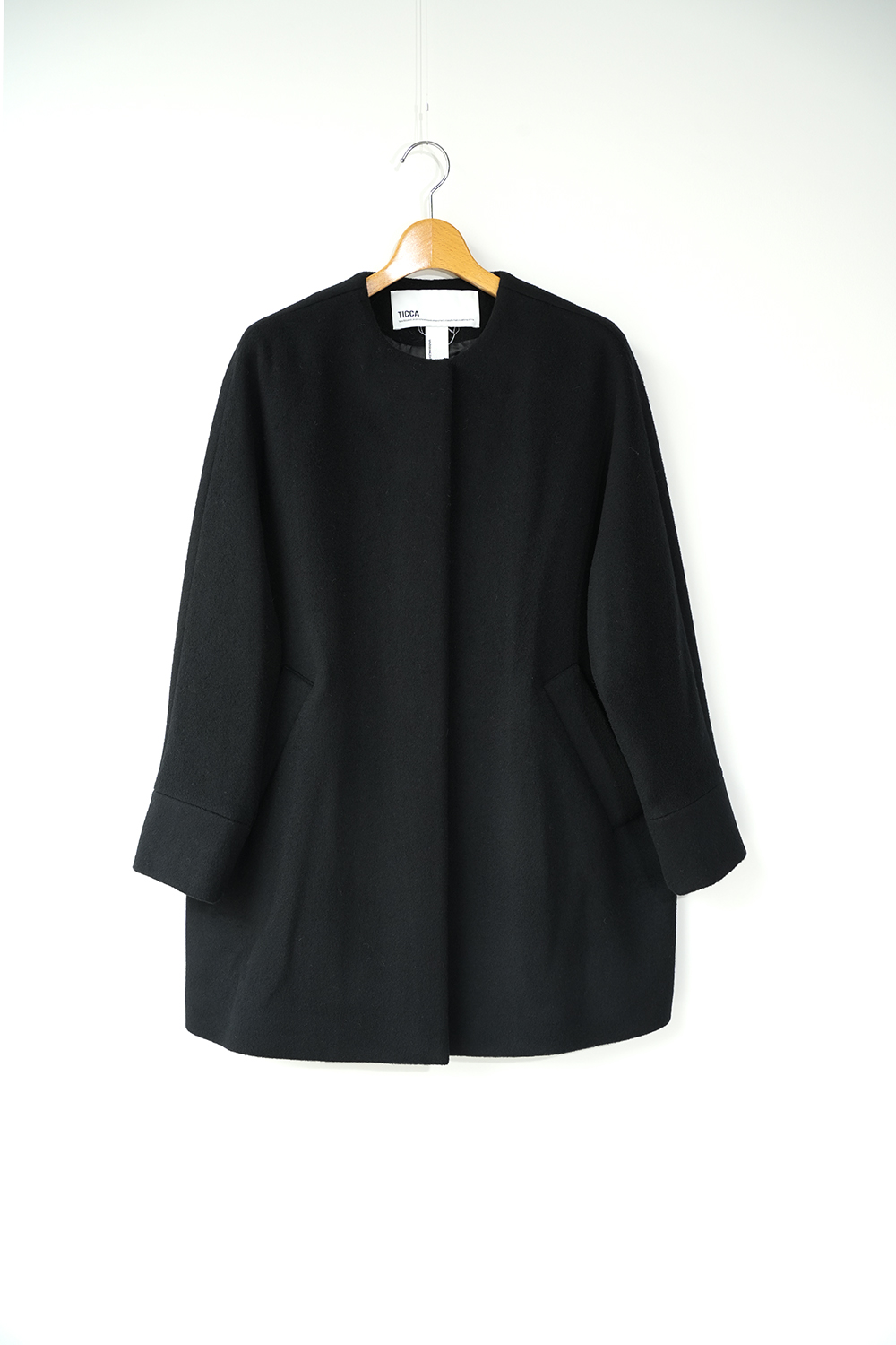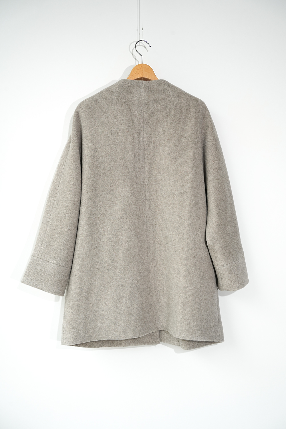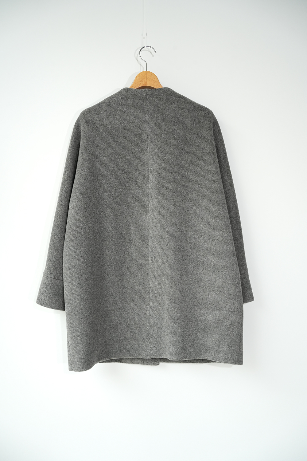 テントコートのディテールをいかしたノーカラーコート。すっきりとした首回りは巻物とも好相性、前立てはスナップボタンでスッキリ、アームホールに縫い目のない贅沢な一枚仕立て。肩幅・体型を問わず、美しくフィットする絶妙なシルエット、無数の色糸が織りなす、奥行きのあるグラデーション、カフス部分を折り返して袖丈を調整できる。こだわりぬいて作られた素材は、選び抜かれた高品質なラムウール原料を国内産地特有の美しい水を使用して一流の職人達が仕上げることで、非常に美しく上質な毛並みの表情、その見た目に反する驚くほどの軽さ、保温効果に優れた機能性を持った宝物のような素材です。各色がもつ美しさを最大限いかせるように色ごとに緻密に配列を計算し細部の作り方まで変えて作成しています。グラデーションの色糸を組み合わせて無数の色で奥行きを出した圧巻の色合い。ゆったりとしたサイズ感ですが、小柄な方にもきれいに着こなせる長さで、羽織るだけでこなれ感のあるスタイルにまとめてくれます。首元はシンプルなノーカラーデザインなので、スカーフやストールなども合わせやすいデザイン