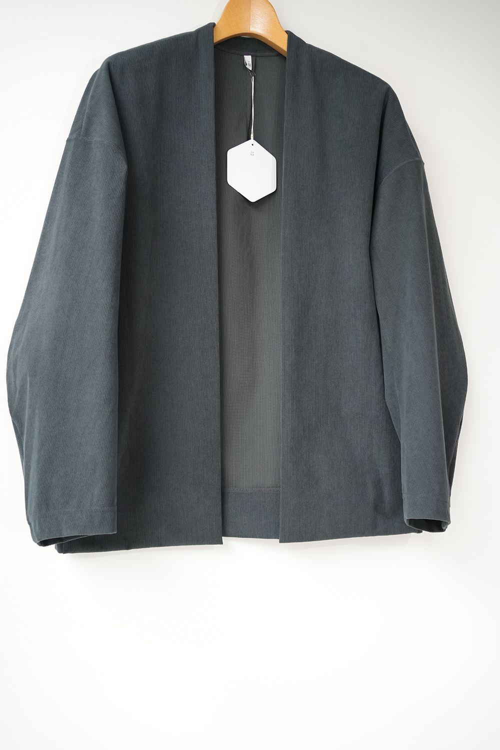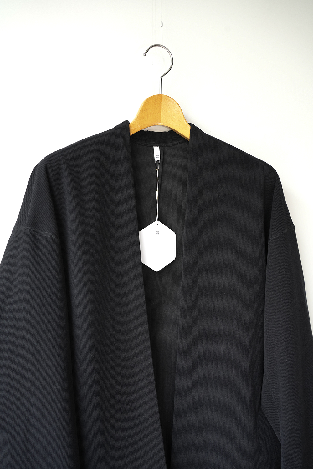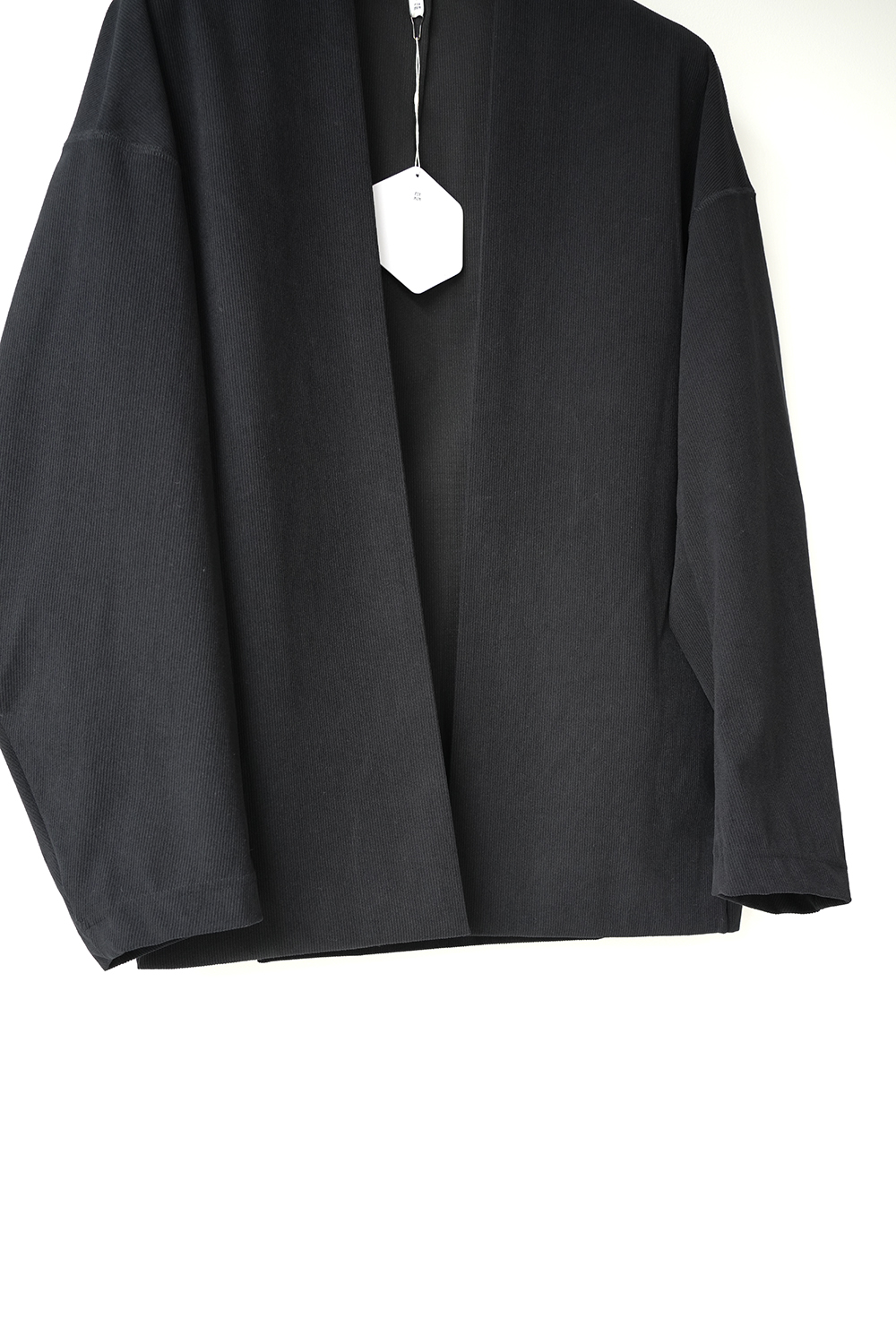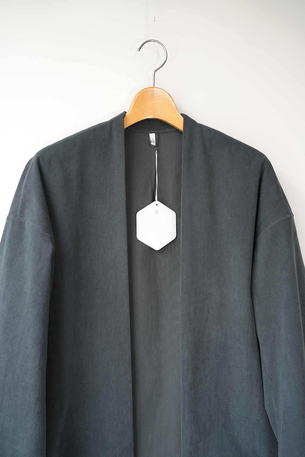 経編みでコーデュロイ表現したポリエステルニット生地。毛羽が抜けず洗濯ケアもイージー、ストレッチ性のあるなめらかな生地。ゆったりサイズ、ボタンレスのカーディガンジャケット。