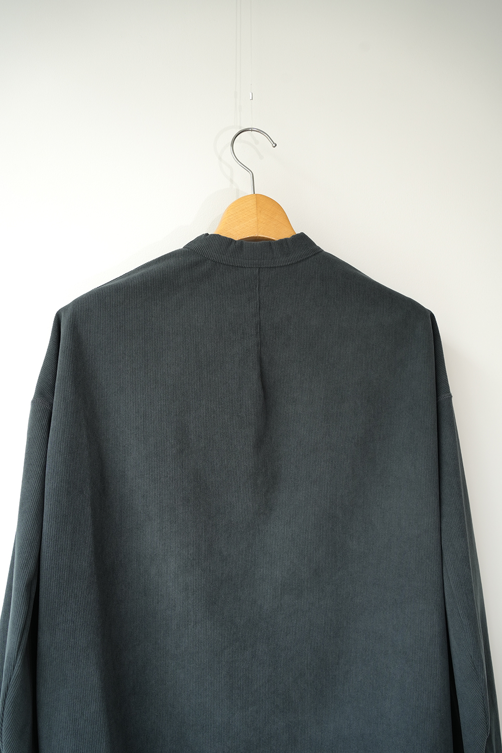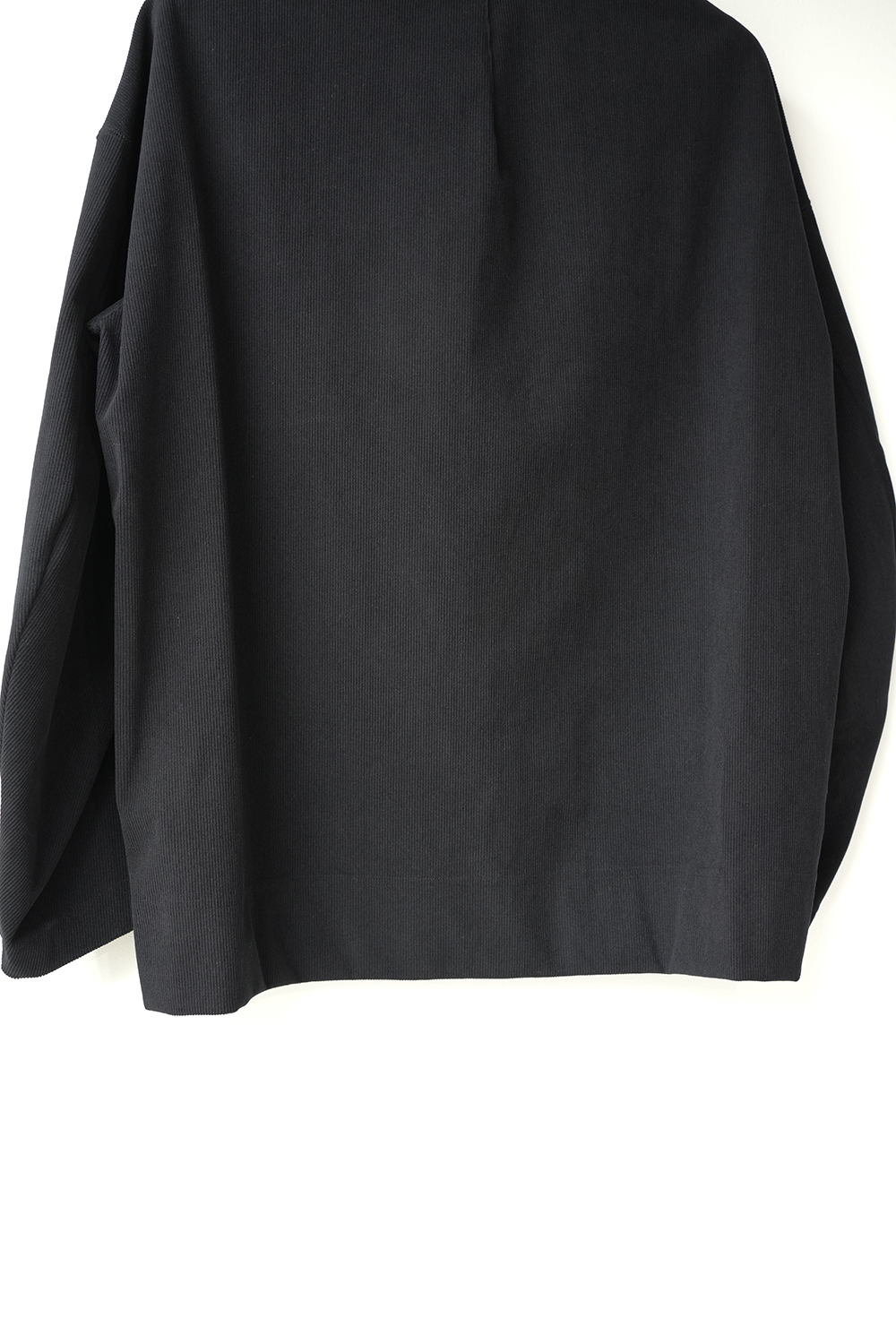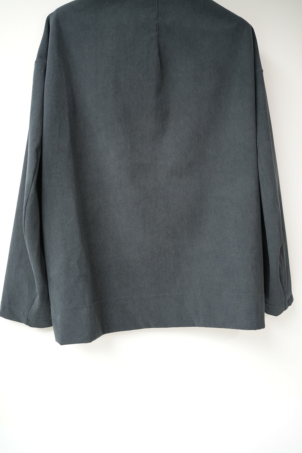 経編みでコーデュロイ表現したポリエステルニット生地。毛羽が抜けず洗濯ケアもイージー、ストレッチ性のあるなめらかな生地。ゆったりサイズ、ボタンレスのカーディガンジャケット。