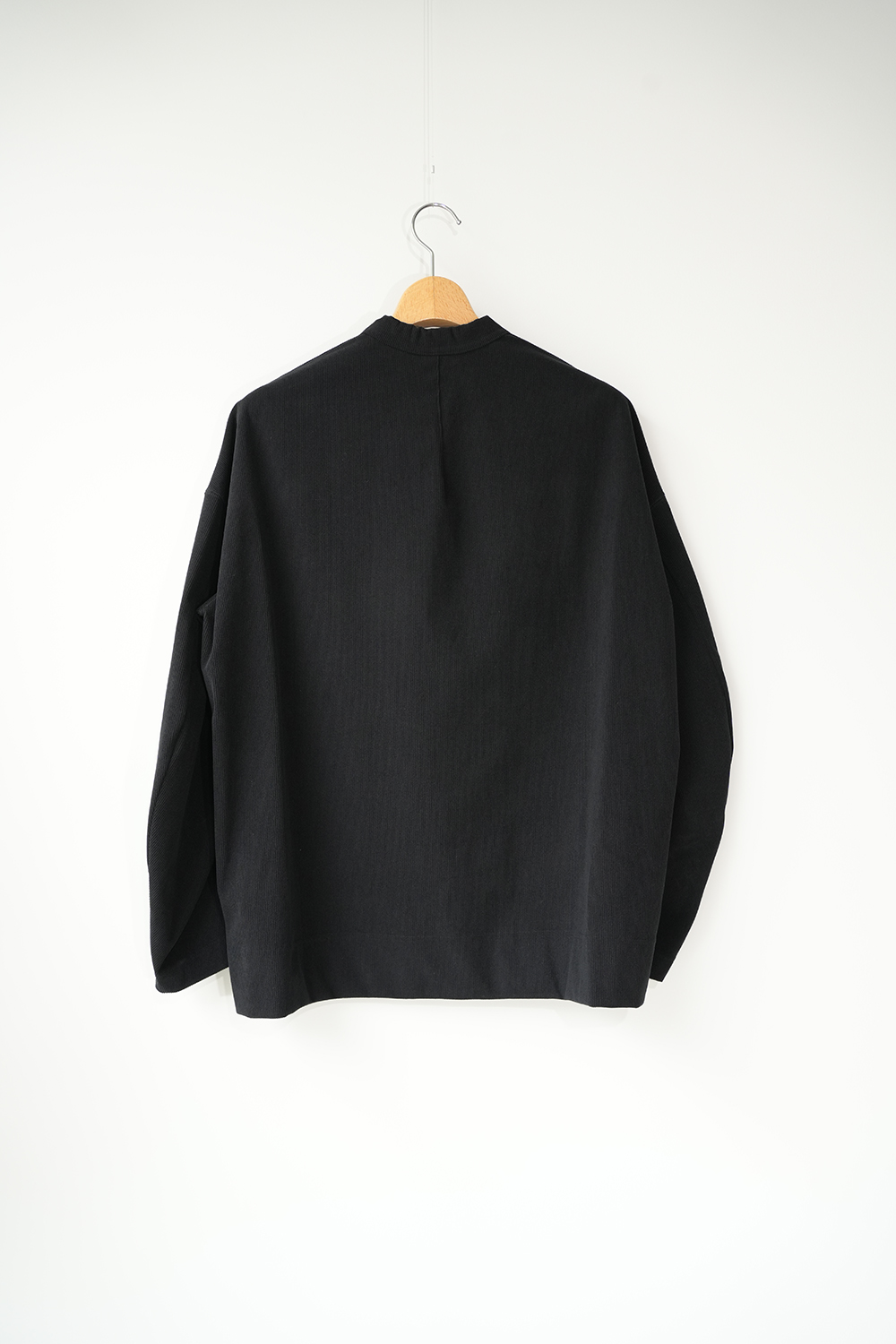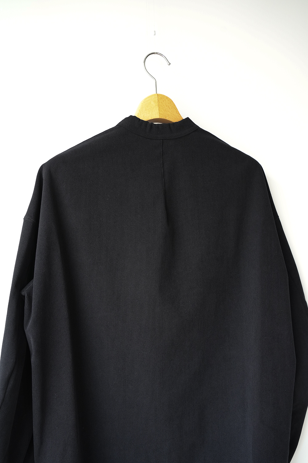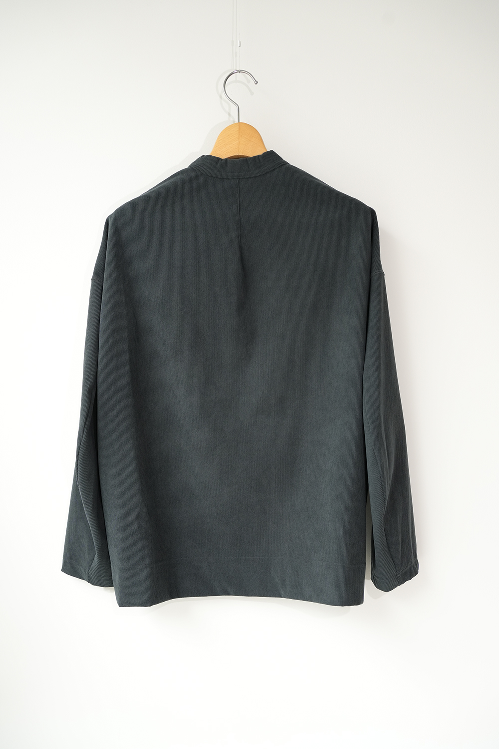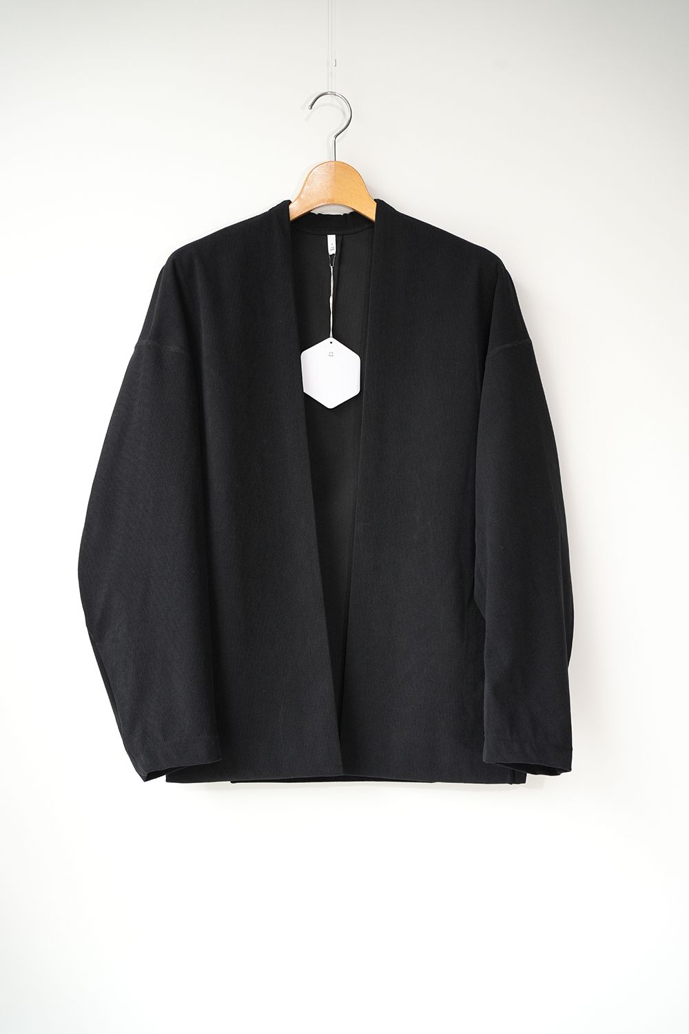 経編みでコーデュロイ表現したポリエステルニット生地。毛羽が抜けず洗濯ケアもイージー、ストレッチ性のあるなめらかな生地。ゆったりサイズ、ボタンレスのカーディガンジャケット。